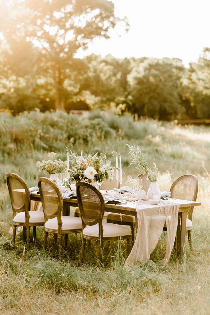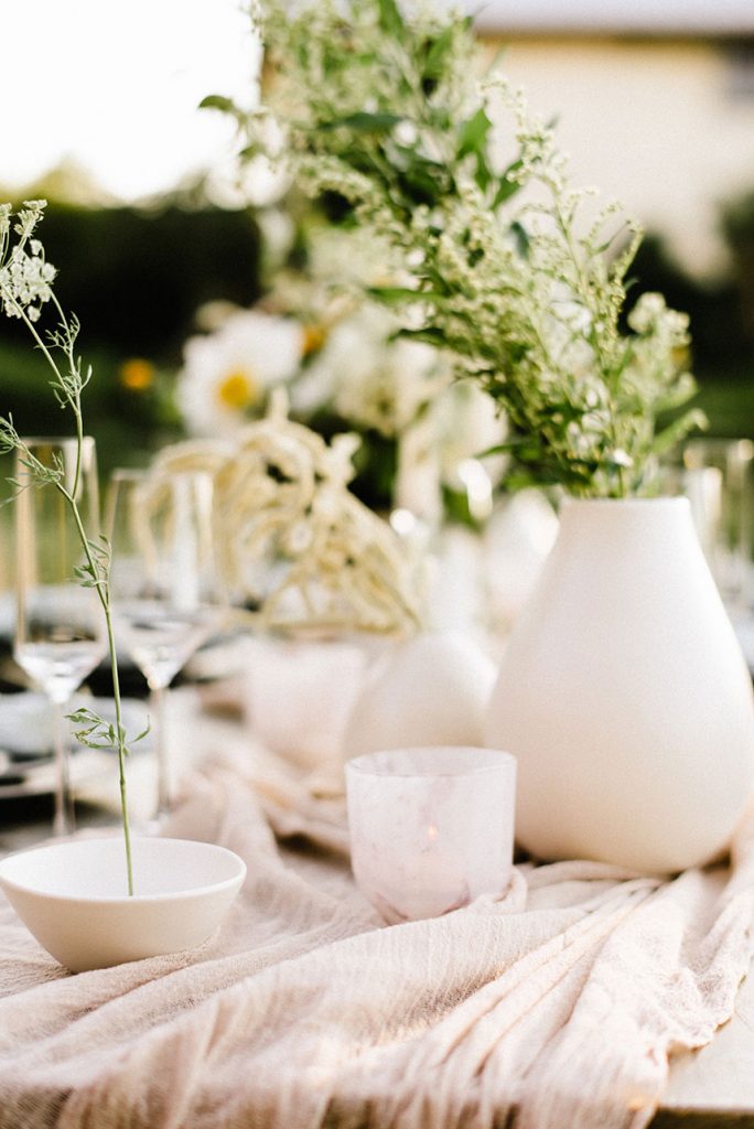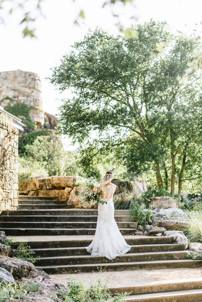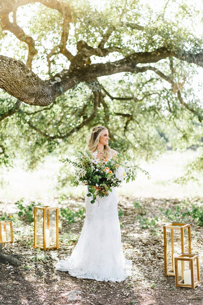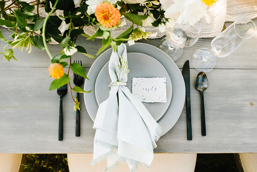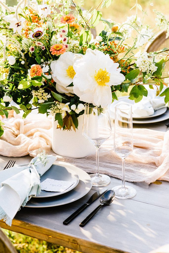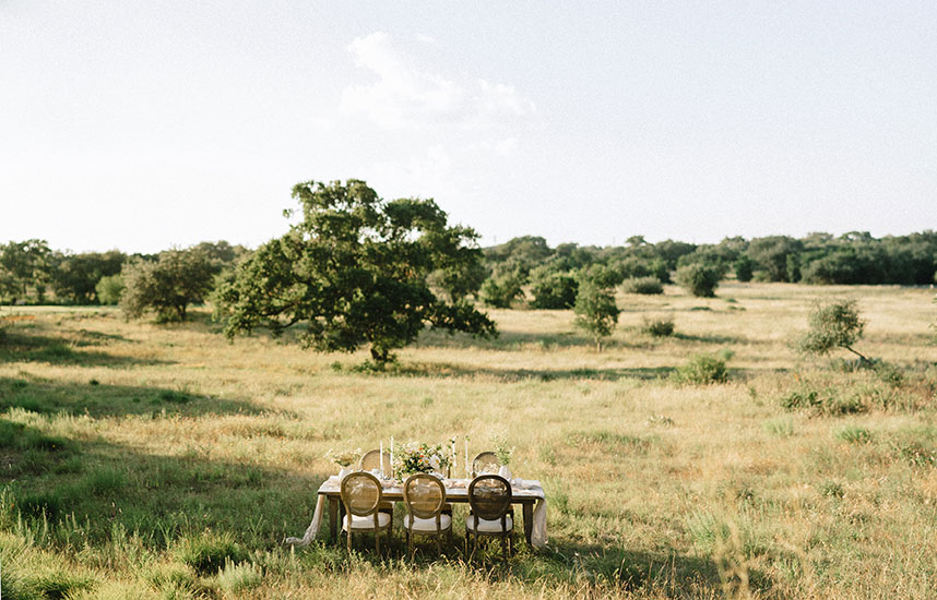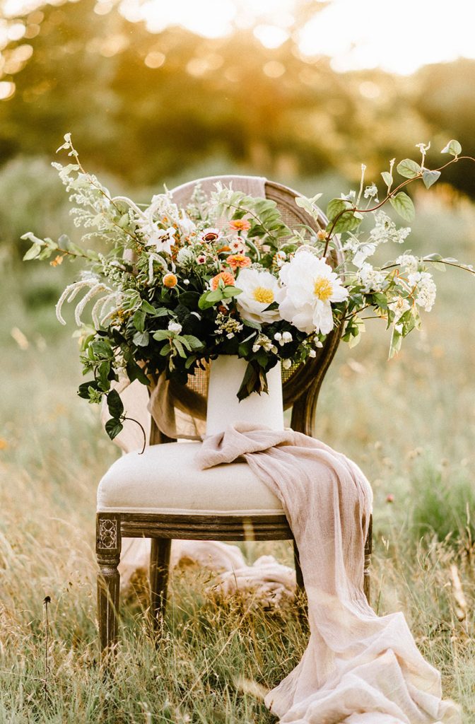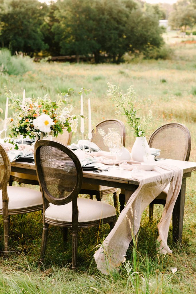 From the planner, Kate Goddard of Wild Sky Events: “ I wanted to create a modern take on a very ethereal design. The overall goal was to create a look that had very soft lines but was still bursting with texture. When I found out we were going to have the shoot at Wildflower Center, I knew I wanted to take advantage of the gorgeous property. That got me started down the design path of grasses, wildflowers and unique textures for the tablescape.”