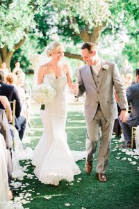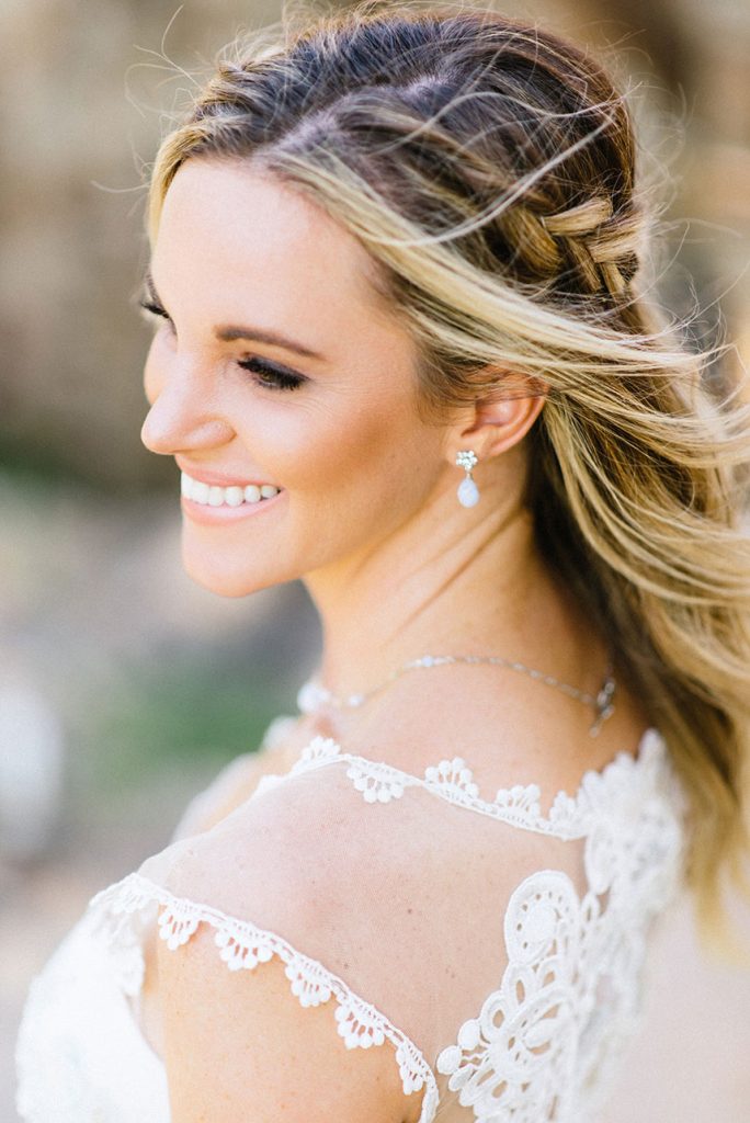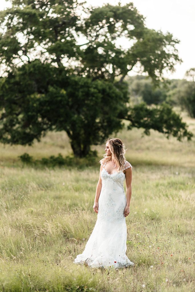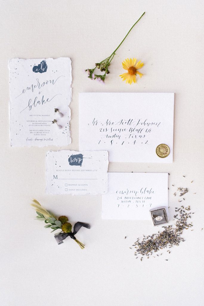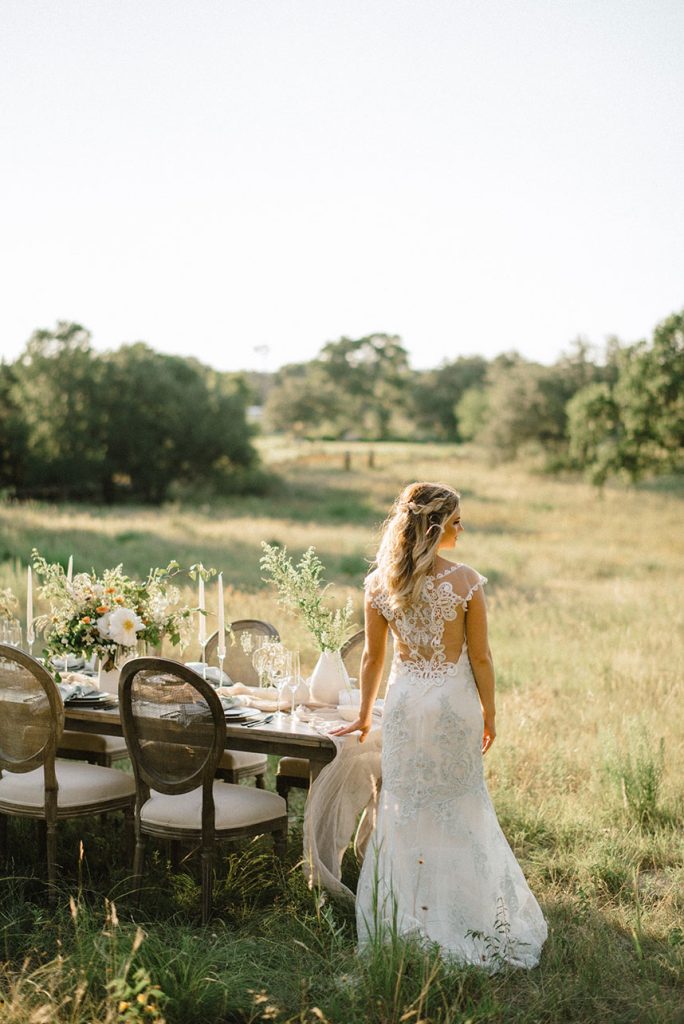 Kate Goddard of Wild Sky Events designed this ethereal setting mixed with modern touches for a contemporary and whimsical vibe at Lady Bird Johnson Wildflower Center. Marquee Event Rentals set the scene with their wood farm table and wicker-back chairs and topped the table with gorgeous glassware, flatware and china to match. The amazingly talented Averi with and Eye designed this invitation suite and hand-written calligraphy place cards set atop each place setting. Clementine Botanical Art blew us away with their non-traditional, freeform florals; we’re still swooning over this gorgeous wildflower and peony-filled bouquet and the matching boutonnieres. Our model bride looked timeless in her stunning lace sheath gown from Unbridaled, and My Style Team polished off her look with beautiful a smokey eye and a braided hairstyle. Thanks to Sarah Goss Photography for capturing all these lovely details. Be sure to check out the behind the scenes footage from Honey Gem Creative below to see how the shoot was brought to life!