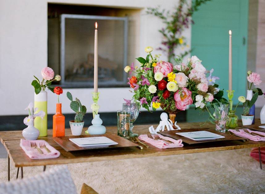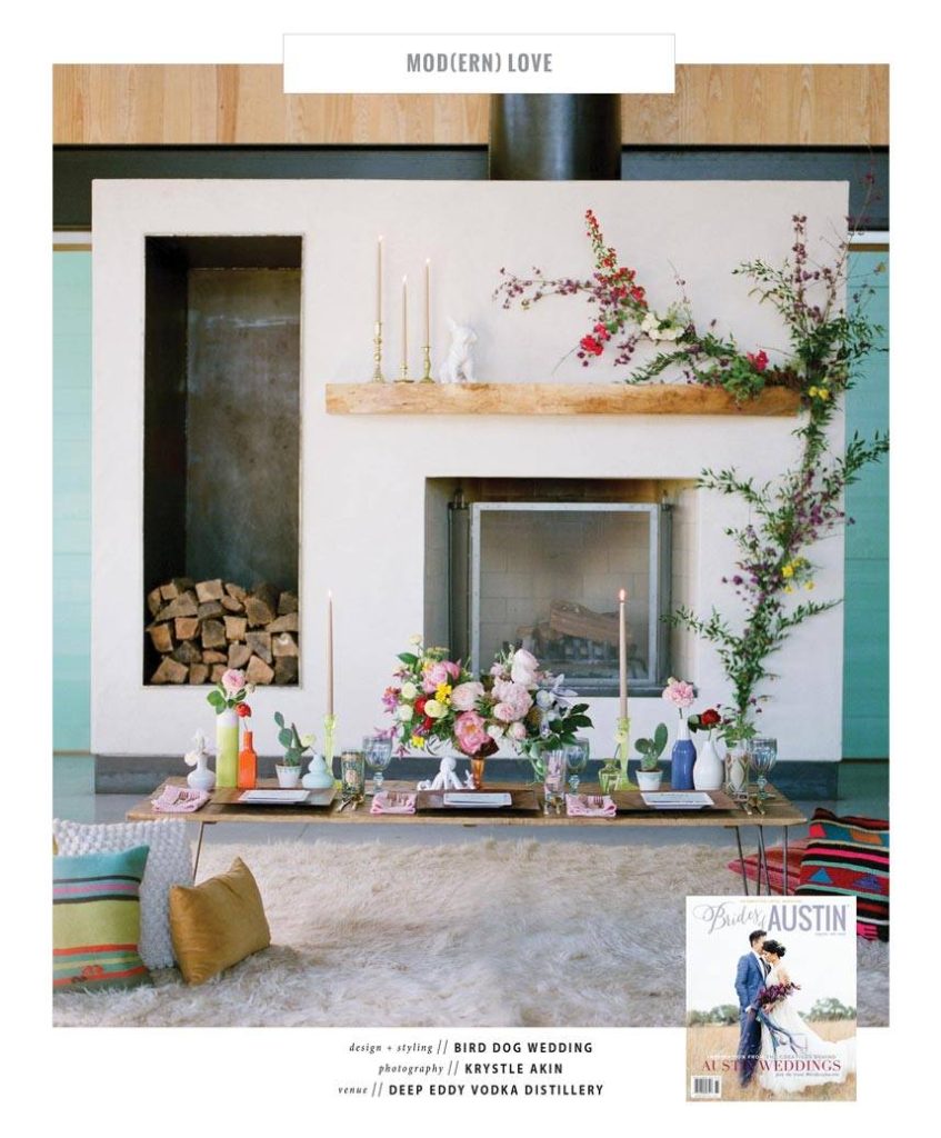 Be inspired by decades passed while incorporating this contemporary design from Bird Dog Wedding! This fun and playful tabletop set at Deep Eddy Vodka Distillery was perfectly pulled together with fresh pops of color and playful accents. Krystle Akin captured each unique detail from the eclectic lounge setting from Loot Vintage Rentals to the fun florals from Margot Blair Floral. The beautiful bride looked radiant in a gown from Blush Bridal Lounge with hair by My Style Team and makeup by Cren de la Cren, Beauty by Katherine Crenshaw. Coco Paloma Desserts crafted the prettiest little two-tiered cake and Mokse Design created a lovely and modern stationery suite! Turn to page 185 of the current Spring/Summer issue to see this playful setting in print! Or head over to In This Issue to see even more!