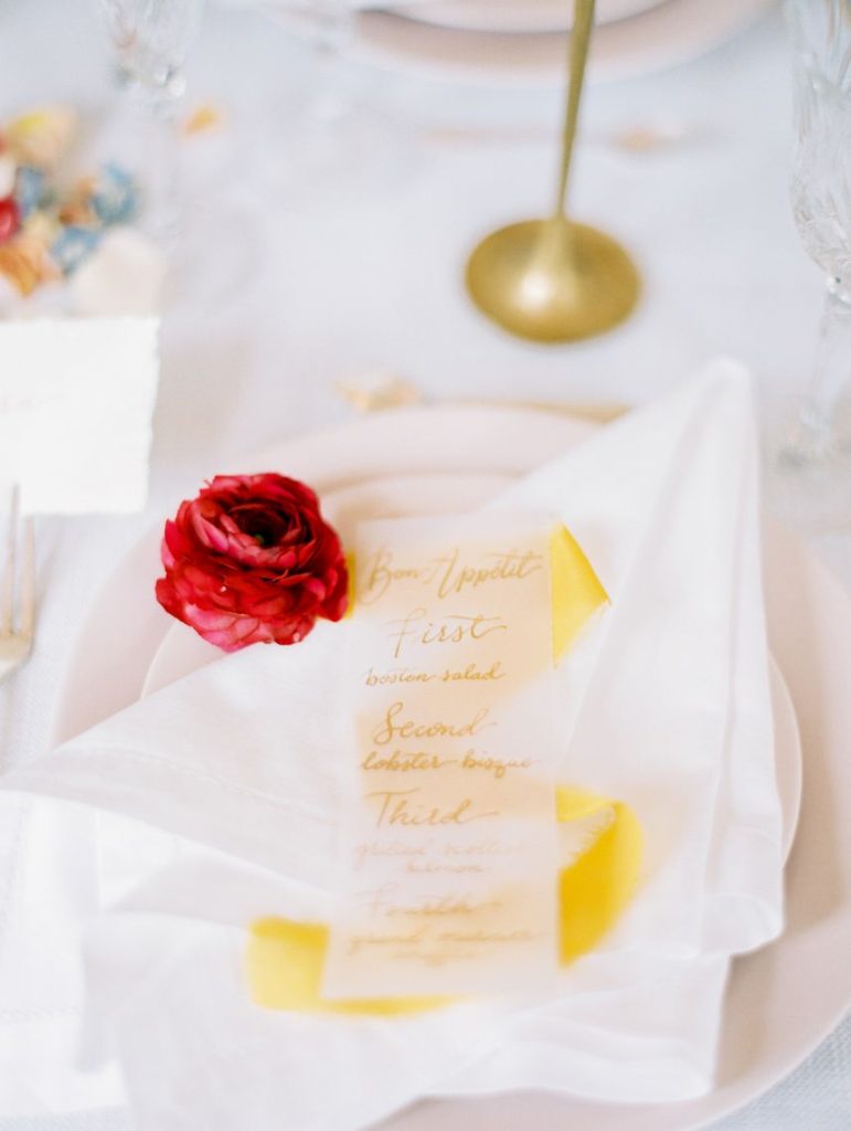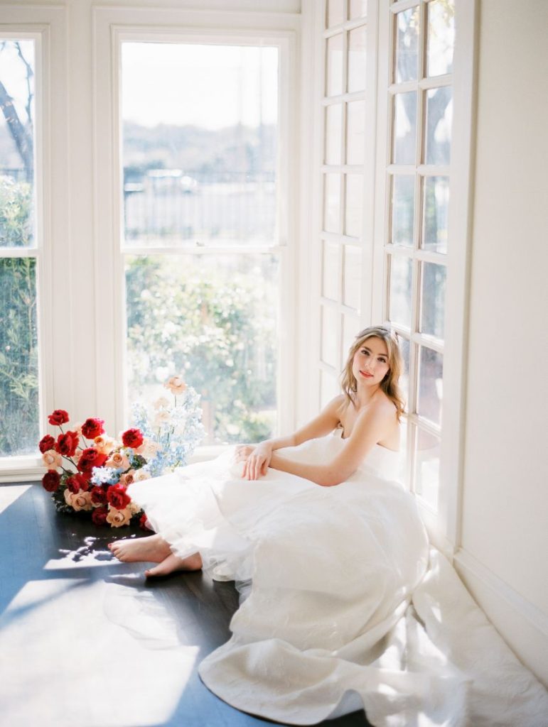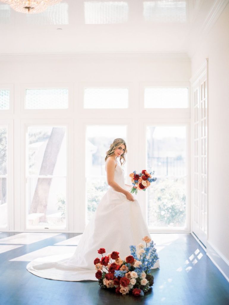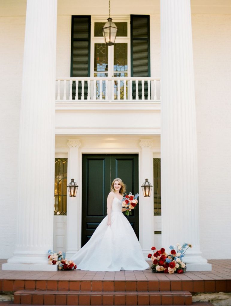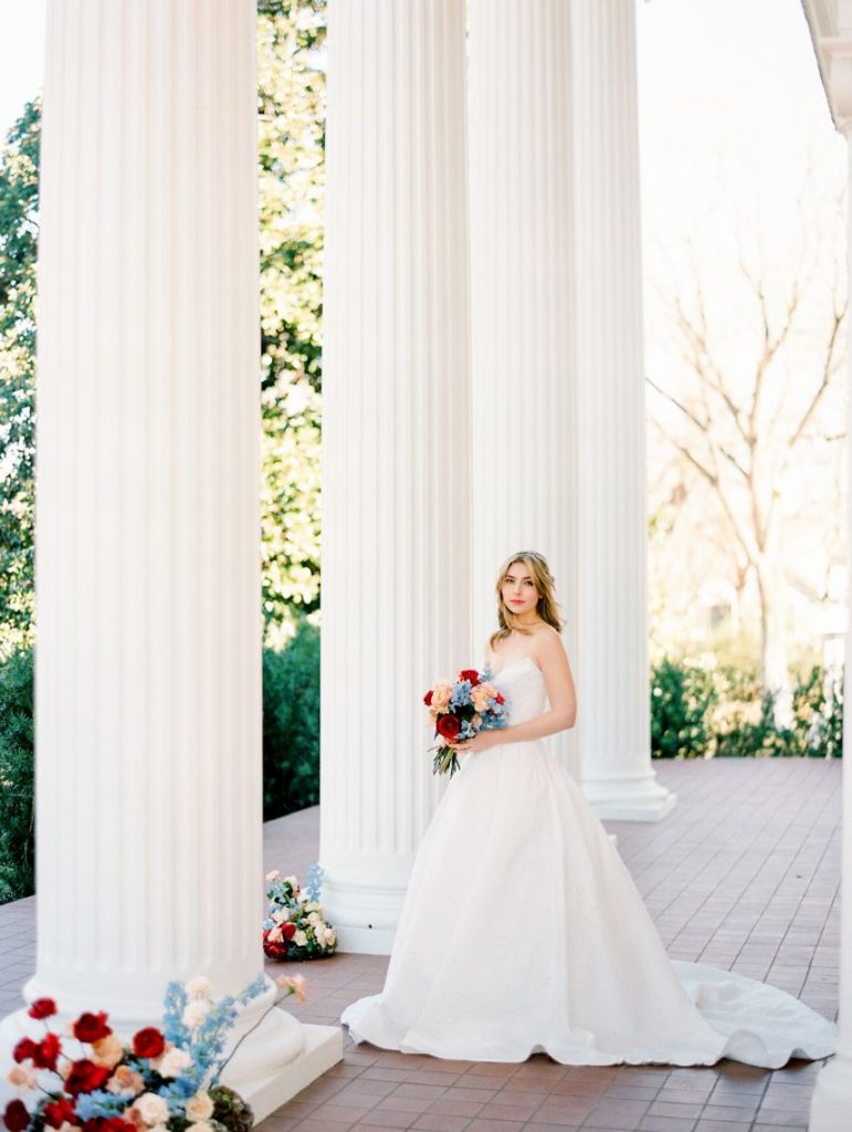 Taking cues from the Georgian era but updated with a modern twist, Lovely Day Events curated this breathtaking scene depicting a modern romance in a historic mansion – The Woodbine Mansion, that is! This Round Rock gem’s stately rooms and abundant natural light highlight the grandiose tablescape featuring furniture and linens from Premiere Events, as well as accent pieces from Loot Rentals. Perhaps the element we love most from this inspiring scene? All the color! Planner Kierstin Schupack found a way to use bold, primary colors in such a sophisticated, understated and classic way, especially through Bricolage’s amazing floral arrangements! Kristin La Voie Photography matched the sophisticated style with her imagery and captured a few unique shots of the bride, wearing a Julian Gold gown complemented by a red lip and loosely pulled back hairstyle from Makeup ATX. Grey Meets Gold supplied the orgainic stationery items, and rather than a typical wedding cake, the planner opted for daintier desserts from Sweet Treets Bakery. Wouldn’t you love to have a seat at this table? We sure would! Cheers!