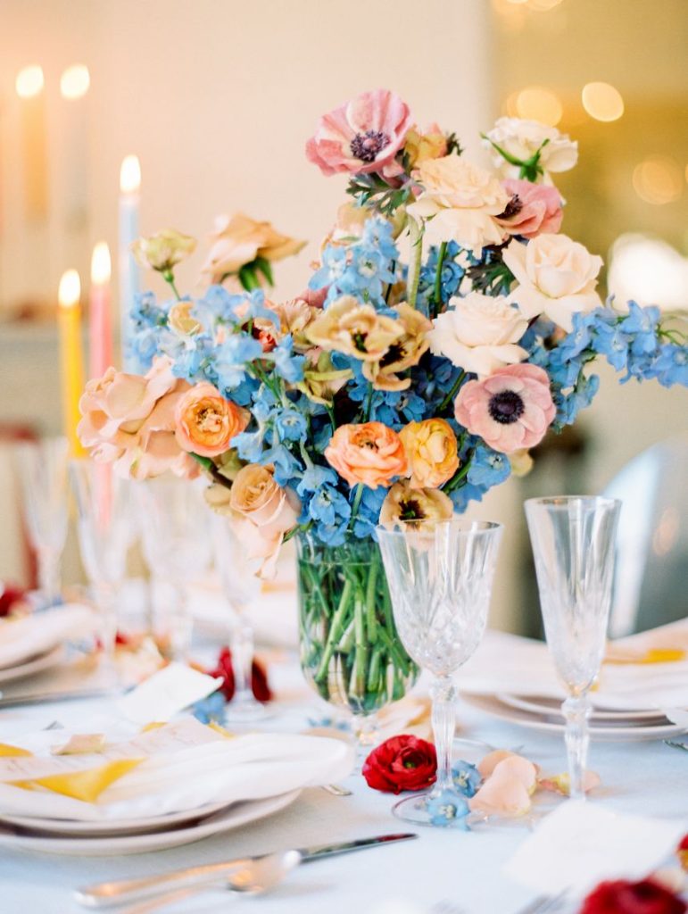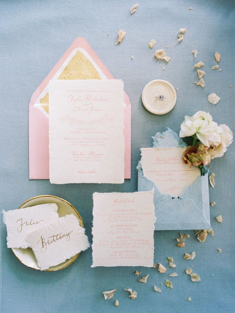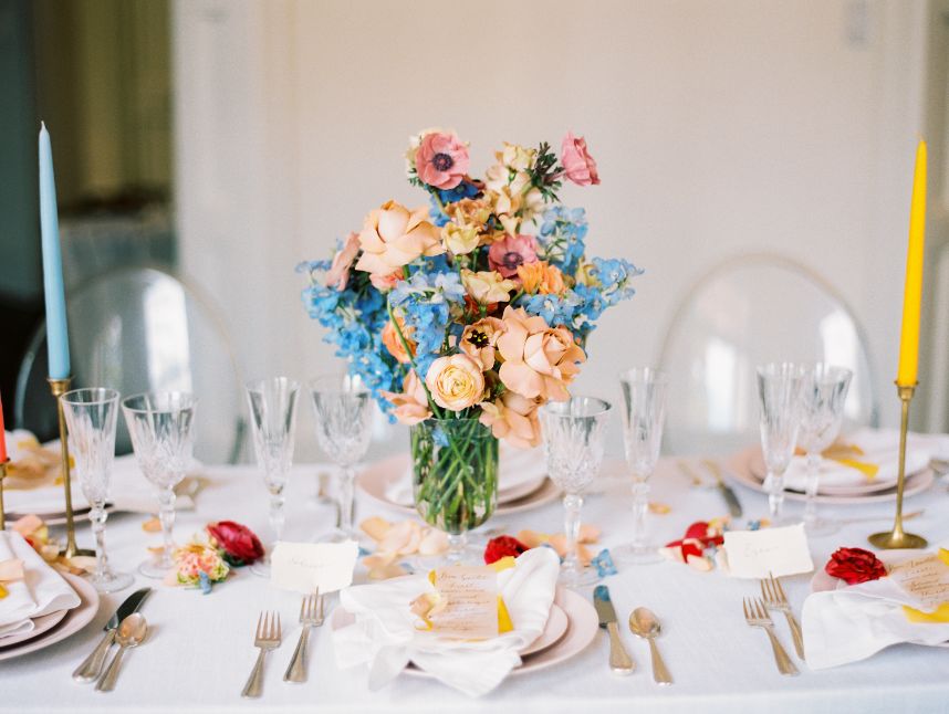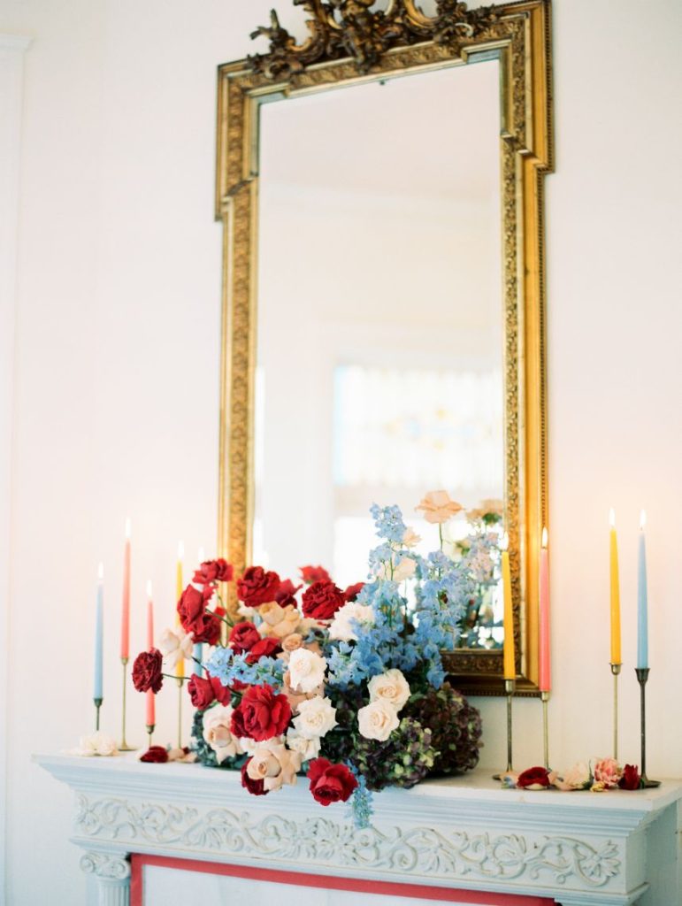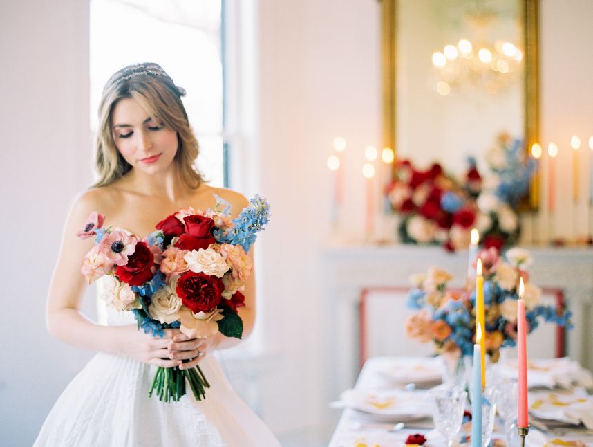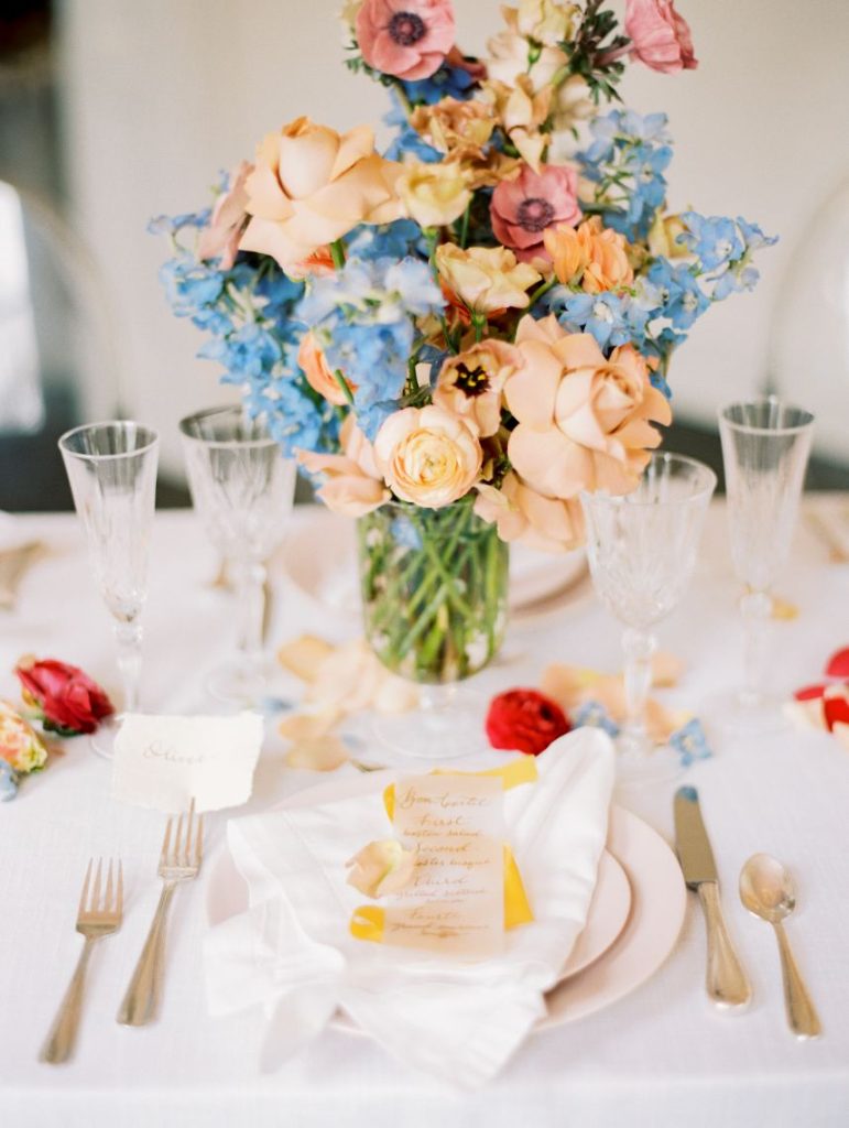 Taking cues from the Georgian era but updated with a modern twist, Lovely Day Events curated this breathtaking scene depicting a modern romance in a historic mansion – The Woodbine Mansion, that is! This Round Rock gem’s stately rooms and abundant natural light highlight the grandiose tablescape featuring furniture and linens from Premiere Events, as well as accent pieces from Loot Rentals. Perhaps the element we love most from this inspiring scene? All the color! Planner Kierstin Schupack found a way to use bold, primary colors in such a sophisticated, understated and classic way, especially through Bricolage’s amazing floral arrangements! Kristin La Voie Photography matched the sophisticated style with her imagery and captured a few unique shots of the bride, wearing a Julian Gold gown complemented by a red lip and loosely pulled back hairstyle from Makeup ATX. Grey Meets Gold supplied the orgainic stationery items, and rather than a typical wedding cake, the planner opted for daintier desserts from Sweet Treets Bakery. Wouldn’t you love to have a seat at this table? We sure would! Cheers!