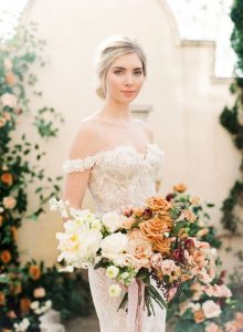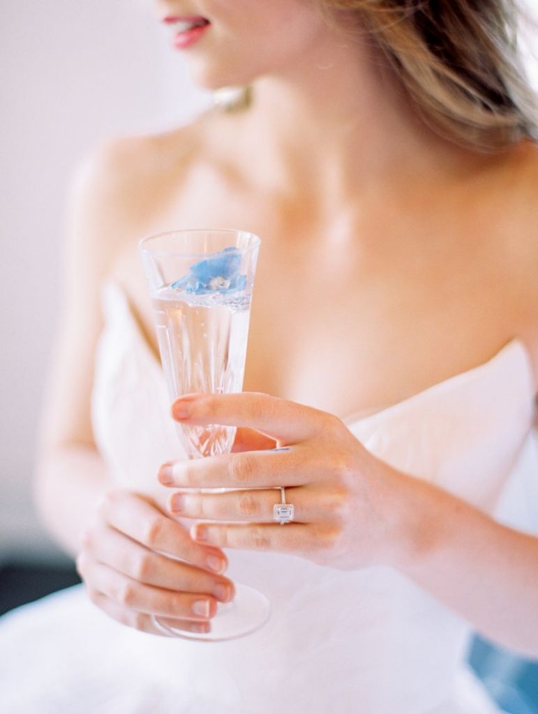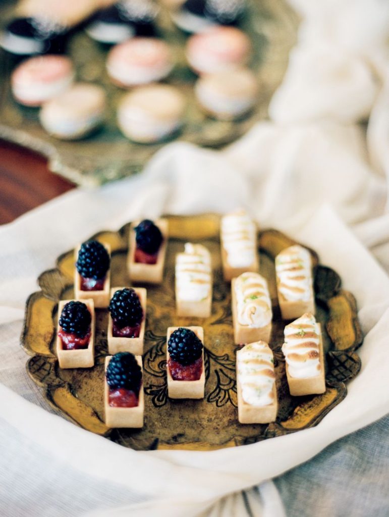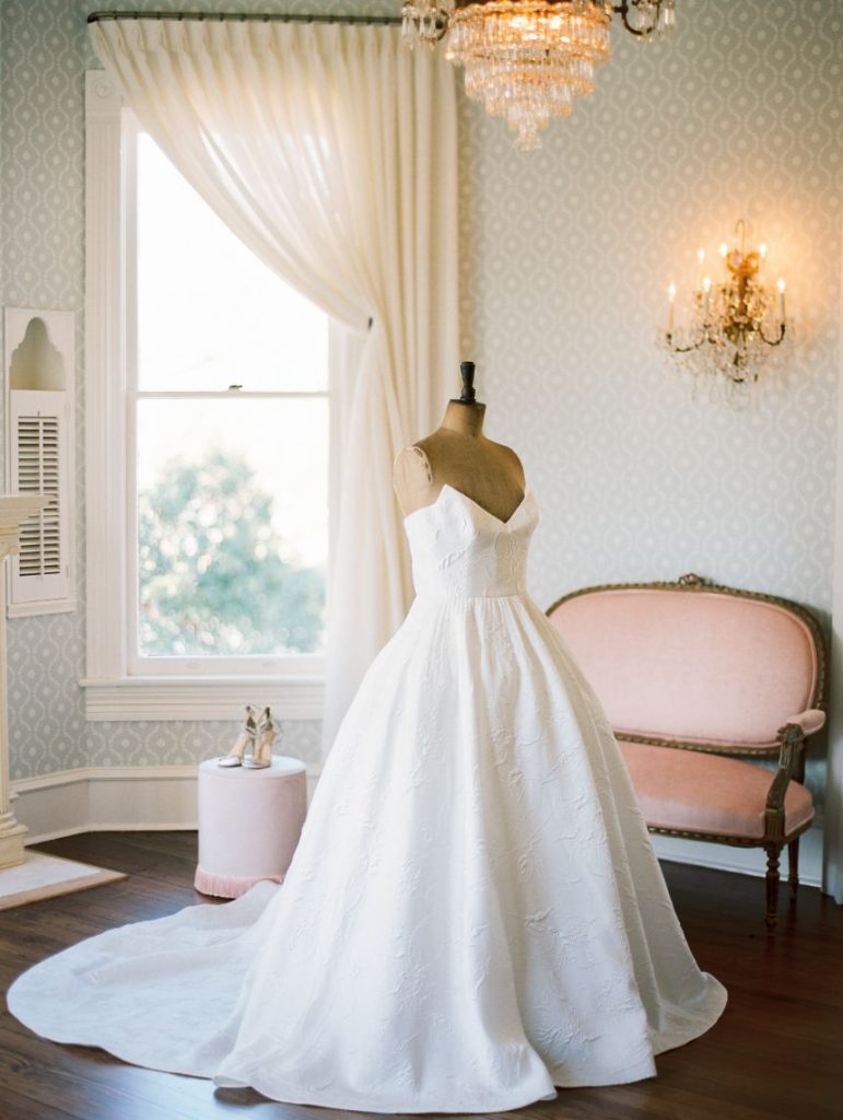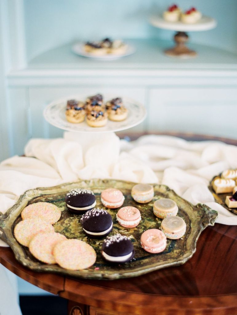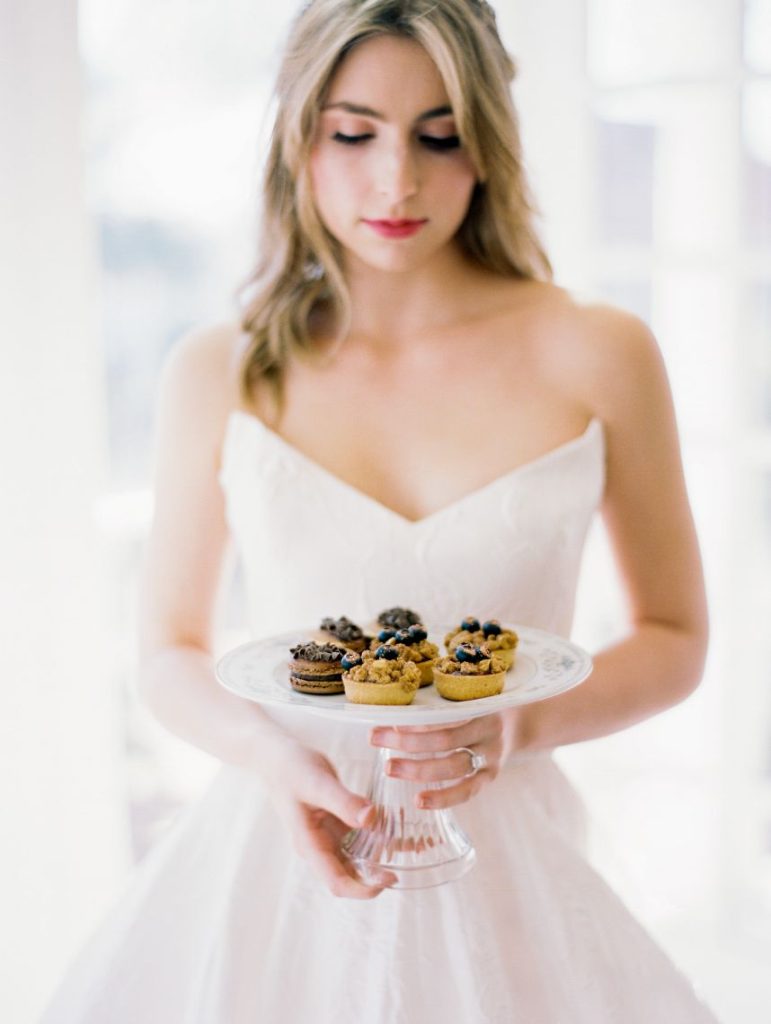 From the planner, Kierstin Schupack of Lovely Day Events: “I have always loved the style and colors from the Georgian era but many of the design elements from that period can feel overwhelming to our modern senses. The inspiration for this shoot came from wanting to blend elements from the Georgian era with a modern update. The florals were inspired by 18th century paintings as well as the place settings, stationery, desserts and colors. I updated the look with acrylic ghost chairs and a gorgeous modern gown.”