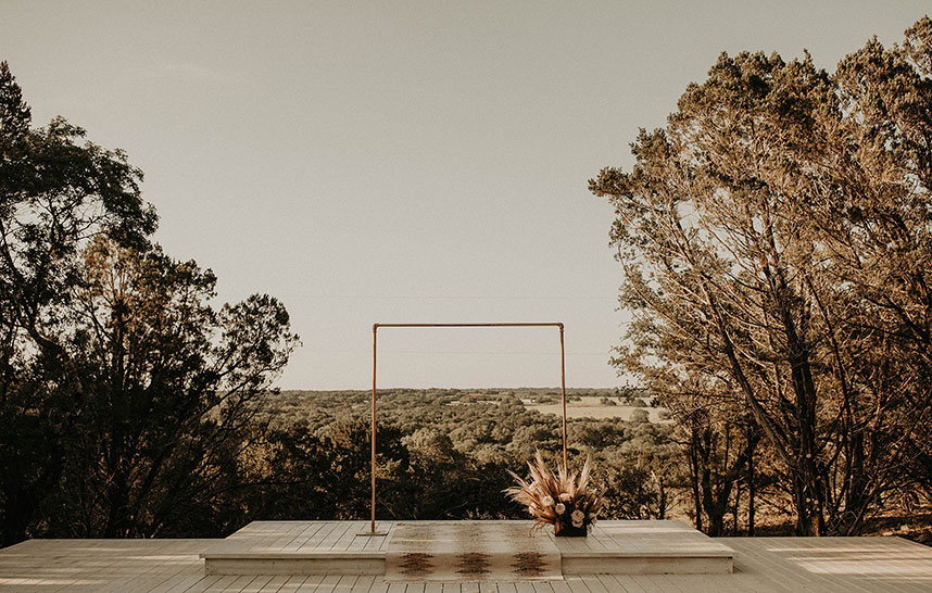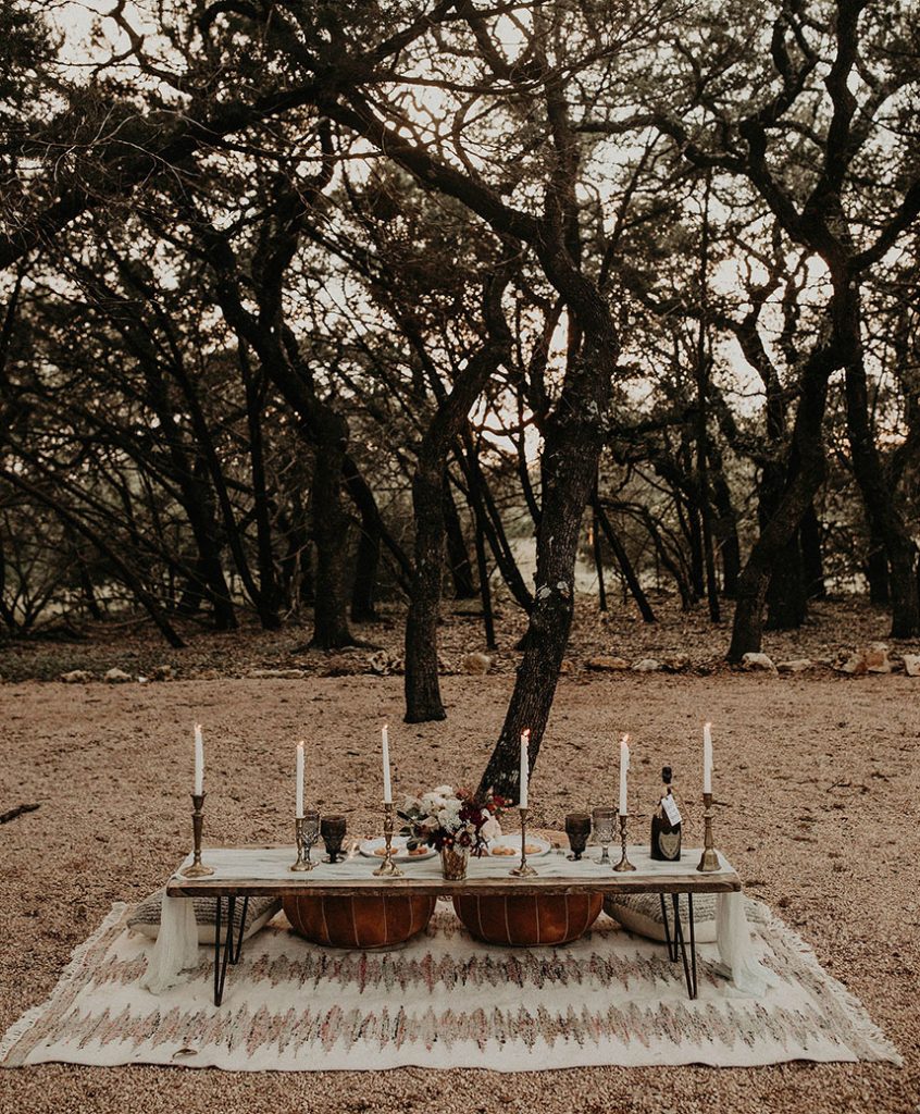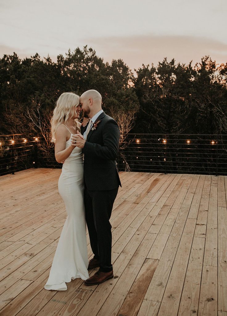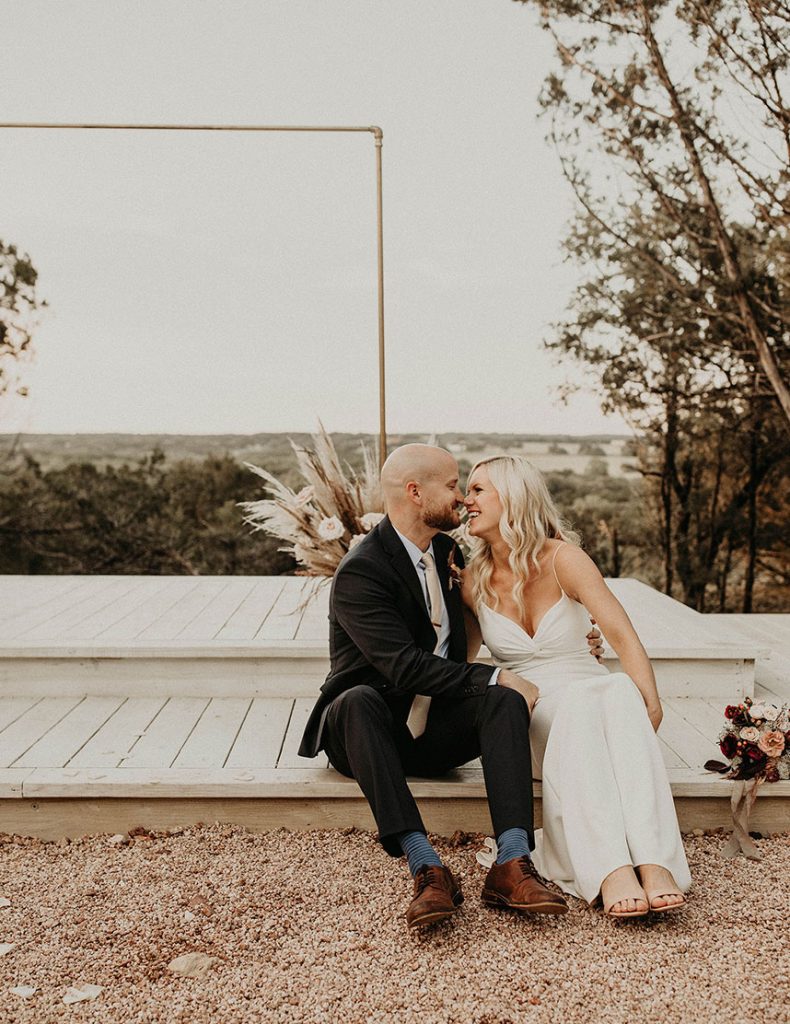 From the bride: “We eloped to Dripping Springs, Texas in the Hill Country to a rustic glamping retreat called Lucky Arrow Retreat. We had a styled elopement which included only us, our planner, pastor and photographer. We had a ceremony overlooking the Hill Country, dinner in the trees and a night to remember! Absolutely the best day.”