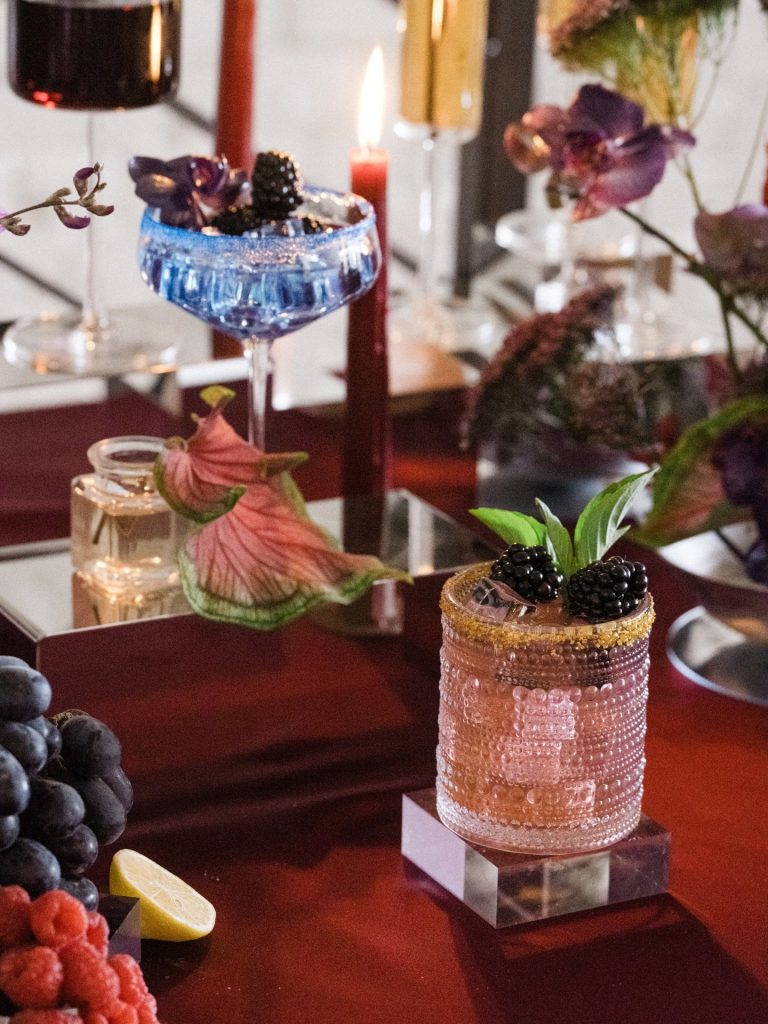 Mirrored aisles, deep wine and plum-toned blooms, acrylic chairs, and modern design elements set the scene — with those rich hues carried beautifully into the tablescapes and even the cake for a cohesive, dramatic look.