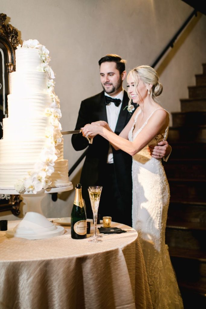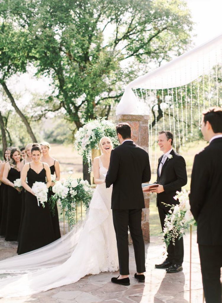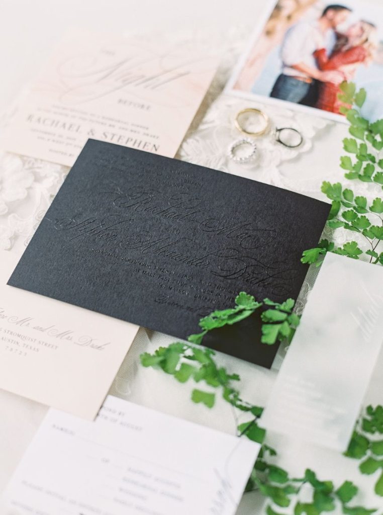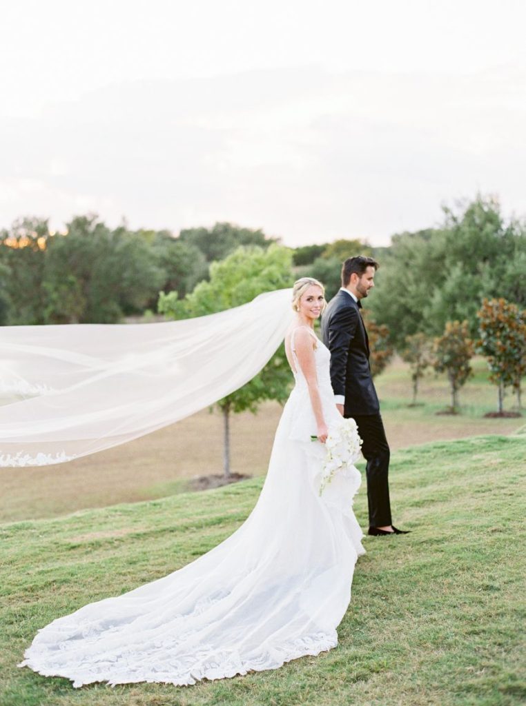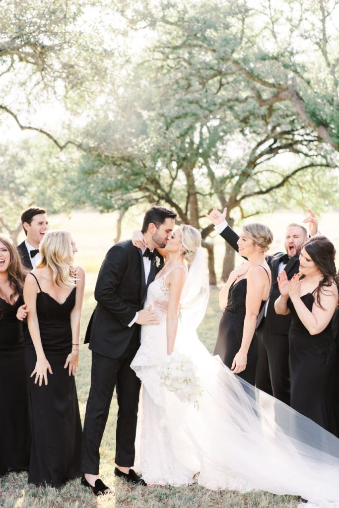 Rachael and Stephen knew just how to knock their wedding guests’ socks off on their big day; with a choreographed dance to a classic hit! Keep reading for the sweet deets. Their gorgeous wedding full of modern romance was held at Ma Maison, nestled just outside of Austin in a Provence-like region of Hill Country that reminisces on that of southern France. Pairing the far-off feel of the venue with the rustic interior and modern black decor from Marquee Event Rentals – Austin creates a perfect recipe for the most picturesque wedding! Rachael looks absolutely radiant in a slimmed-down ballgown from Serendipity Bridal featuring a deep V-neck as well as a custom royal-length veil that was practically made for her! Collaborating with Crave Catering for bartending and catering services, the couple’s cocktail menu featured cute sketches of their dogs, which each signature cocktail was named after! So cute! Rachael and Stephen also opted for two cakes from Sweet Treets Bakery – a stunning six-tiered white wedding cake trimmed with fresh floral as well as a towering groom’s cake modeled after the University of Texas Tower, both bride and groom’s alma mater. From the big, classic blooms accenting the aisle to the elevated arrangements above gilded tablescapes, Flora Fetish creates fabulous floral design for any area of your venue! Though there were so many stunning elements in this big day, the couple says their first dance was one of the things they were most excited for. “We wanted to do something fun and thought what better song to dance to on September 21st than the song ‘September’ by Earth, Wind & Fire!” Rachael said. “We both enjoy dancing so we worked with a dance instructor to choreograph a full Cha-Cha routine. Incorporating more advanced spins and footwork was fun to learn and was a great crowd-pleaser!” This crowd definitely looks pleased and we wish we could have had a front-row seat to watch these love birds dance their wedding night away. With the entire elegant affair captured by Mint Photography, it’s impossible not to fall in love with these dreamy wedding scenes. Keep reading for a note from the bride about her favorite wedding vendor! Cheers to Rachael and Stephen!
