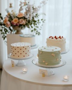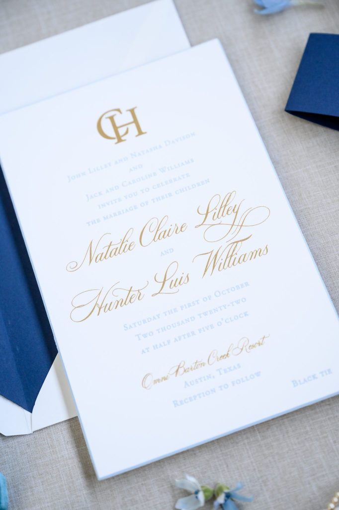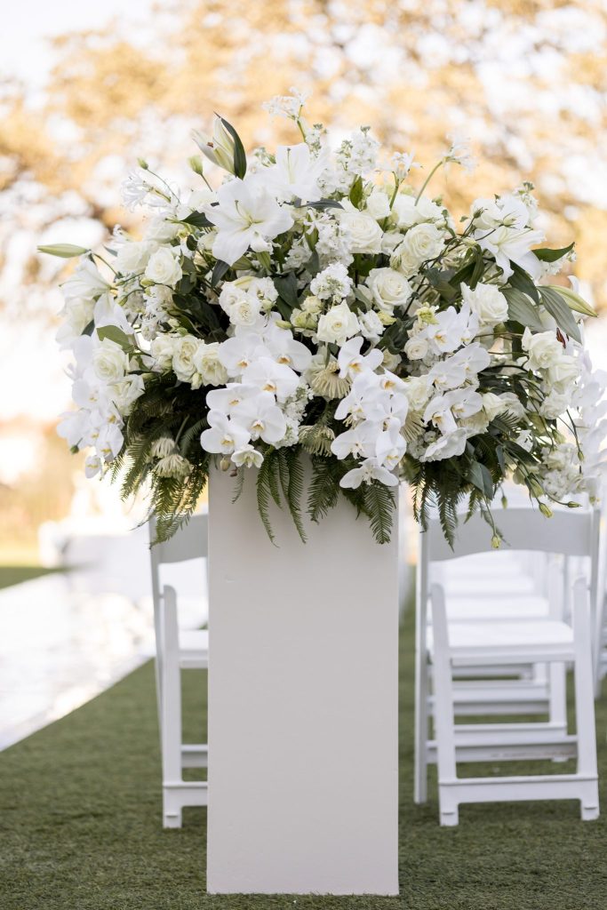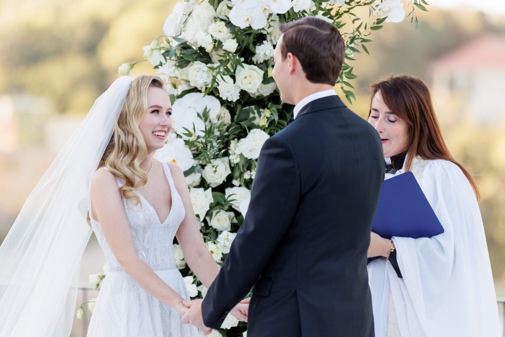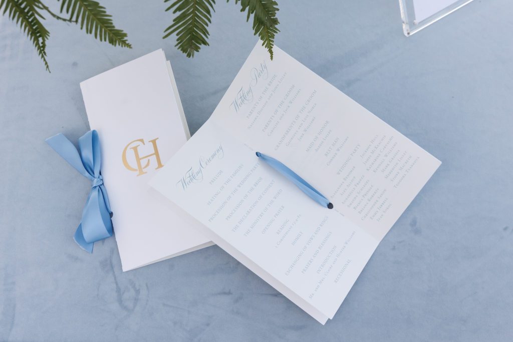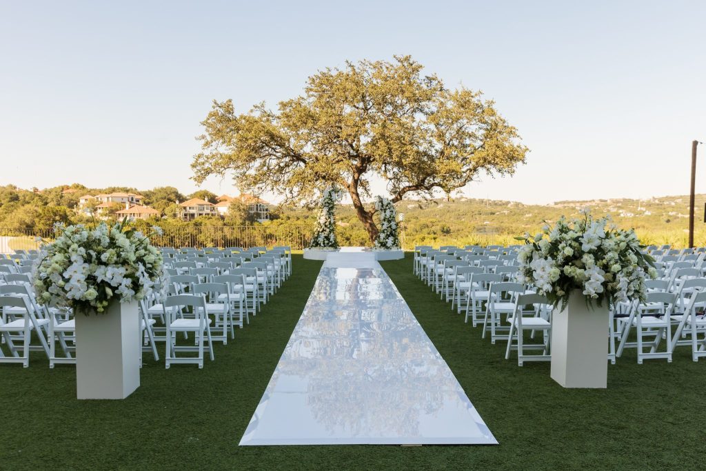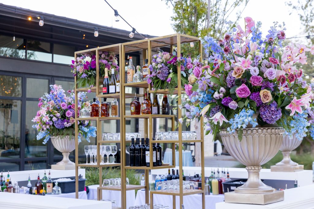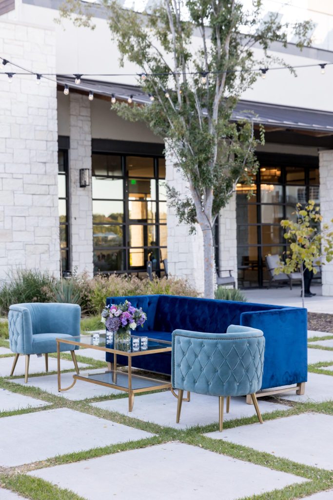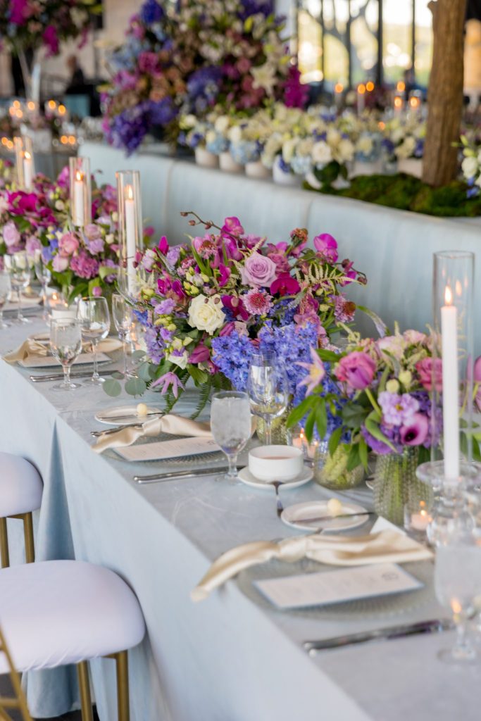 Claire and Hunter’s enchanting nighttime garden wedding featured a unique color palette of icy purples and deep blues, which perfectly captured the coastal charm desired by the Californian couple. The evening was enriched by a range of lavender, periwinkle, violet, and indigo hues, while cozy outdoor lounge spaces with tufted couches and a fireplace added to the ambiance.