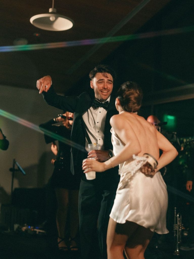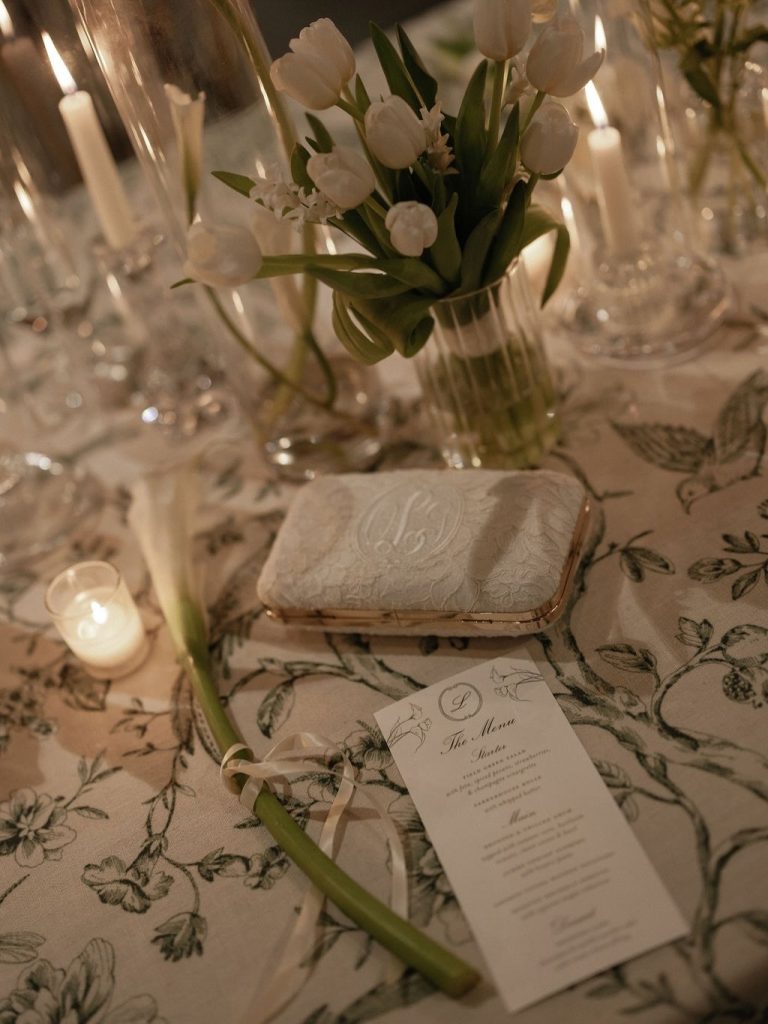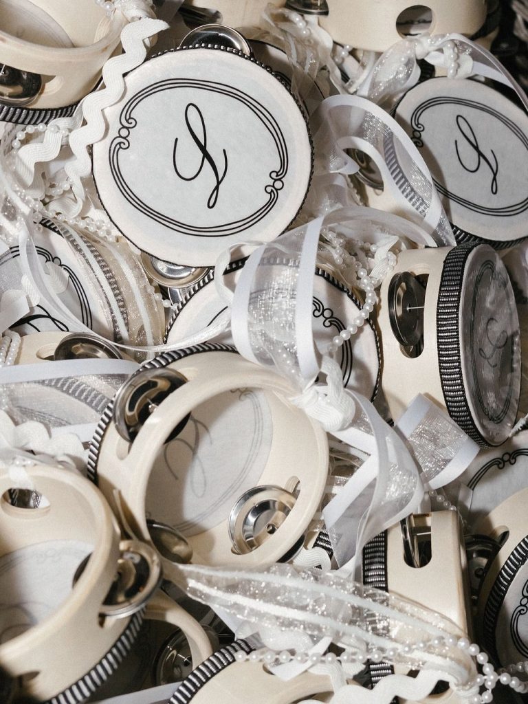 They kicked off the party with an unforgettable Second Line parade from the ceremony to the reception. Details we loved: patterned green and cream linens, glowy candlelight, and personalized monogrammed mini tambourines for the dance floor! 🕊️