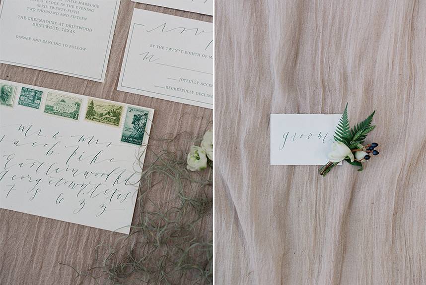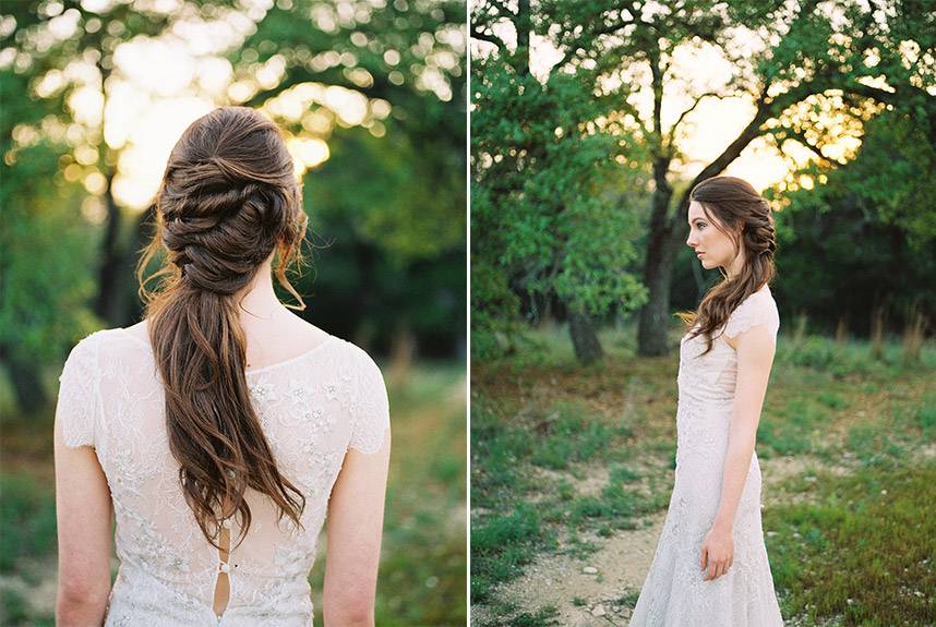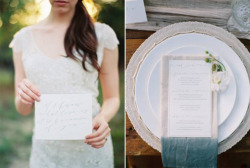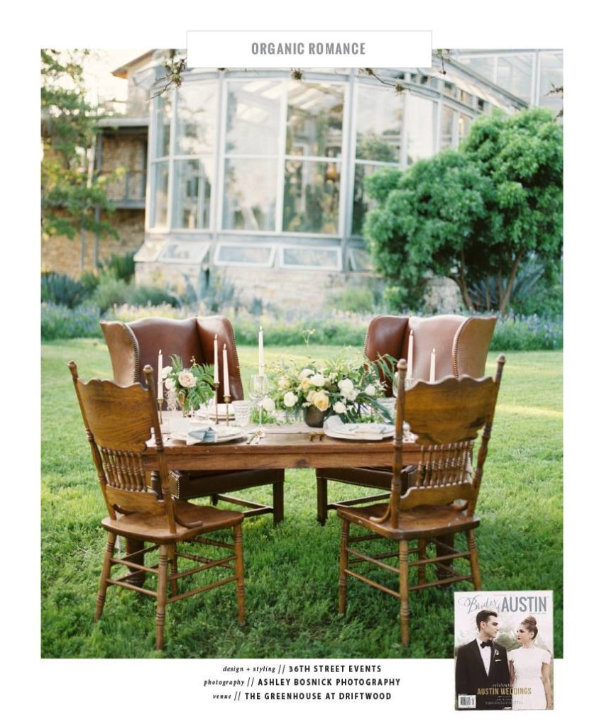 By blending earthy tones and elegant accents, the team of 36th Street Events created this romantic and organic tabletop design at The Greenhouse at Driftwood. Beautifully captured by Austin wedding photographer Ashley Bosnick Photography, Clementine Botanical Art’s soft and airy florals are perfect for the bride who loves natural elegance. We seriously love all the little details! From the romantic hand lettered invites and menus from Wondrous Whimsy to the cake’s perfectly organic accents by Sweet Treets Bakery, it all looks stunning! Loot Vintage Rentals’ rustic seating, gold accented place settings and candles perfectly finish off the tablescape. Brides who want to feel simply elegant must try on this delicately beaded gown from Julian Gold Bridal. The bridal look is polished off with a gorgeous loose updo by Adore Makeup Boutique and Salon and lovely natural makeup by Cren de la Cren, Beauty by Katherine Crenshaw. Pick up the inaugural issue of Brides of Austin and flip to page 107 to see more from this beautiful shoot or head over to In This Issue online!