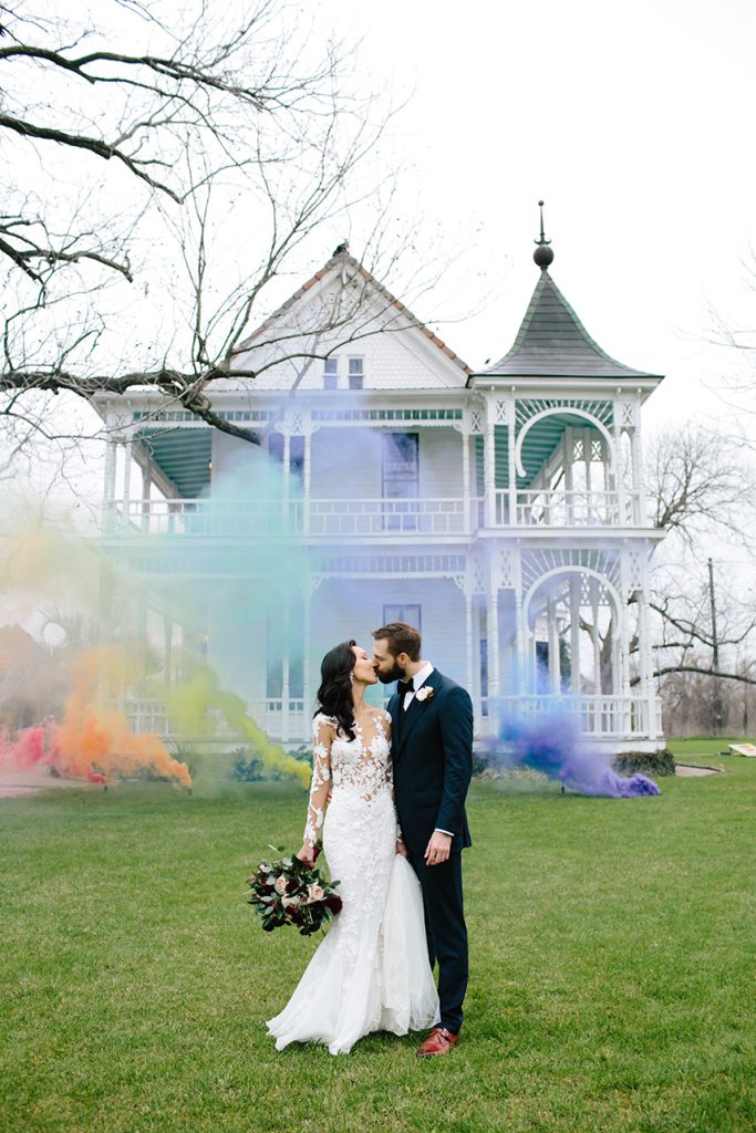 Drs. Liqiao Ma and Daniel Walk had the most gorgeous organic wedding florals by Bouquets of Austin at their romantic reception at Barr Mansion, Ballroom & Farmstead. Melissa Glynn Photography captured all the lovely details like the perfect place settings and cascading greenery installations throughout the rustic Texas venue – not to mention the love between these amazing doctors! See all the prettiness below, including their incredible smoke bomb portraits on the estate’s lawn! Cheers!