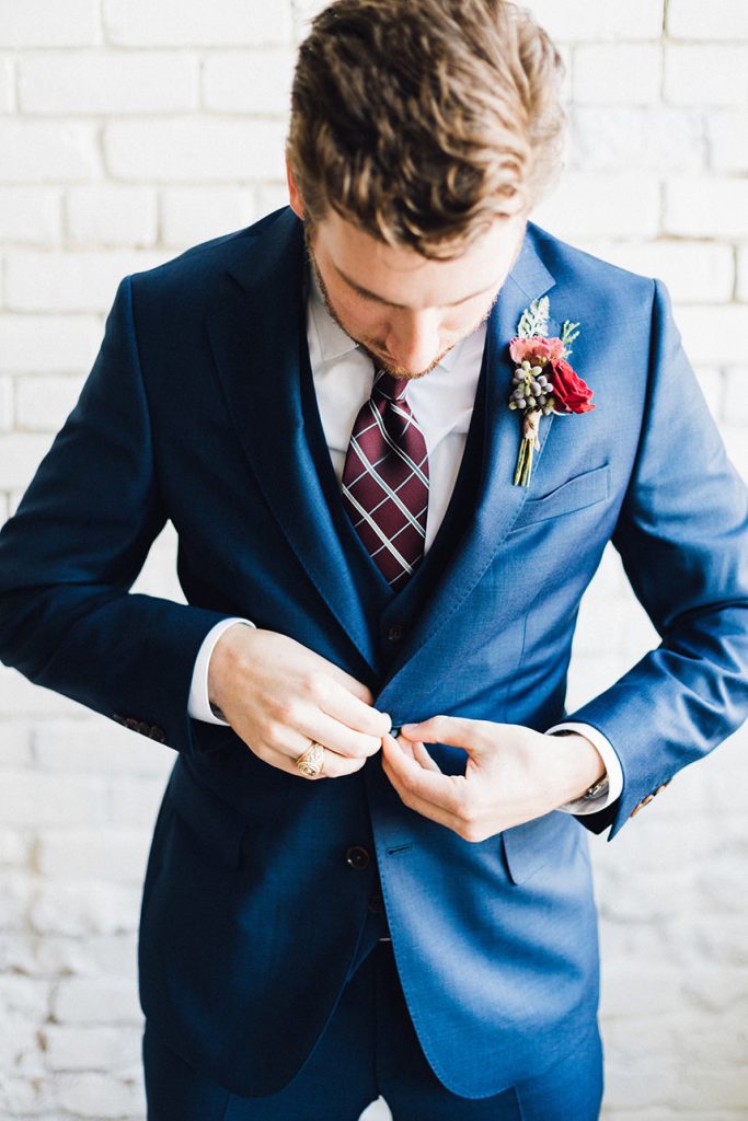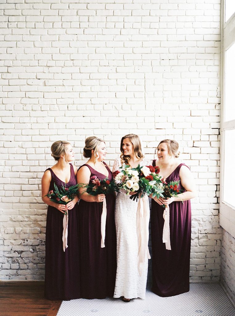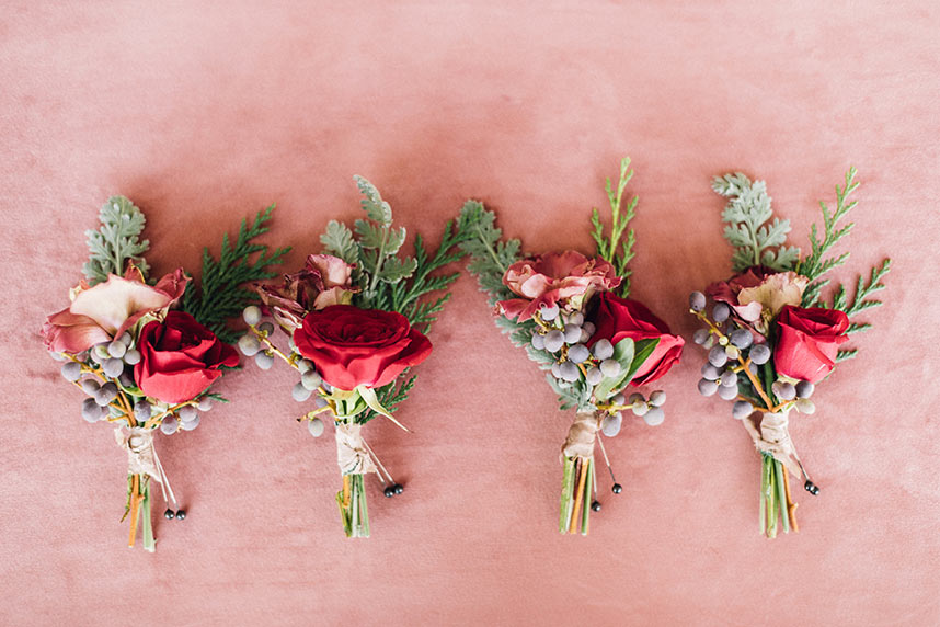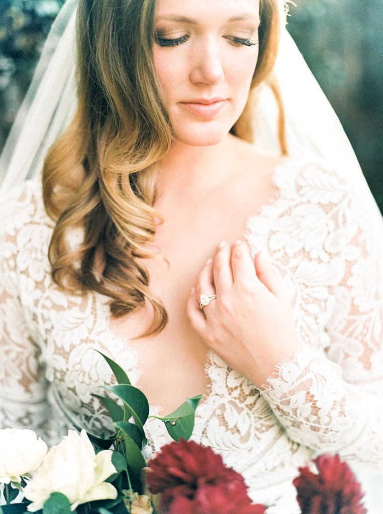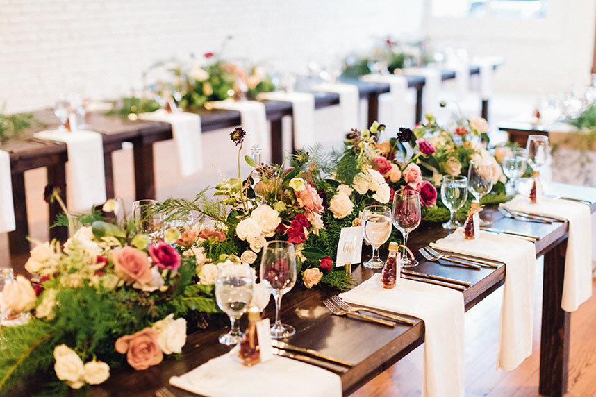 Elegance poured through the room just as smoothly as the wine flowed. Guests mingled in the industrial space dressed up like a winter garden party. Garnet red roses popped against vast emerald green floral arrangements spread across mahogany wooden tables in the historic building. Creamy exposed brick walls and floor-to-ceiling windows created the romantic, organic feel to a day so special to the bride and groom. “Our wedding day went perfectly; not only was the day full of love, but it went so smoothly and effortlessly,” the couple remembers. The bride, from Canada, and the groom, from Texas, were thankful a shared passion had made their unlikely paths intersect.