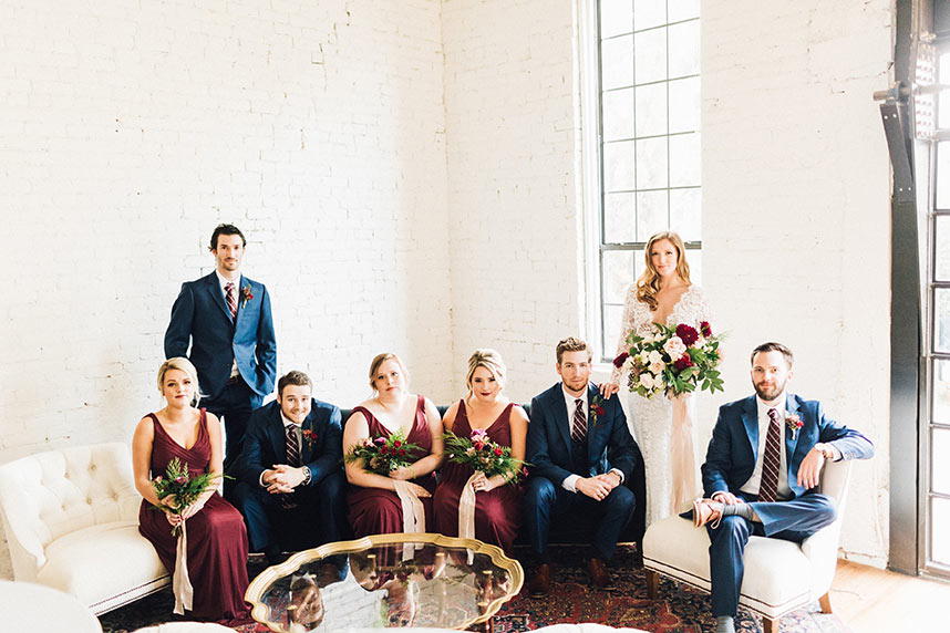 On December 2, 2017, One Eleven East was transformed by noon for the romantic celebration. Emily and her bridesmaids enjoyed sushi and Starbucks coffee in the bridal suite, while Grayson had breakfast with his dad and spent time with his groomsmen and ushers. When they all arrived at the venue, nerves were beginning to set in for the bride and groom. “We would recommend a first look to everyone,” the couple says. In a sweet and oh-so-memorable moment, Emily and Grayson saw each other for the first time that day, and their nerves melted away. They shared personal vows they wrote for each other and savored that private time before heading inside for the ceremony.