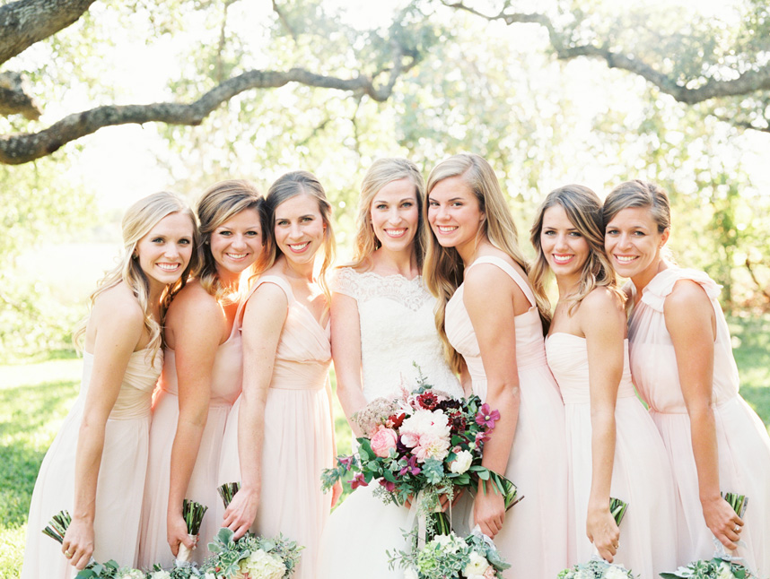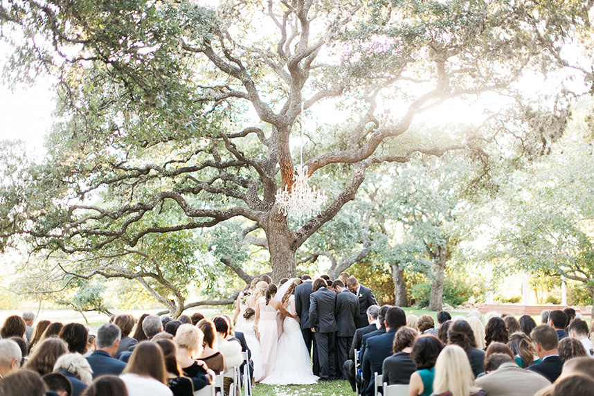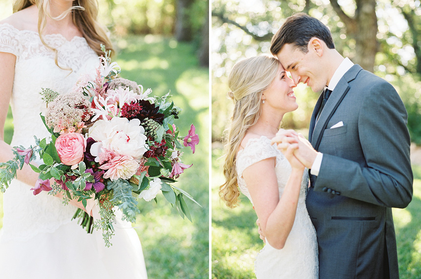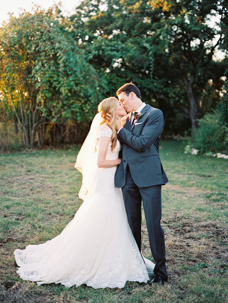 Anna and Ryan’s outdoor Austin wedding at the Winfield Inn was something from a dream. Relying on the beauty of nature, with the help of Lee Warth Floral Design, this stunning venue dressed in warm florals, set the stage for a beautiful evening celebrating the new Mr. and Mrs. Utilizing hues of peach, cranberry and light pink, the charming cake and table décor by Bee Lavish Vintage Rentals could not have come together more elegantly. We simply love the bride’s classic off-the-shoulder lace gown by Justin Alexander and her glamorous jeweled shoes. Without a doubt, this celebration was a stunner. Congrats to Anna and Ryan!