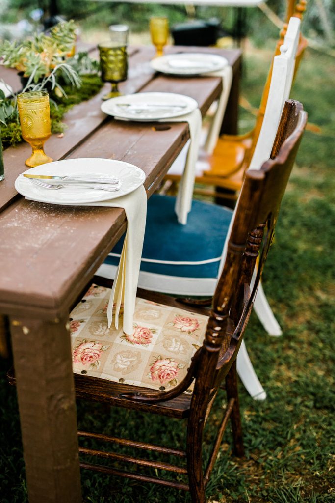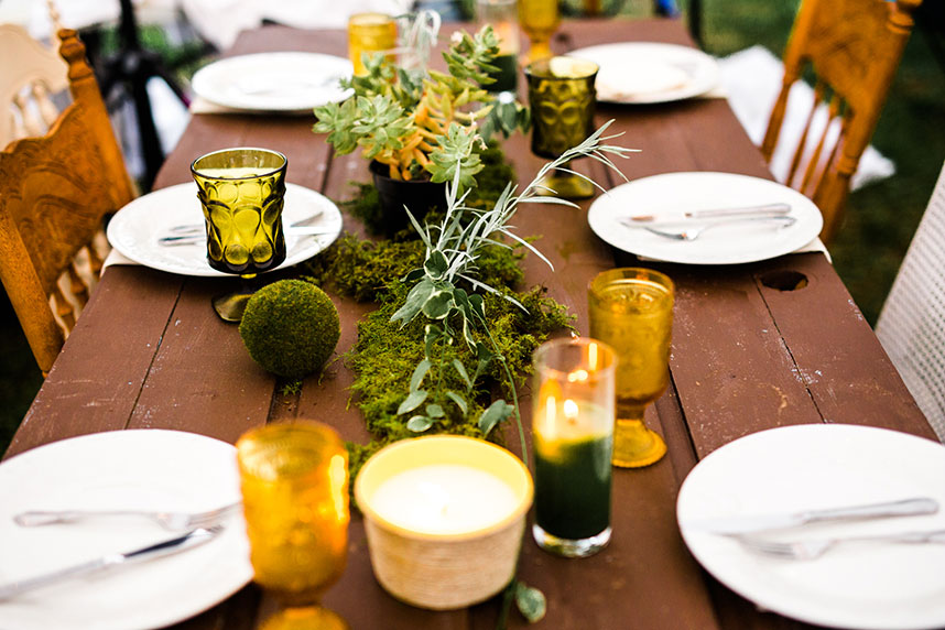 HUES TO USE: The couple had a bohemian rustic wedding with deep jewel tones used throughout the décor and floral arrangements.