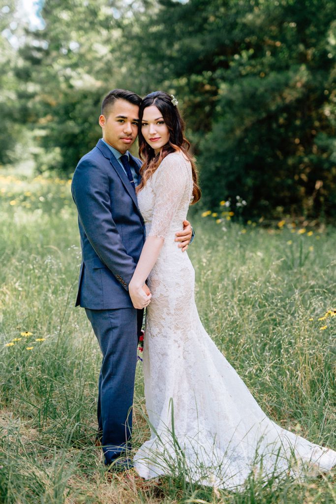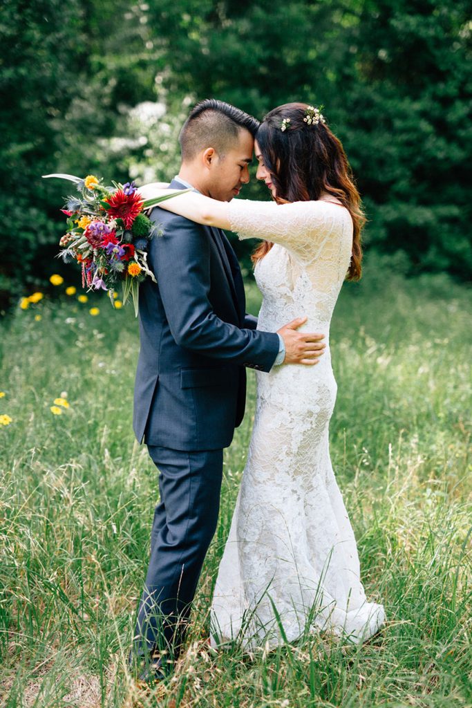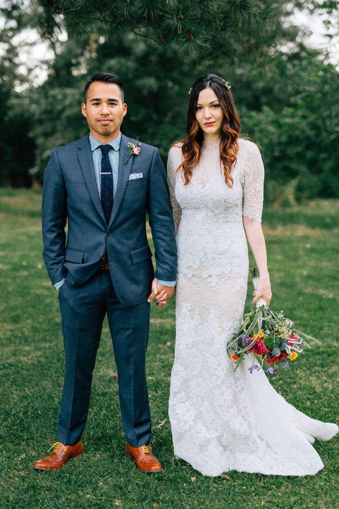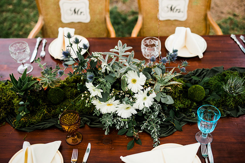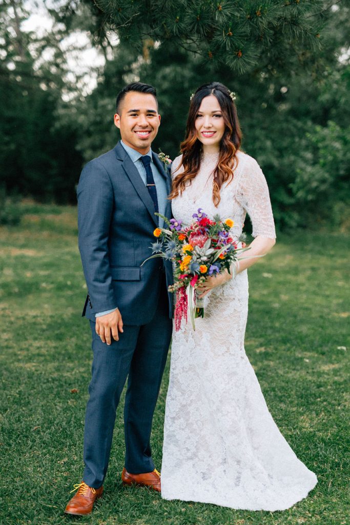 BEAUTIFUL BLOOMS: The bride carried a colorful bohemian-style bouquet of King Protea, Sierra butterweed, spider gerbera daisy, white veronica, succulents, wax flower, blue thistle, red anemones, pops of safflower, green berries and mixed greenery that included seeded eucalyptus, rosemary and various stems from her mother’s personal garden. It had a final touch of hanging amaranthus and the stems were tied neatly with lace.