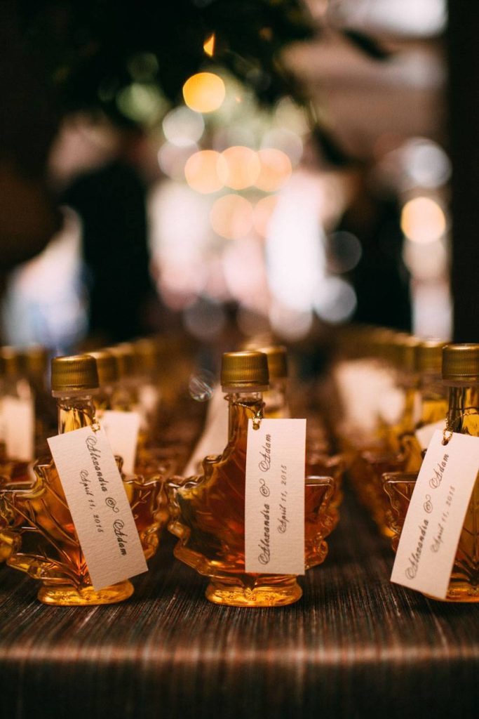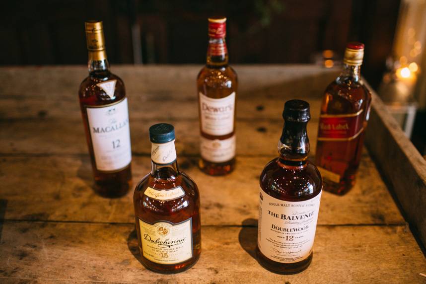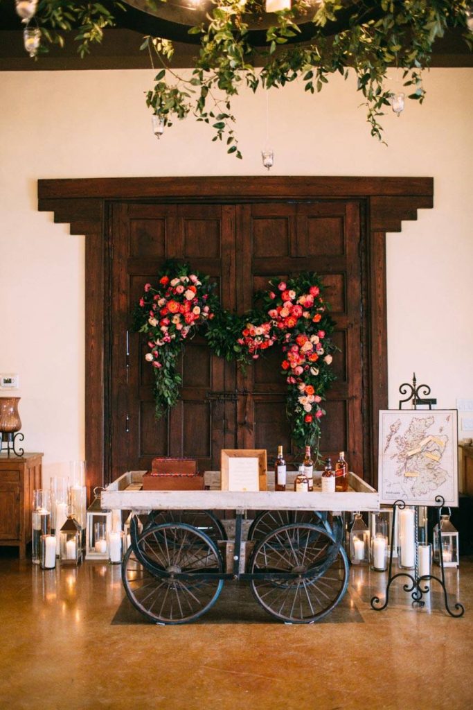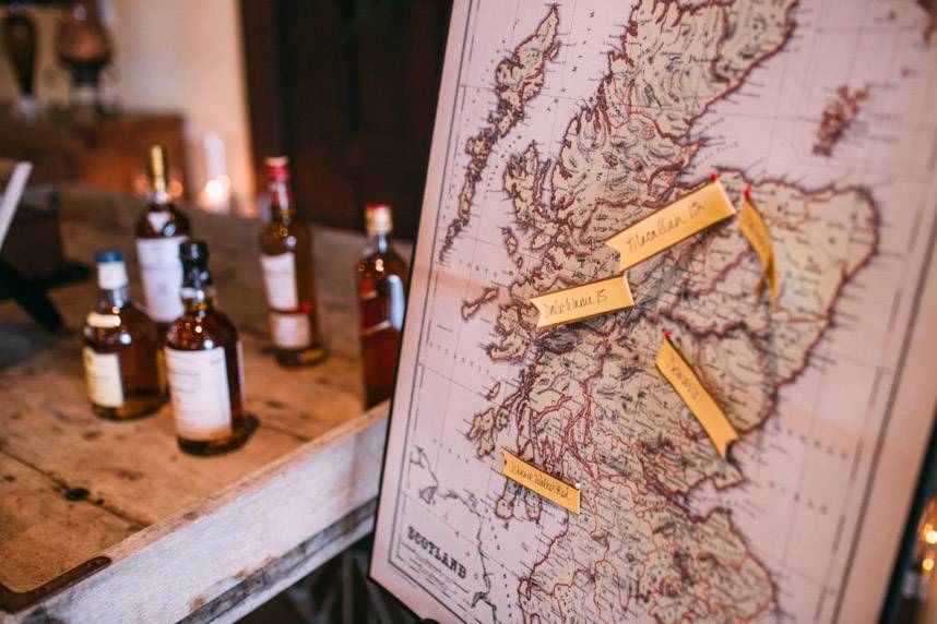 SPECIAL TOUCHES: Since Alex’s family lived in Scotland, a Scotch bar was offered at the wedding. Alex created a display to accompany it, marking where each of the Scotches originated from on a map of Scotland.