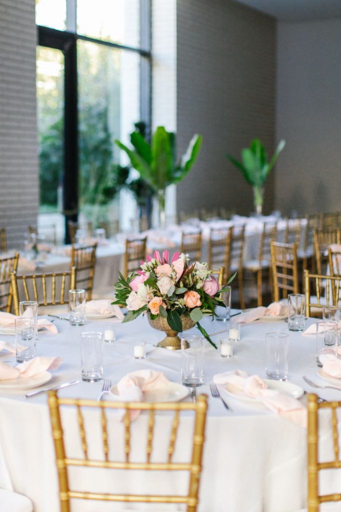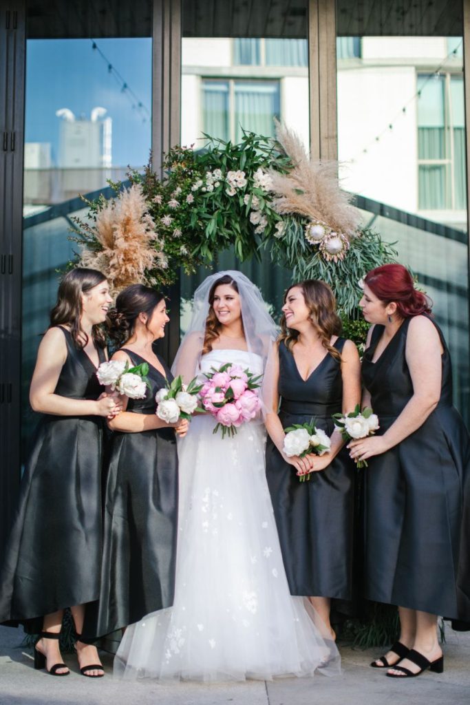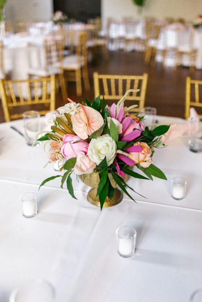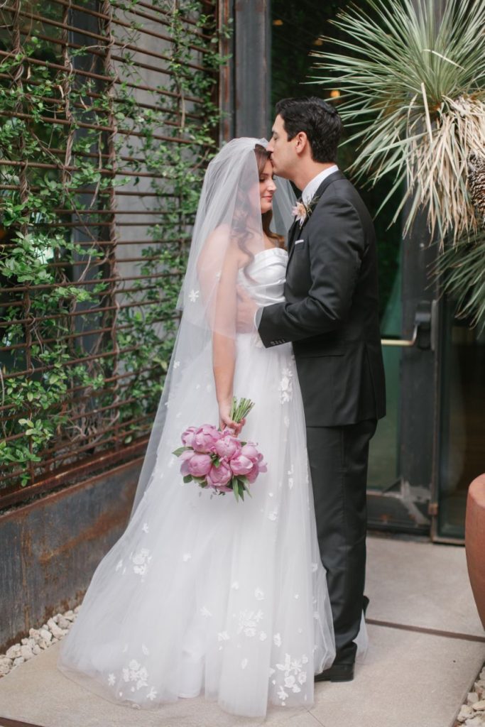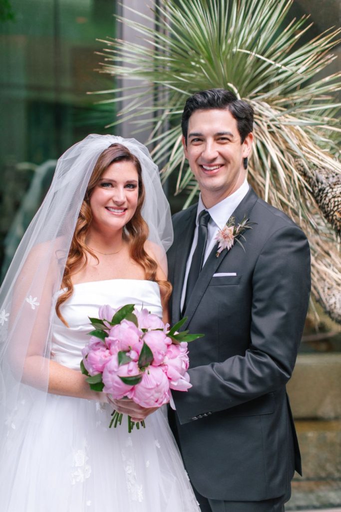 Whether you’re more of an East Coast or West Coast bride, there is an abundance of style in the blending of both within this tropical Austin wedding captured by the talented Elizabeth Denny Photography! Sarabeth and Stephen tied the knot in a chic ceremony inspired by the bride’s love of old Hollywood and the décor of the iconic Beverly Hills Hotel. Her idea to merge in a pop of Palm Springs created the wedding aesthetic you see here, complete with classic black and champagne wedding party attire and the bride’s statement veil inspired by Priscilla Presley. Tables set with glamorous gold chiavari chairs from Whim Hospitality keep with the ritzy theme and bold pink anthurium and palm leaves give these wedding scenes the perfect tropic, lush feel. Between stylish inspiration and sentimental shots by Elizabeth Denny Photography, there are a million reasons to fall for this tropical Austin wedding! Read on for a note from the bride about one of her favorite wedding day memories. Cheers to Sarabeth and Stephen!