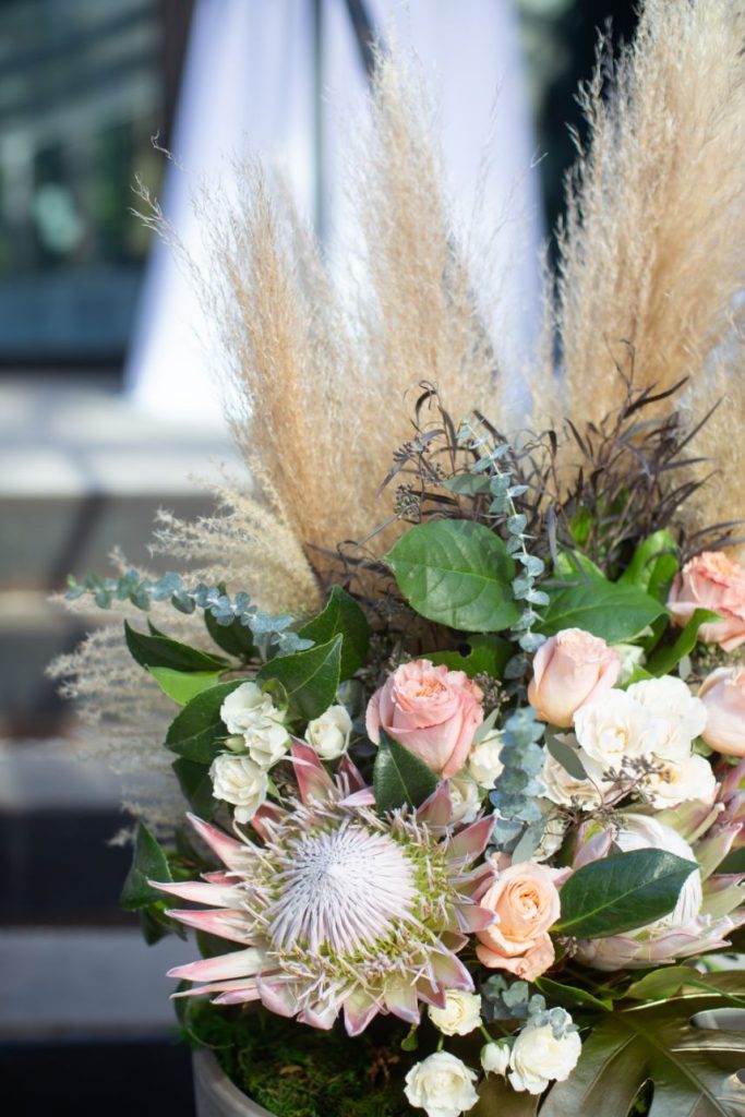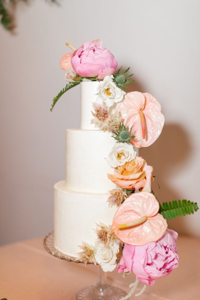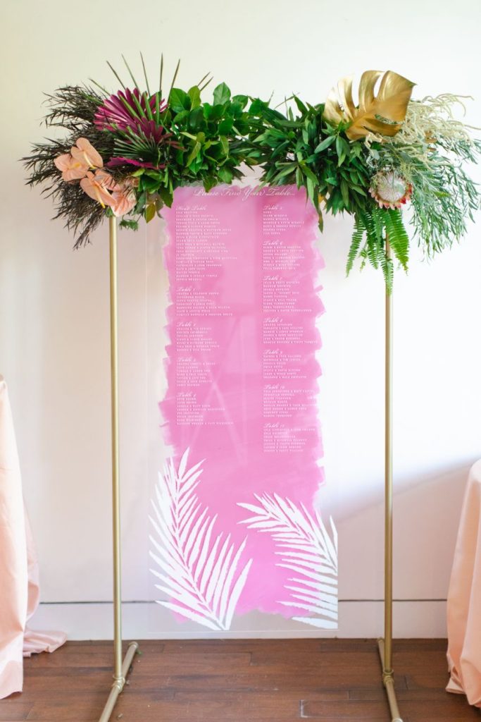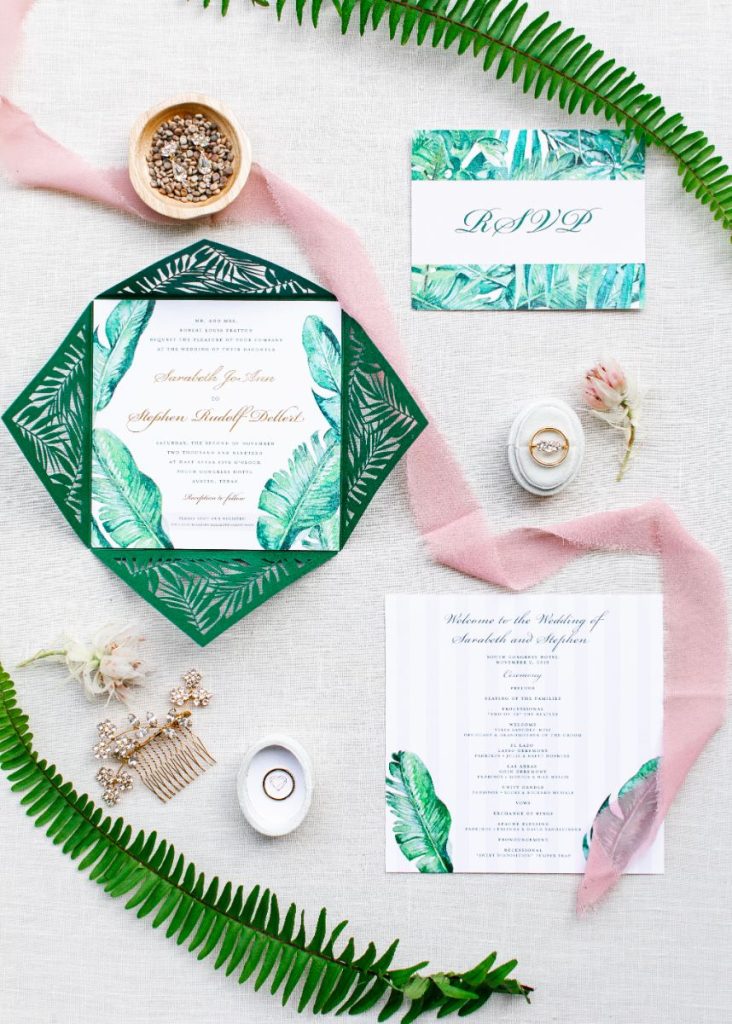 Whether you’re more of an East Coast or West Coast bride, there is an abundance of style in the blending of both within this tropical Austin wedding captured by the talented Elizabeth Denny Photography! Sarabeth and Stephen tied the knot in a chic ceremony inspired by the bride’s love of old Hollywood and the décor of the iconic Beverly Hills Hotel. Her idea to merge in a pop of Palm Springs created the wedding aesthetic you see here, complete with classic black and champagne wedding party attire and the bride’s statement veil inspired by Priscilla Presley. Tables set with glamorous gold chiavari chairs from Whim Hospitality keep with the ritzy theme and bold pink anthurium and palm leaves give these wedding scenes the perfect tropic, lush feel. Between stylish inspiration and sentimental shots by Elizabeth Denny Photography, there are a million reasons to fall for this tropical Austin wedding! Read on for a note from the bride about one of her favorite wedding day memories. Cheers to Sarabeth and Stephen!