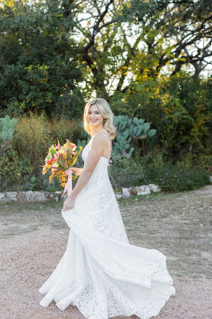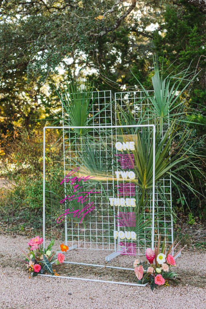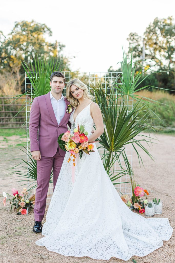 Palm Springs meets Tejas in this modern tropic editorial that instantly takes the Texas countryside from desert heat to desert chic! Inspired by her love of palm trees, Tara from Lotus Events curated a scene where tropical details and a neon color palette rein, embodying all of our destination wedding dreams in the heart of Texas. Vibrant florals in shades of pink, orange and yellow from Lavender and Lily Floral take center stage alongside palm leaf and boho accents, all perfectly placed in the desert-esque courtyard of Hudson Bend Ranch.