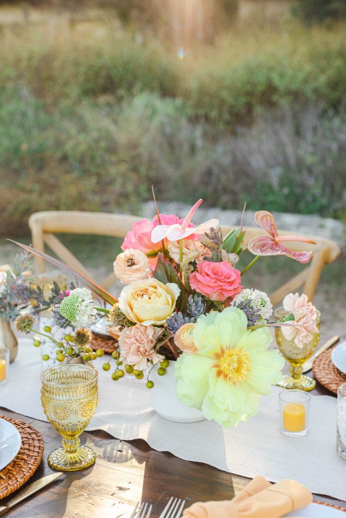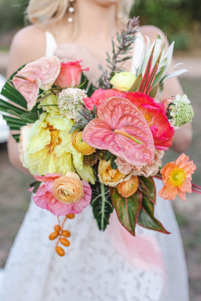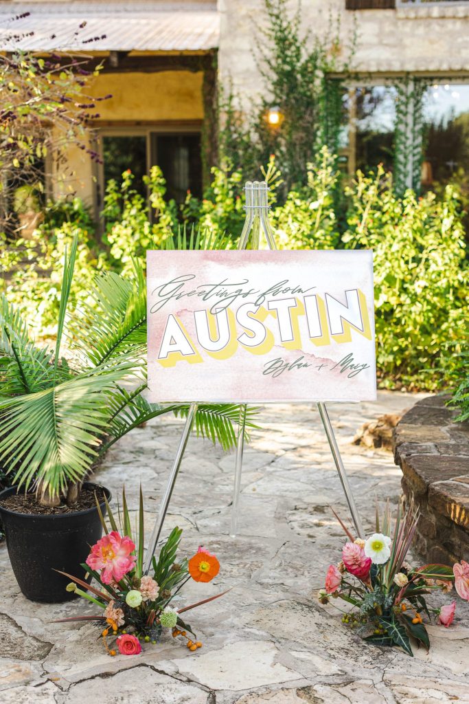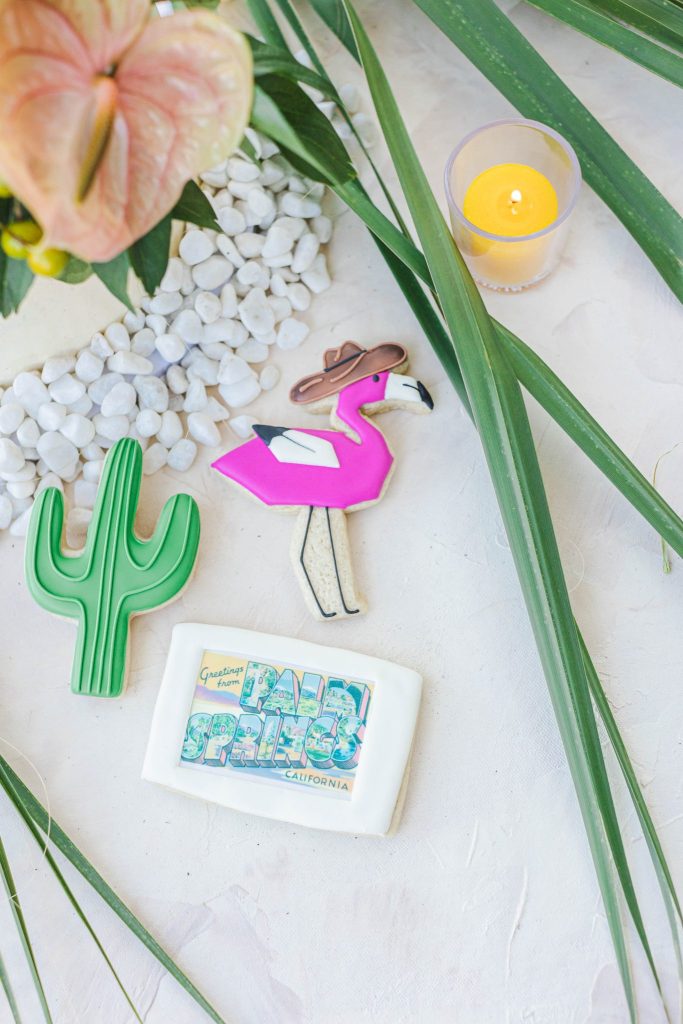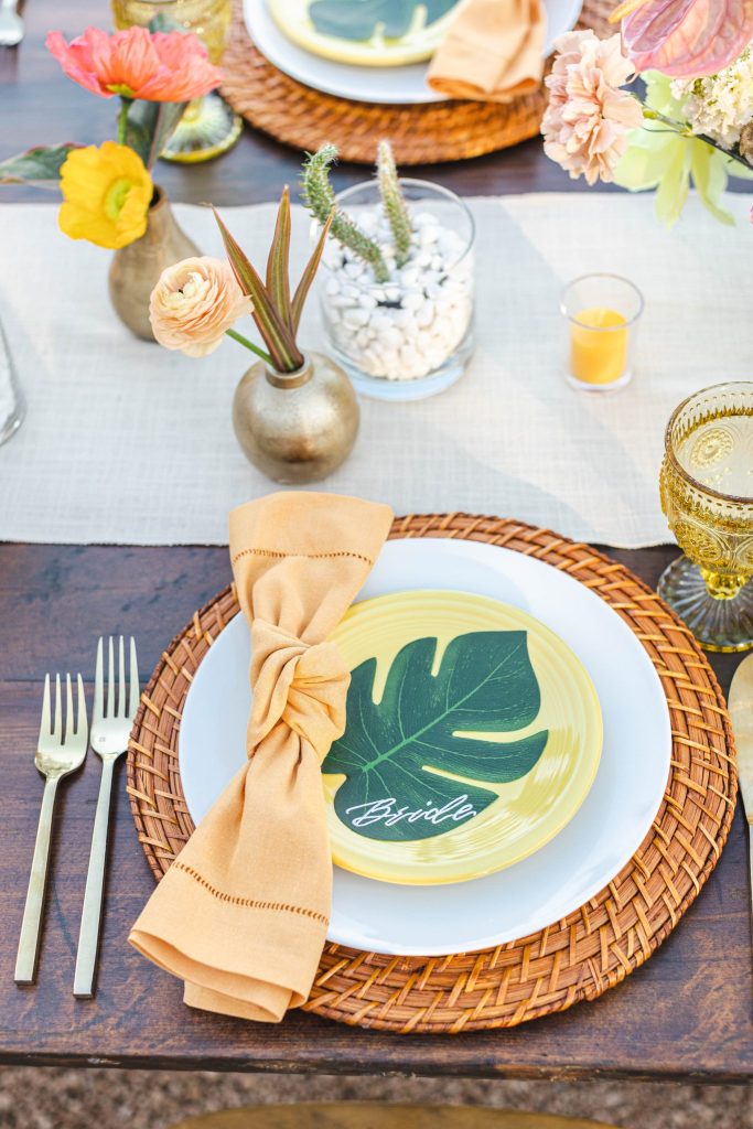 From the planner, Tara Blackwell with Lotus Events: “When designing this shoot, my intentions were to keep the whole design and experience fun and vibrant. I wanted each vendor to enjoy crafting their elements, too. The ‘Palm Springs meets Texas’ vibe is inspired by my love for palm trees. I wanted this to look and feel as if we were on a staycation!”