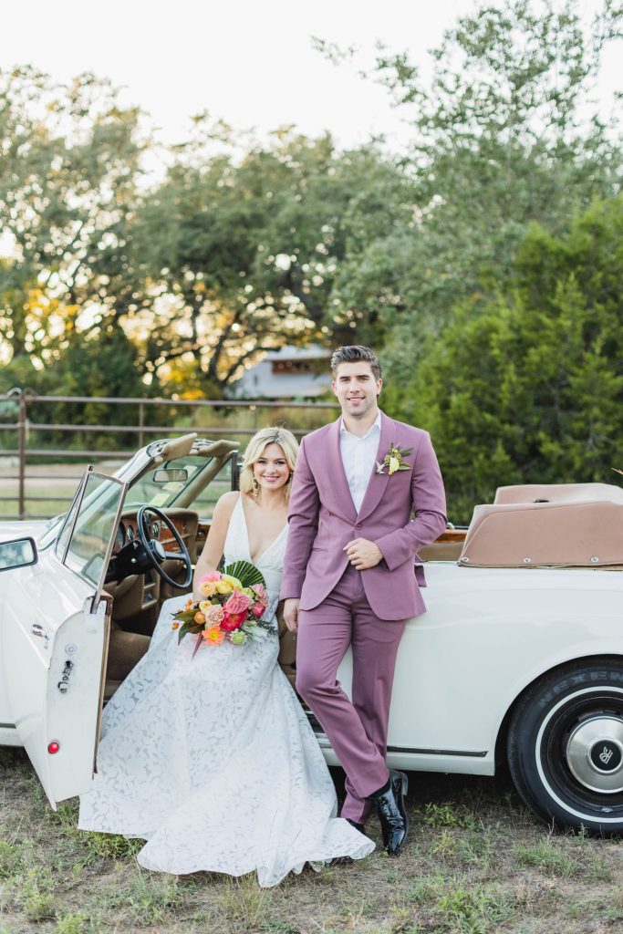 Decor from Whim Hospitality makes all the difference when it comes to creating an effortlessly stunning tablescape, complete with wild bouquets of eclectic blooms and bold pops of color in every element. Place settings of light peach linens and white chargers topped with name cards from Lettered by Valerie tie in all the tropical details and add a unique element to each setting. While it feels like we’ve been whisked away to Palm Springs, Lettered by Valerie‘s seating chart helps navigate guests to their assigned seats, as well as gives a stylish reminder that we’re still in Austin with a chic welcome sign. Our gorgeous model couple looks flawless posed against a vintage Rolls Royce from Elegant Worldwide Transportation, with our bride strutting a floral, lace detailed gown from a&bé bridal shop Austin as well as a playful bridal look that features bouncy curls and a bright pink lip by Makeup ATX. Adorable cookies from The Lucky Baker elevate any dessert display (peep the cowboy hat on the flamingo), and paired with this naked cake from Bakery Cloud Nine adorned with fresh anthurium and palm leaves, you truly can’t go wrong! Scroll to see all the modern tropic details of this desert chic editorial captured by Alyssa Jarae Photography and get inspired on creating your very own destination wedding in the heart of Texas. Cheers!