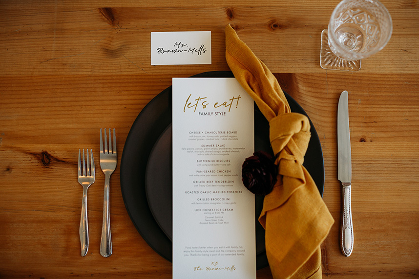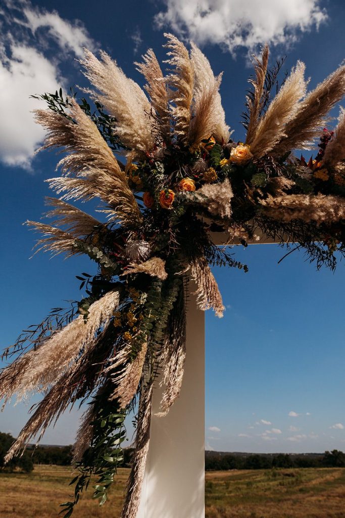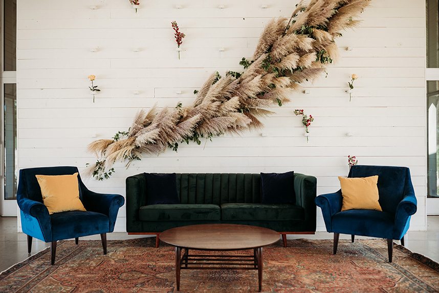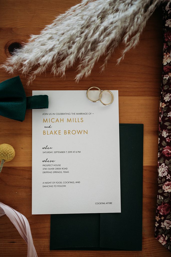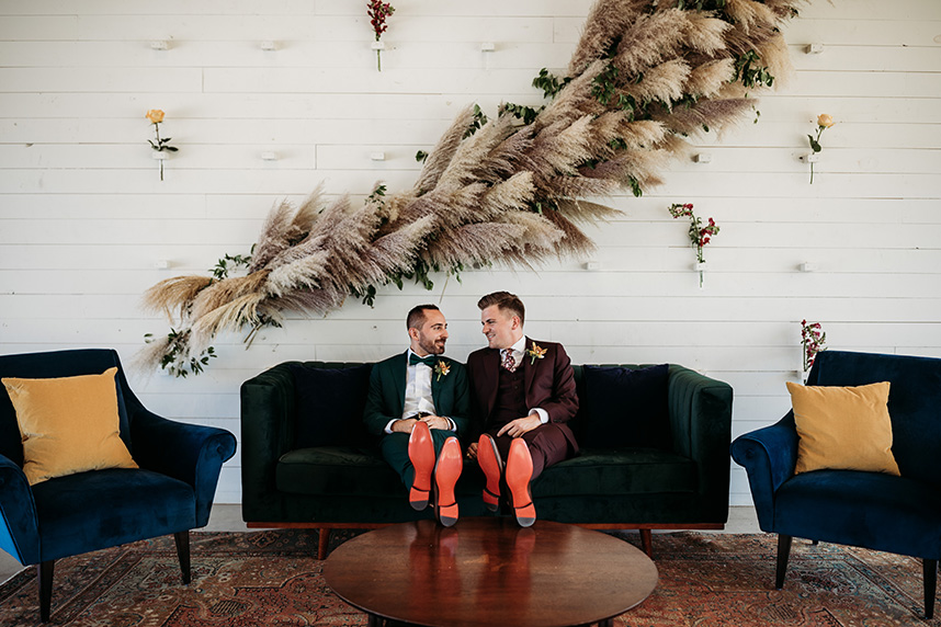 The second we saw this modern pampas grass altar from Bouquets of Austin we knew we had to share! Blake Brown and Micah Mills’ September wedding was full of moody, modern details and muted jewel tones that we’re totally obsessing over. Jen, with Pearl Events Austin, didn’t miss a detail when it came to planning the happy couple’s big day, and they even raved about how she made the entire day run smoothly and totally stress-free. The couple wanted the day to be focused on their guests and celebrating their love, so they chose to forgo the tradition of not seeing each other until the ceremony and spent the entire day with their wedding party getting ready to say “I do!” Our mouths are watering looking at the yummy grilled cheese bites and tomato soup from Pink Avocado Catering and we’re sure yours will be too. Scroll through all the details below for some of the best fall wedding inspo. Cheers to Mr. and Mr. Brown-Mills!