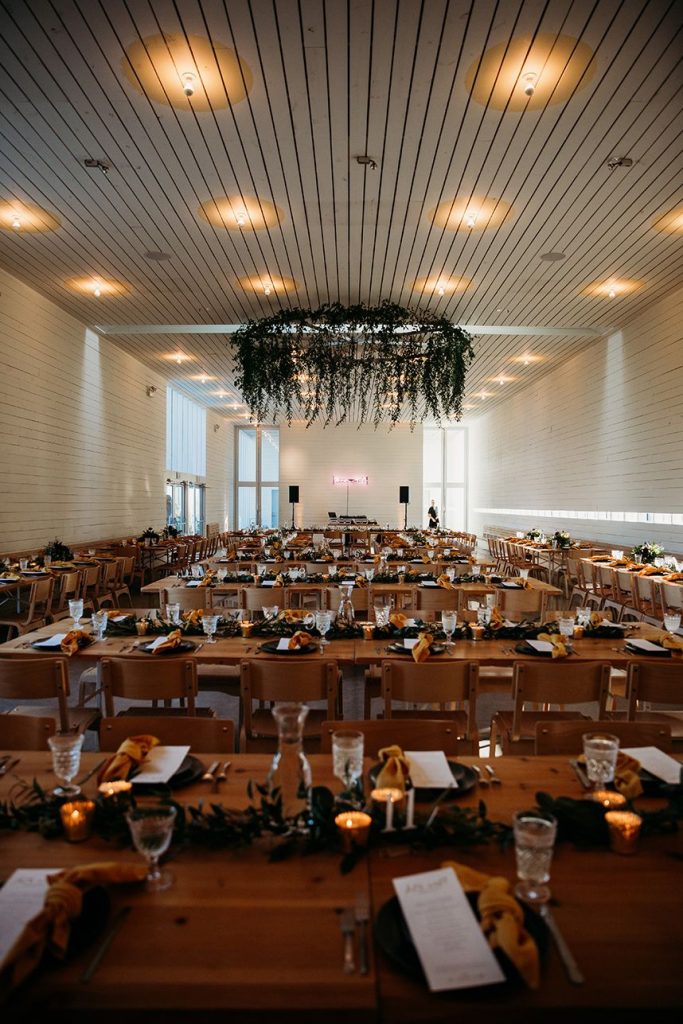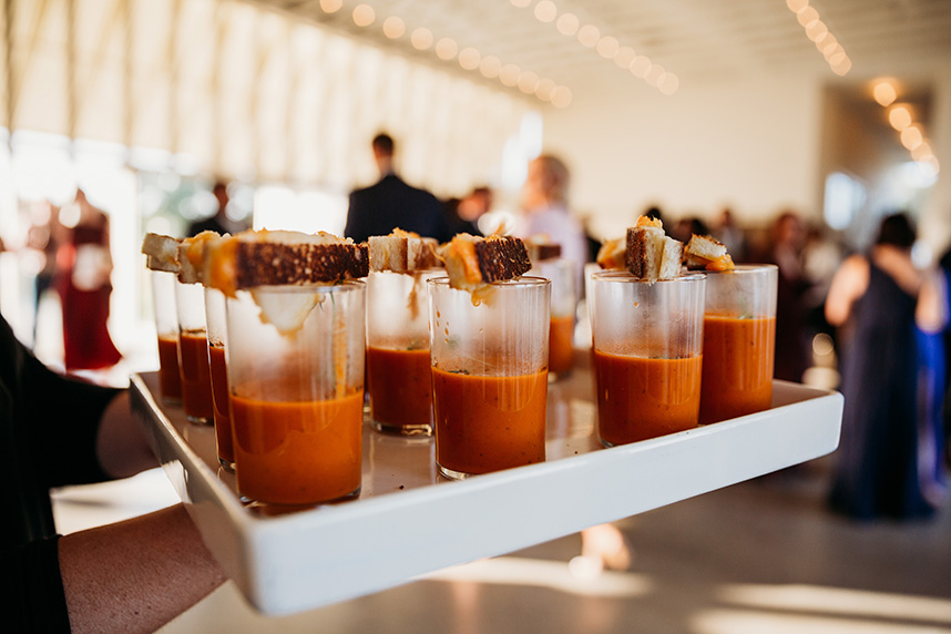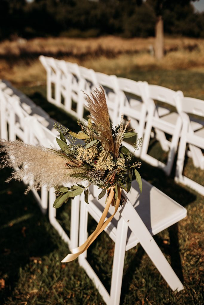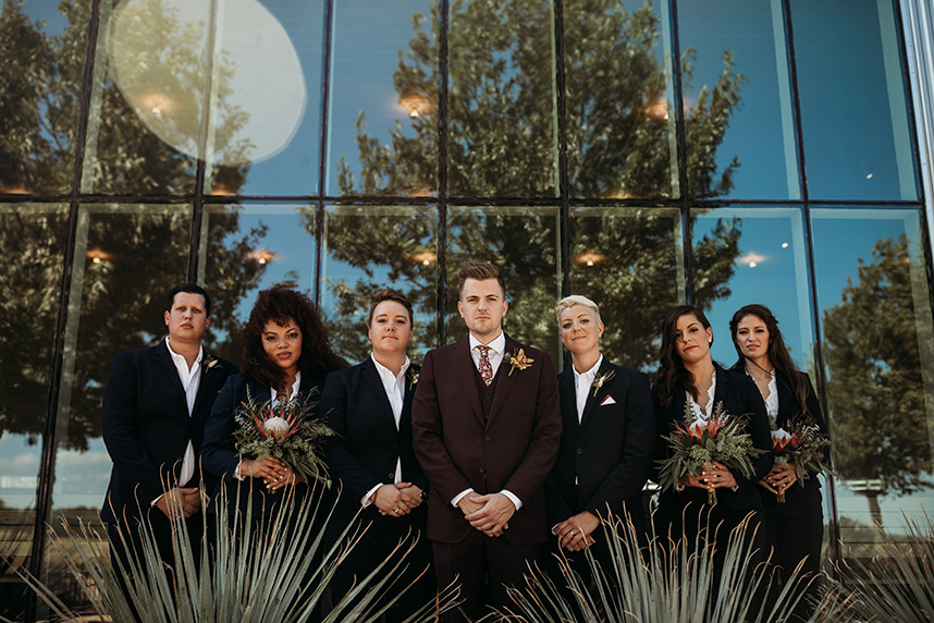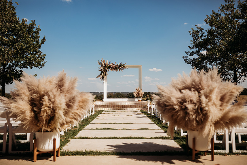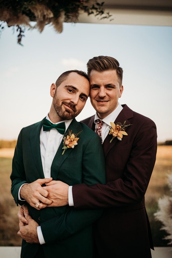 The second we saw this modern pampas grass altar from Bouquets of Austin we knew we had to share! Blake Brown and Micah Mills’ September wedding was full of moody, modern details and muted jewel tones that we’re totally obsessing over. Jen, with Pearl Events Austin, didn’t miss a detail when it came to planning the happy couple’s big day, and they even raved about how she made the entire day run smoothly and totally stress-free. The couple wanted the day to be focused on their guests and celebrating their love, so they chose to forgo the tradition of not seeing each other until the ceremony and spent the entire day with their wedding party getting ready to say “I do!” Our mouths are watering looking at the yummy grilled cheese bites and tomato soup from Pink Avocado Catering and we’re sure yours will be too. Scroll through all the details below for some of the best fall wedding inspo. Cheers to Mr. and Mr. Brown-Mills!