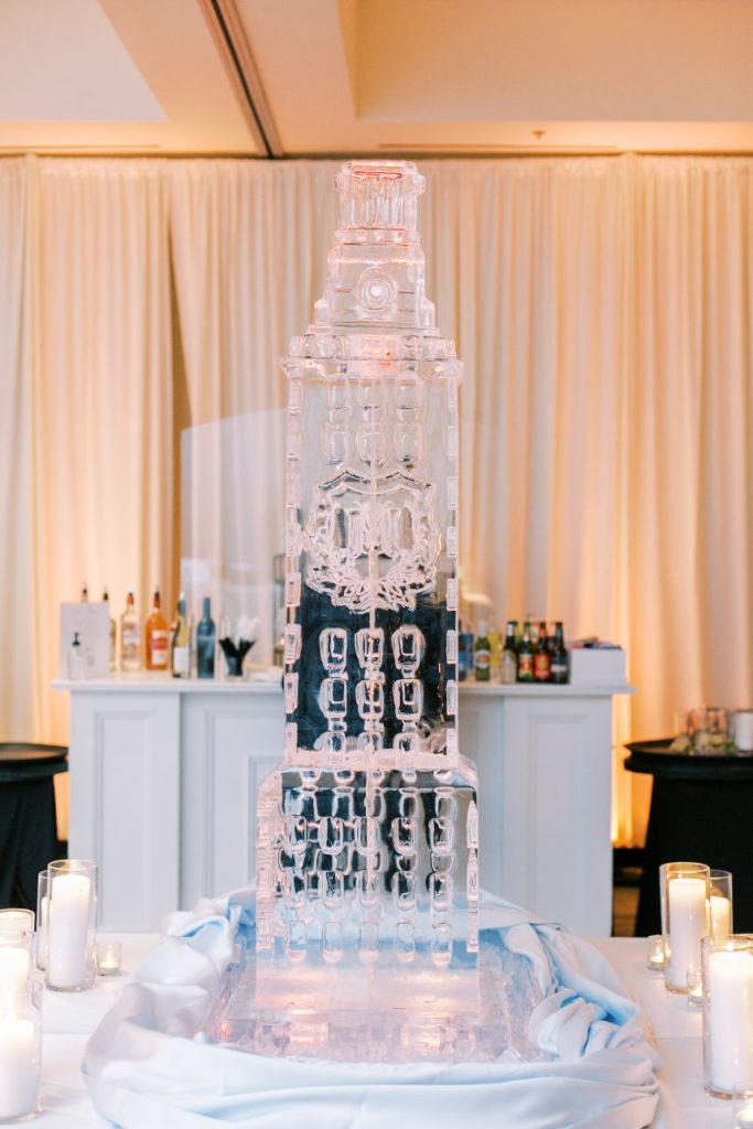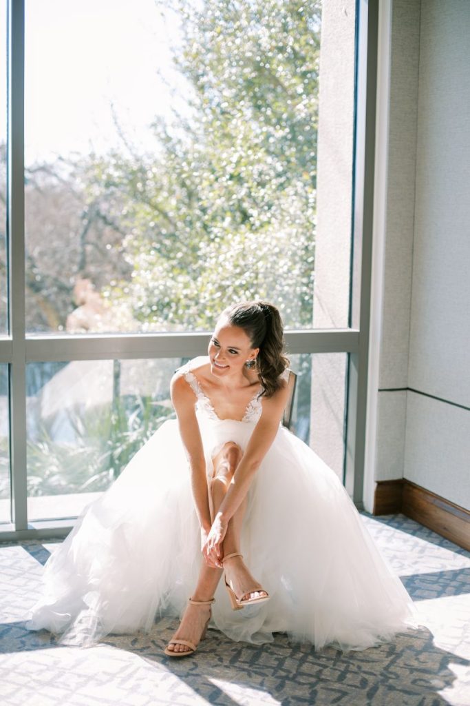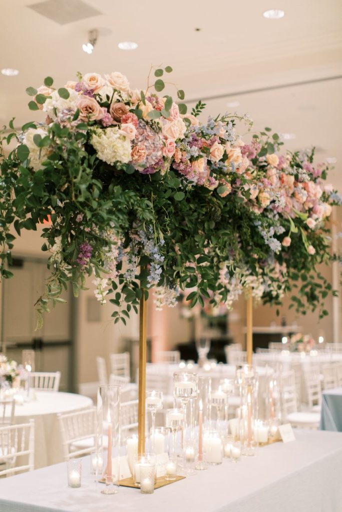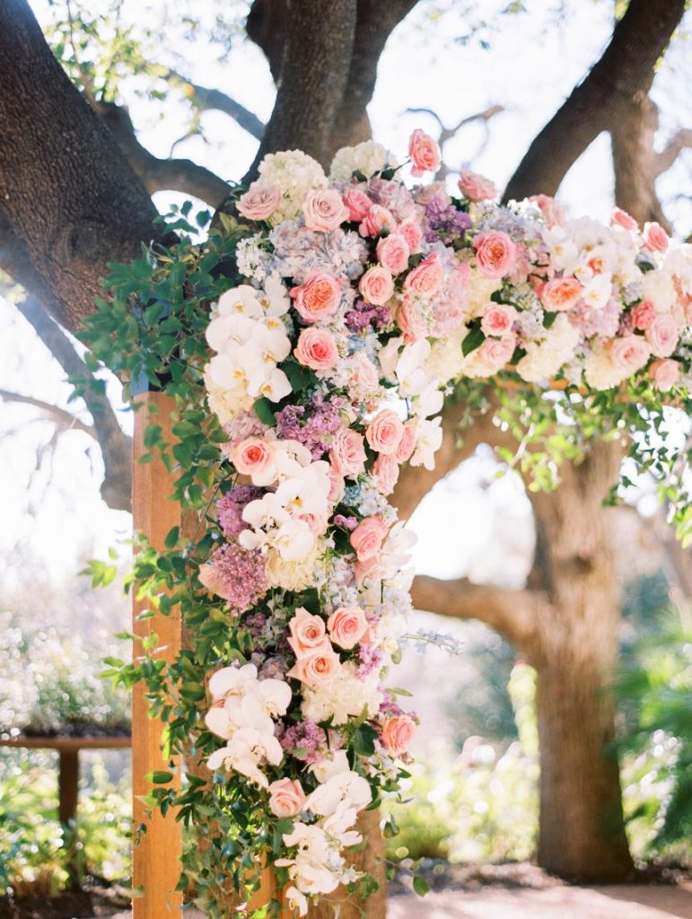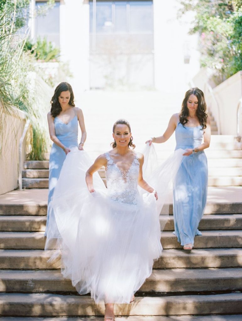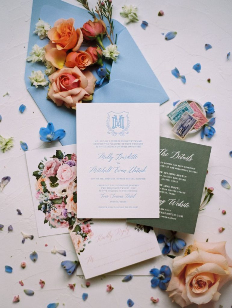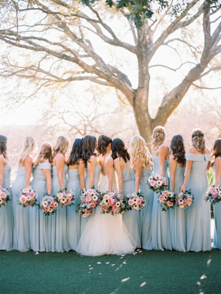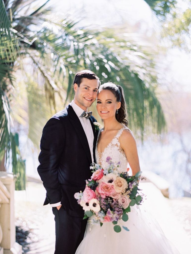 Molly and Mitchell’s dreamy pastel winter fête is definitely one to see! The two celebrated their marriage with a perfectly pastel wedding planned by the powerhouse wedding planner Pearl Events Austin. Becky with Pearl worked alongside premiere wedding florist Bouquets of Austin to create the colorful atmosphere Molly envisioned with floral arrangements bursting with icy blue, rosy pink, orchid and ivory blooms. The two were married with Lady Bird Lake as their backdrop (a nod to the couple’s love of Austin) under a beautiful floral chuppah, with a whopping 28 bridesmaids and groomsmen standing by their sides – how special?! The party moved inside the hotel for a beautiful ballroom reception. Two of our favorite details? The floral wrapped cake featuring the couple’s new crest and a towering ice sculpture of the University of Texas erected by Full Spectrum Ice Sculptures!