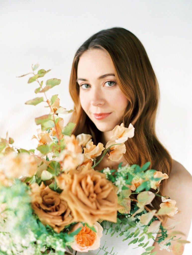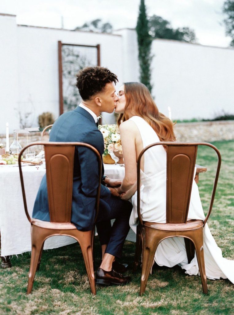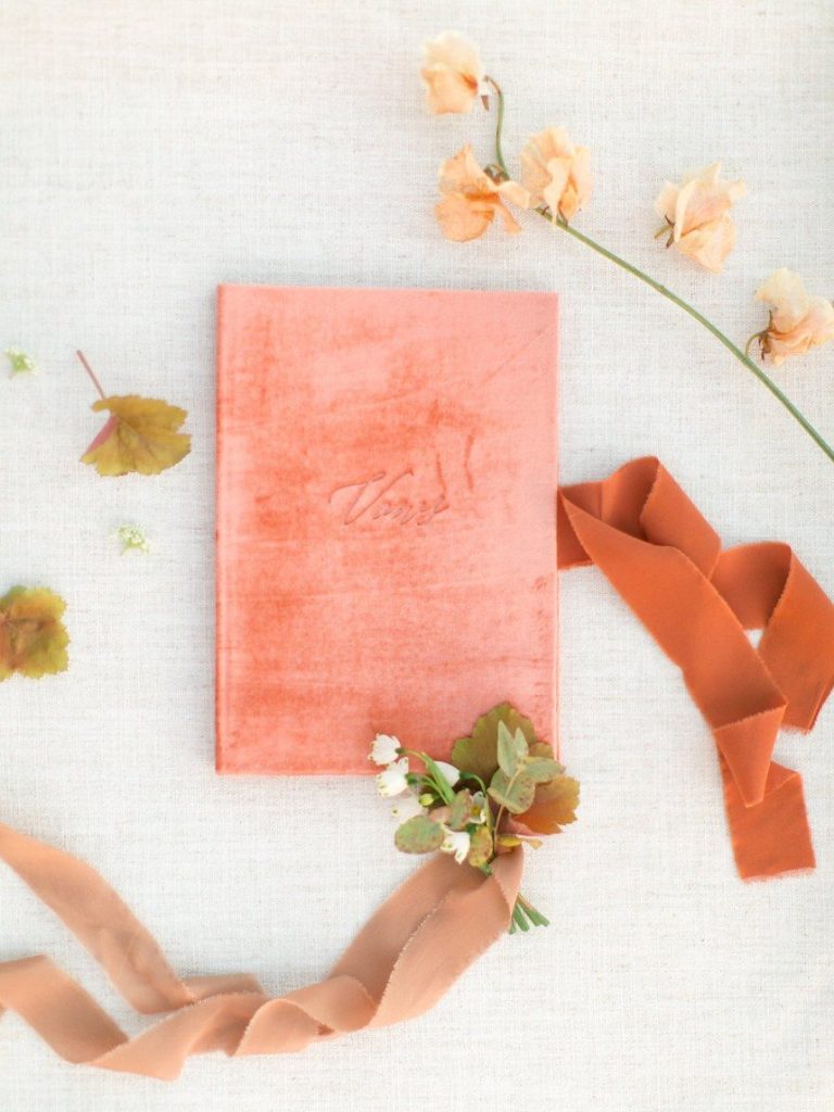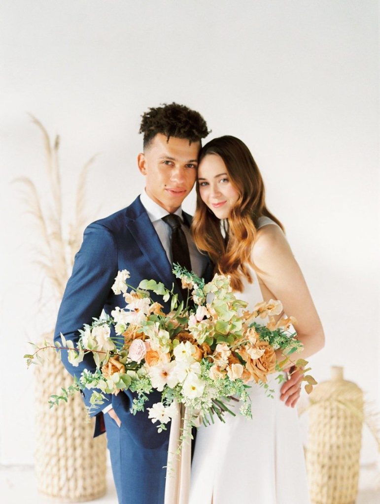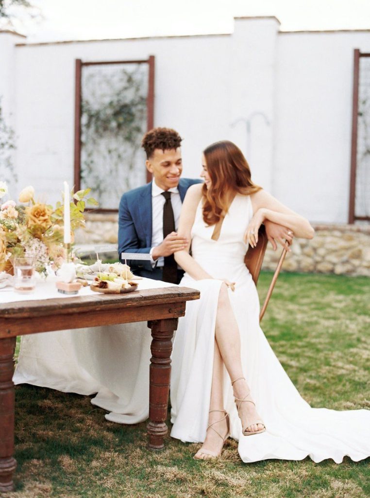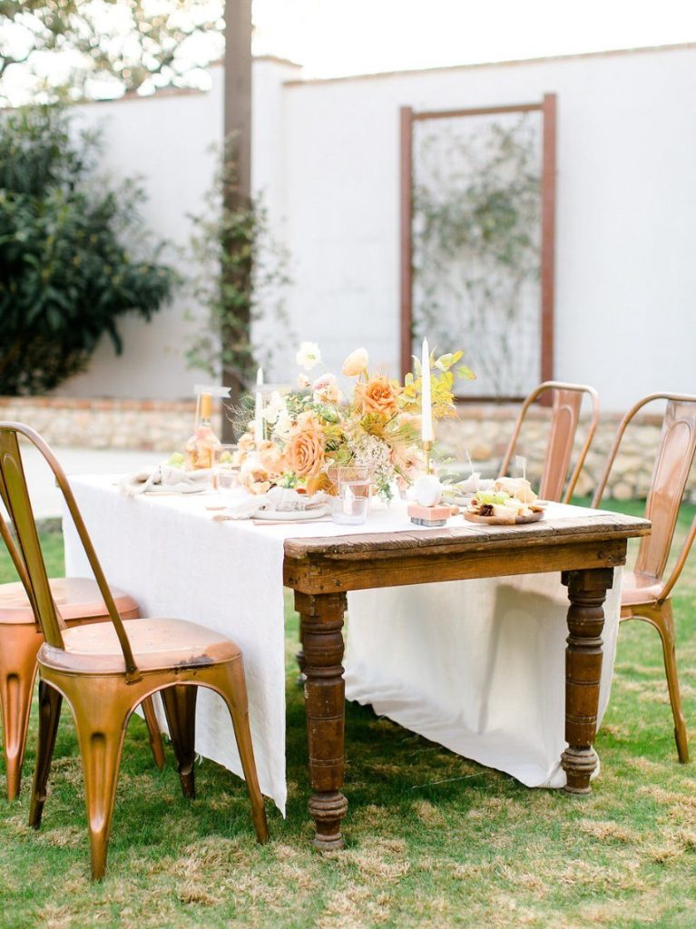 Trust us when we say the florals in this peachy textured styled shoot are some of the dreamiest we’ve ever seen! Clementine Botanical Art‘s floral design absolutely mastered gorgeous color pairings in organic bouquets to bring life to this scene. Contemporary copper chairs from Loot Vintage surrounding a heavy wooden table adorned with decadent charcuterie and more gorgeous blooms give an updated Mediterranean feel to the aesthetic, and the details keep getting better from there! Lovely calligraphy is accented by bird graphics and tall, feathering plants in boldly textured baskets, and the bride’s chic deep-V gown from Unbridaled makes a statement along with her effortless auburn locks and copper-toned makeup. The metallics, pale yellow and pops of rose gold all complement the peachy textured look so well and make this wedding inspiration something from a dream. Happy scrolling!