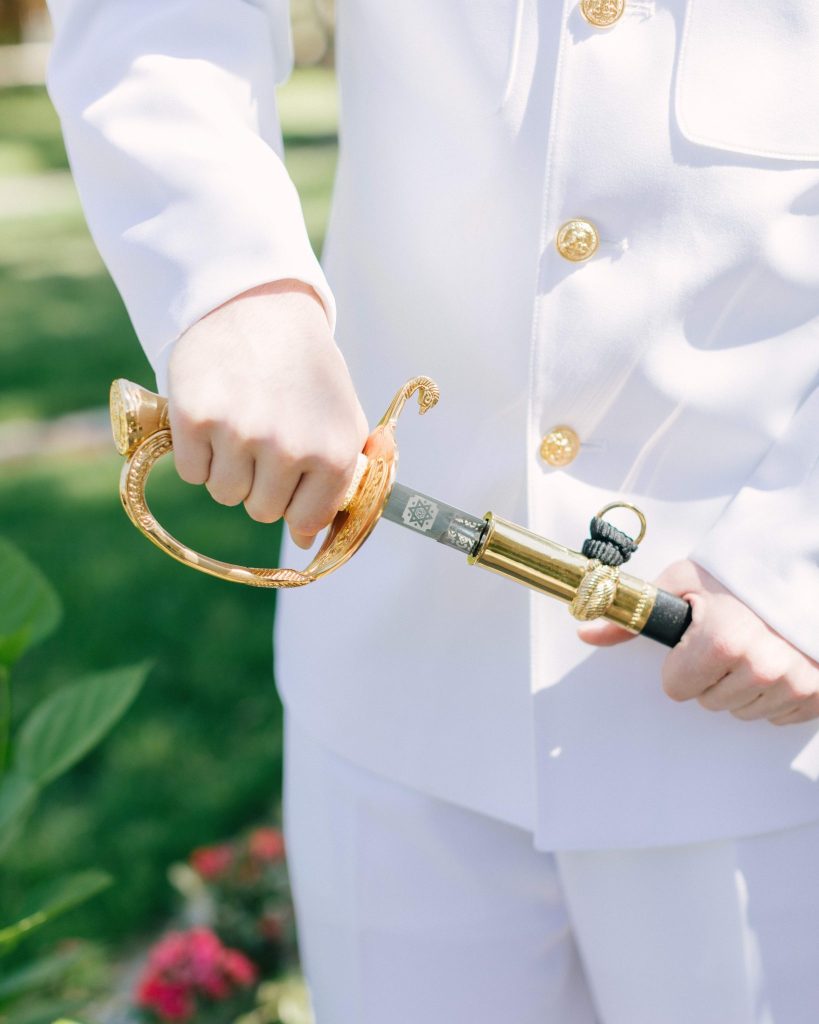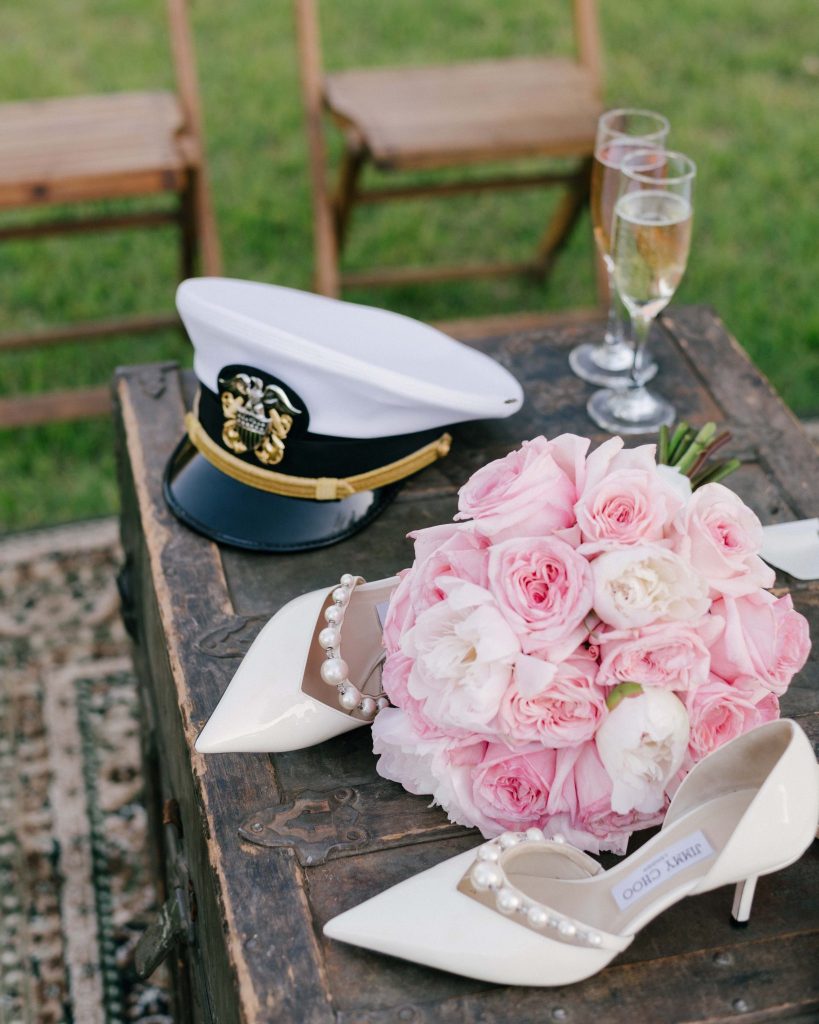 A magical day celebrating the sweet couple! Their elegant wedding day was filled with pinches of pink and a lively celebration on the dance floor. Claire wore a blush wedding gown reminiscent of 1960s style, and Jared wore his white Naval officer’s uniform, carrying a saber. This sweet couple are a match made in heaven!