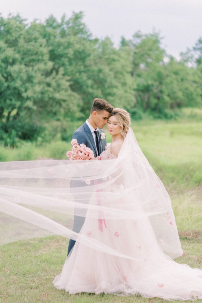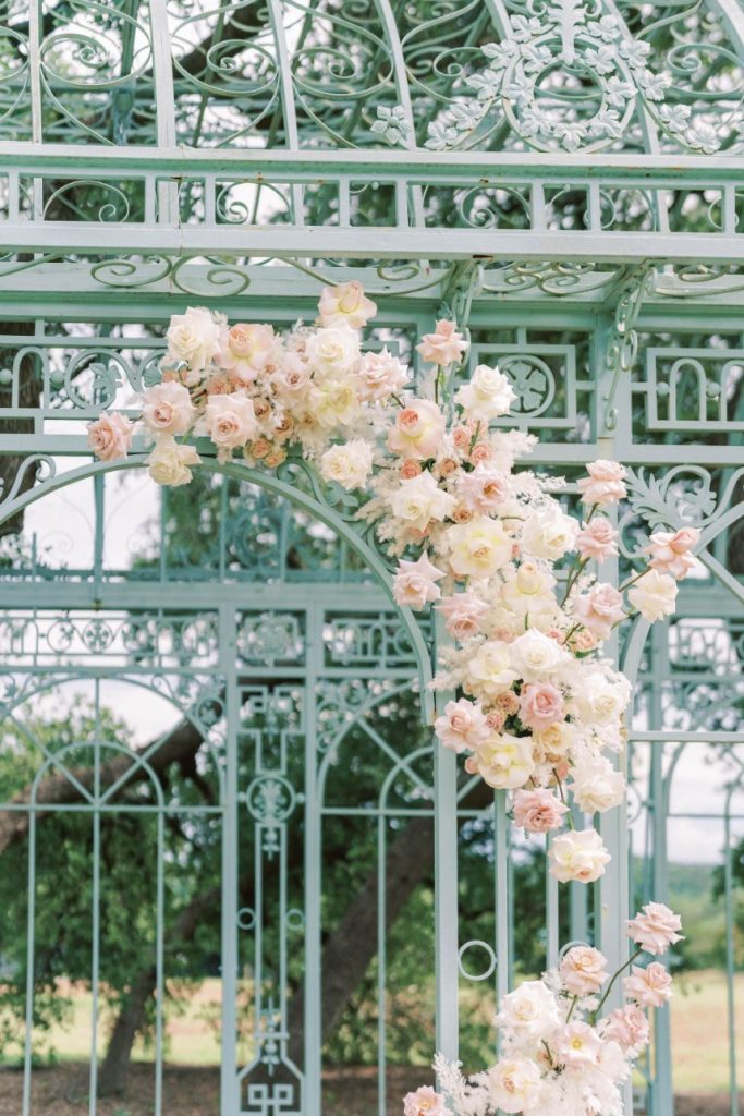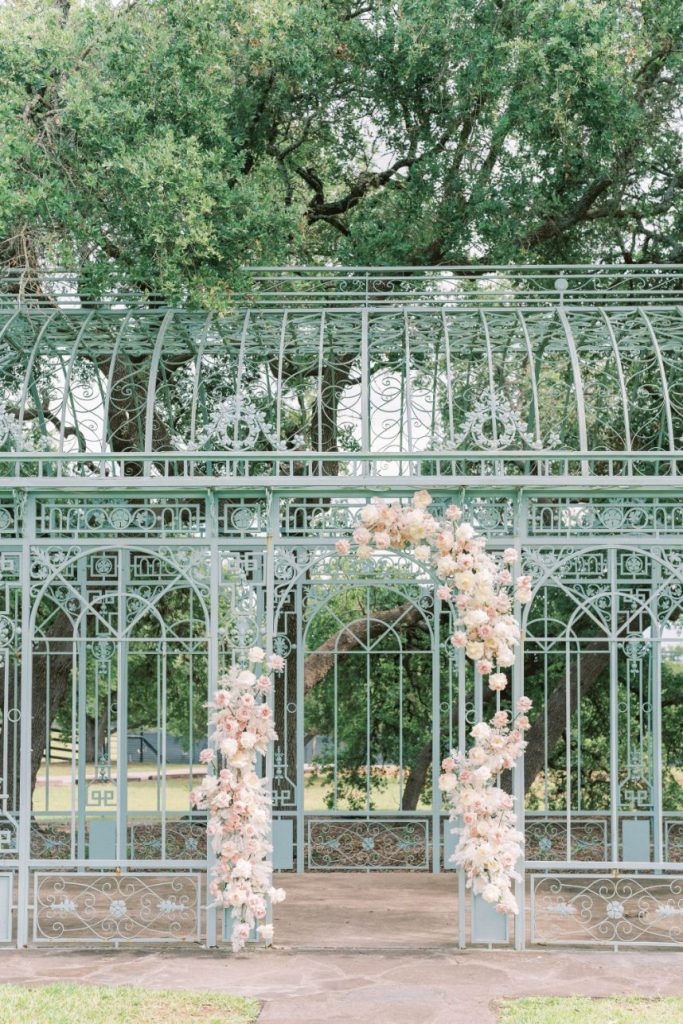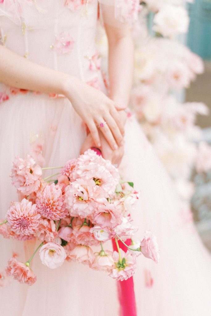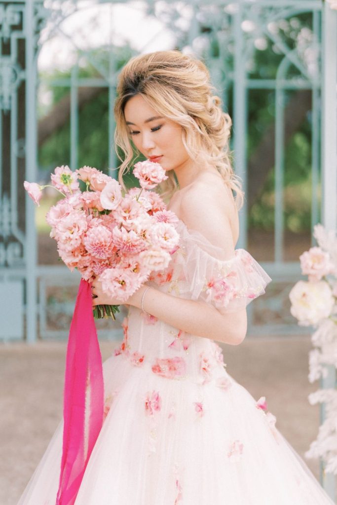 From the photographer, Sarah Tribett Photography: “Hosted in Austin’s beautiful hill country, this elegant shoot with every shade of pink imaginable will transport you into a romantic wonderland. From the 3D florals on the stunning Monique Lhullier wedding gown to the pastel flower arch by Remi + Gold, this shoot at the European-inspired Ma Maison will have you dreaming!