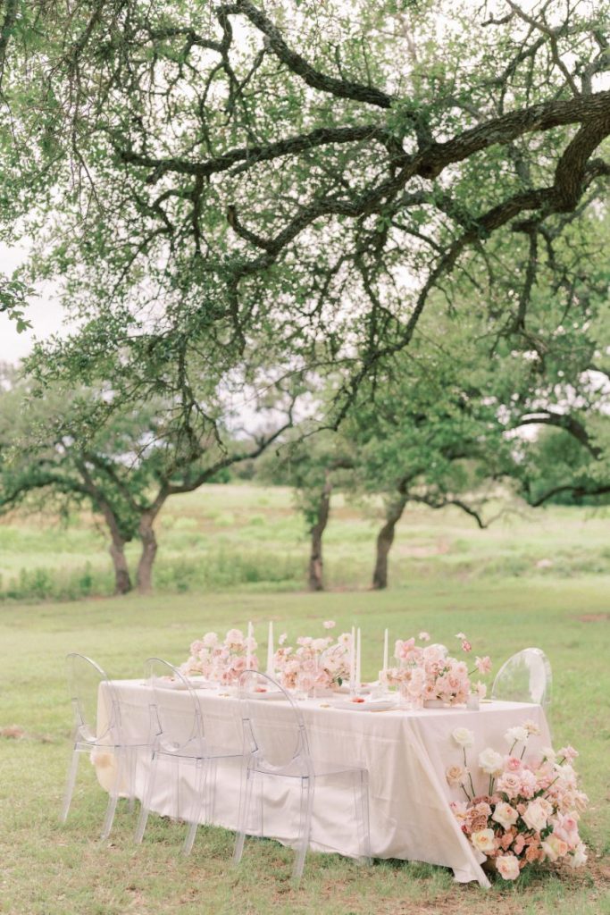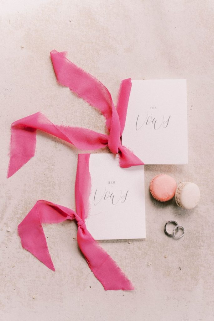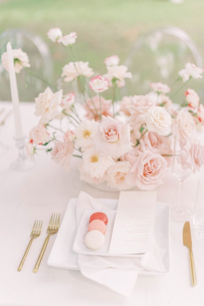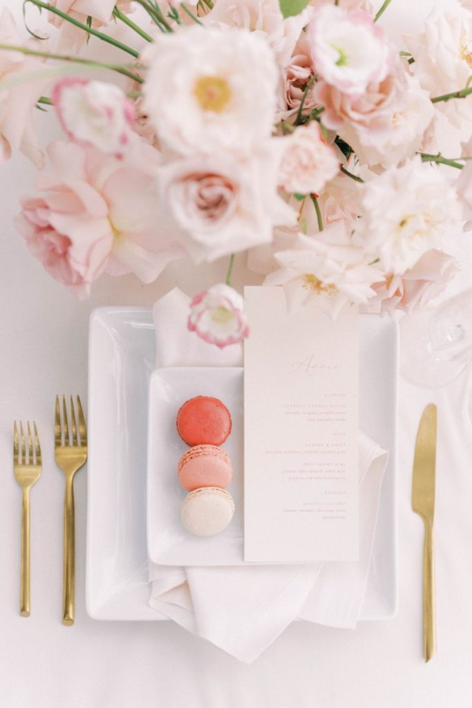 Think pink with this wonderland of wedding inspiration planned and designed by the creative Westcott Weddings. Incorporating high fashion with a whimsical twist, so many stunning shades of pink are at play throughout this styled shoot captured in vivid, al fresco detail by Sarah Tribett Photography around the faux-French countryside at Austin’s sprawling Ma Maison venue and property. The most elegant tablescape was laden with place settings of personal macarons and decorated in romantic shades of blush and baby pink that were accented with passionate pops of red. The outdoor terrain paired with a feminine design beautifully and we love the way these delicate blush blooms from Remi + Gold constructed a dreamy floral arch. Acrylic seating from Marquee Event Rentals – Austin gave off a luxe, modern vibe that carried over into so many other areas. Monochromatic paperie made for an exquisite invitation suite by Fine Day Press that was lettered with the same elegant script throughout. Detail shots captured just how many intricate elements they included, and showed off bling provided by Nicole Mera LLC that was more than enough to steal our attention! There is a rich, European tone that tinges this entire soiree and it has us tickled pink. See it all for yourself below, and read on for a note from the photographer regarding the planning and design behind this pink wonderland wedding inspiration. Cheers!