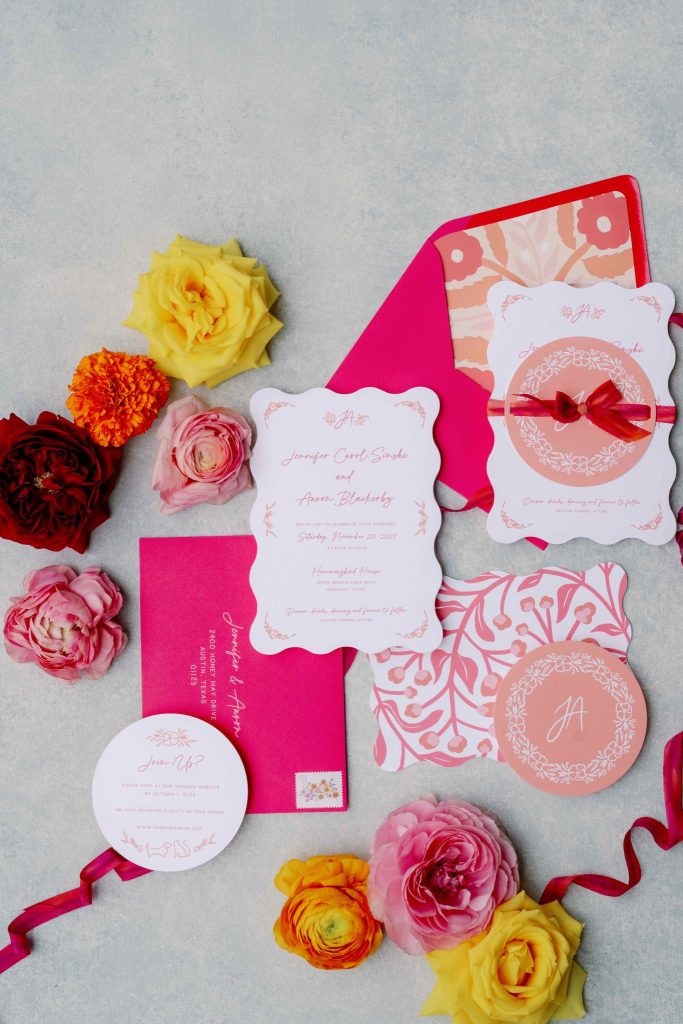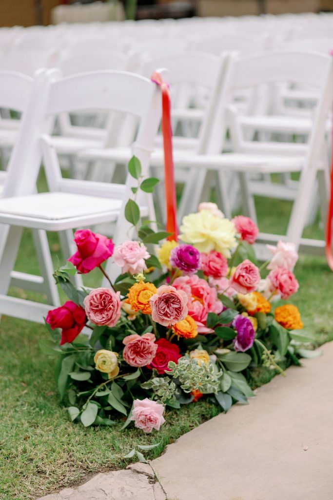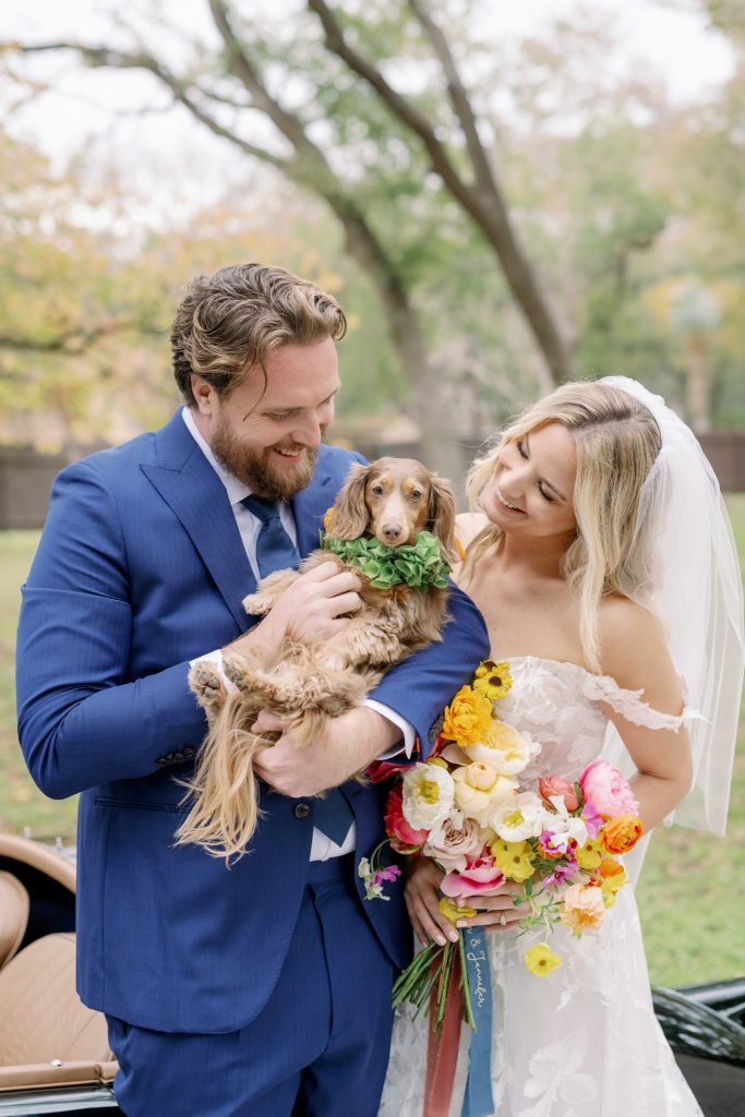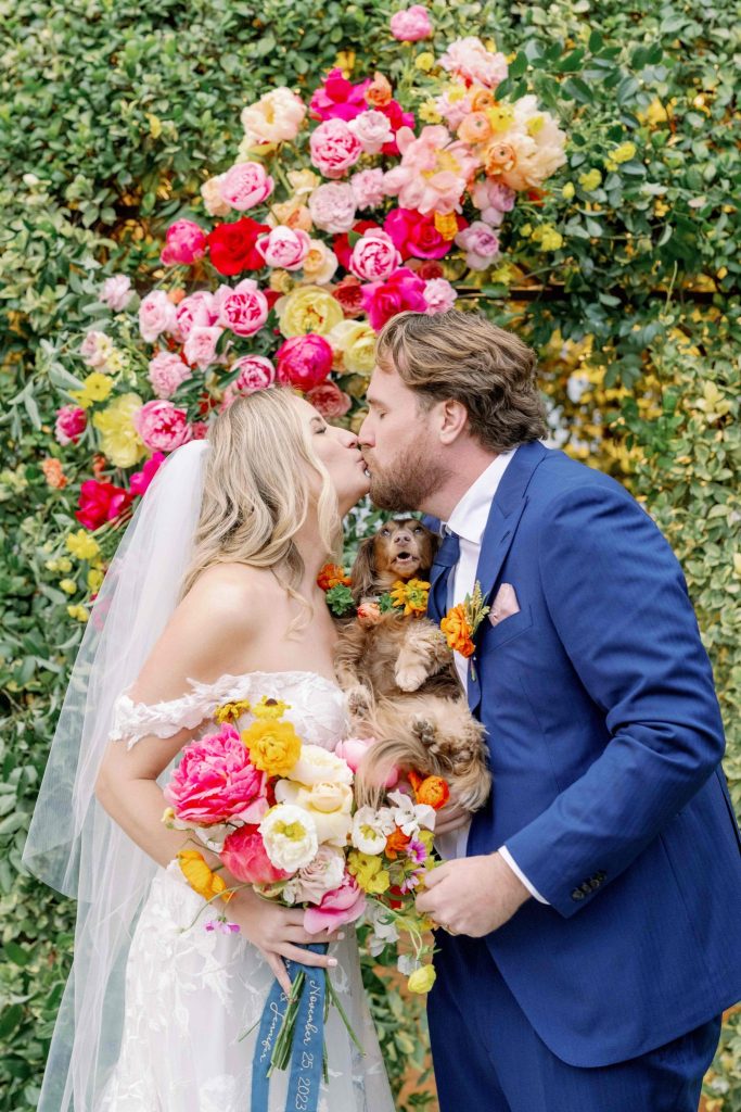 Check out Jennifer + Aaron’s beautiful wedding day surrounded by bright colorful blooms! The color palette of this wedding has us captivated, along with each photo that was effortlessly taken by Wisteria Jade Photography. The cherry on top of the couple’s day was their adorable pup being present for the celebration, making the day a little bit sweeter!