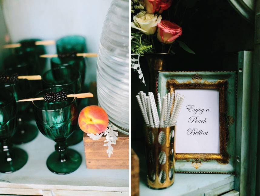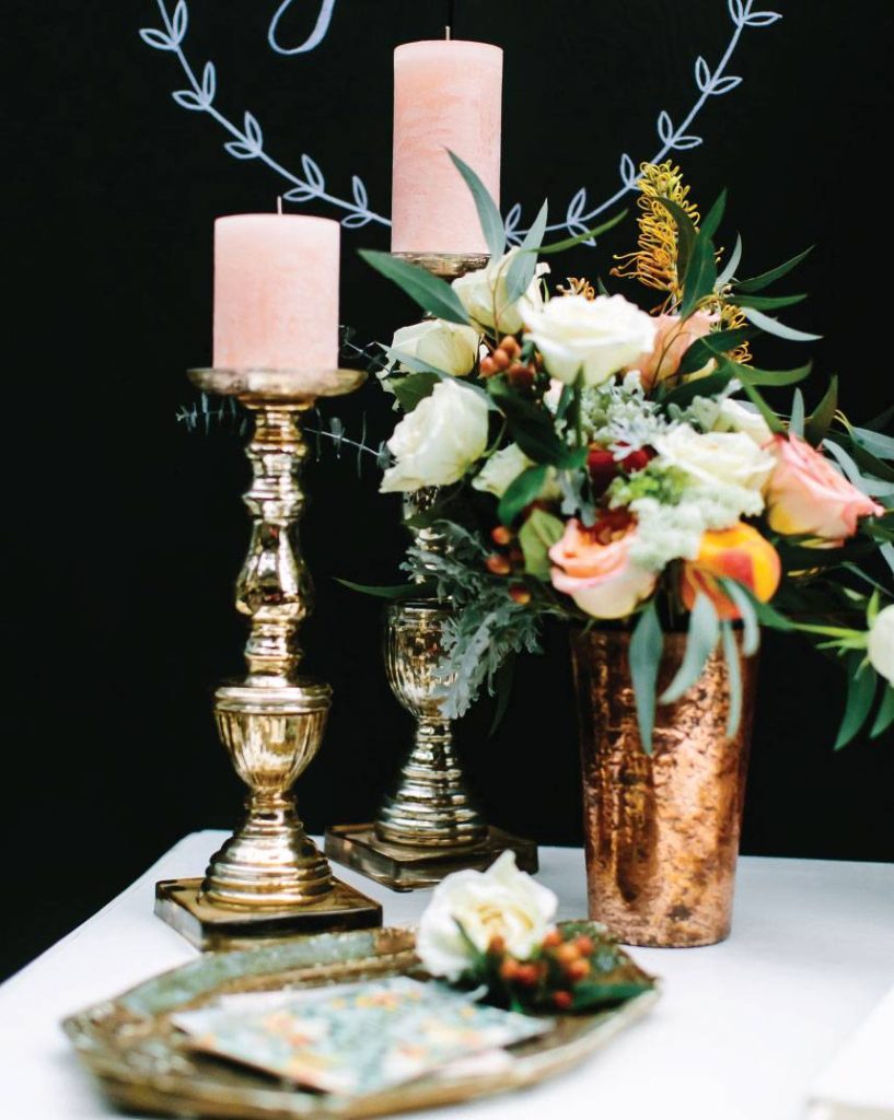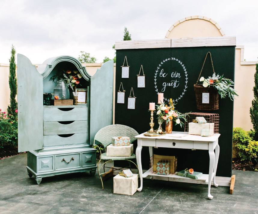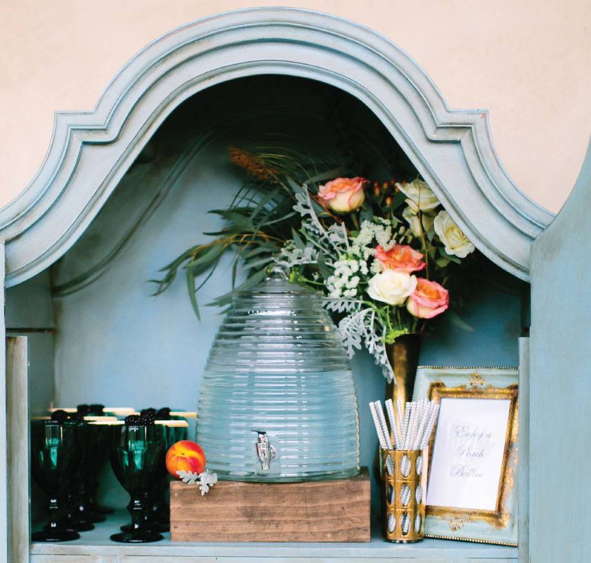 In the inaugural issue of Brides of Austin, we were beyond thrilled to showcase some of our incredible rental companies and share some versatile wedding rentals styled to perfection! This beautiful guest sign-in setting from Bee Lavish at Ma Maison is packed full of pretty rental items including a beautiful blue cabinet, French desk and chalkboard wall creating a cozy and functional sign-in table complete with drink station! Drawing a custom message on the chalk wall greets your guest with a warm welcome and invites them to sign in. And how great is the idea of hanging flower-adorned baskets for cards and unique seating arrangements on the wall? A perfectly placed chair and vintage desk keeps the gifts looking stylish and organized. After, your guests can grab a delicious drink using beautiful teal glasses!  Bee Lavish’s placement of colorful lush blooms and metallic accessories adds richness to the setting and ties it in perfectly to the rest of the wedding! Thank you to AL Gawlik Photography for capturing every perfect detail! See more from this styled shoot by visiting In This Issue online or flip to page 190 in the current issue of Brides of Austin Magazine!