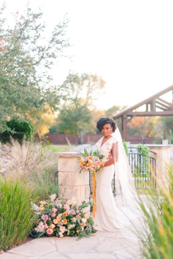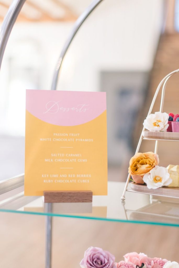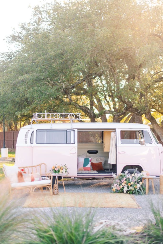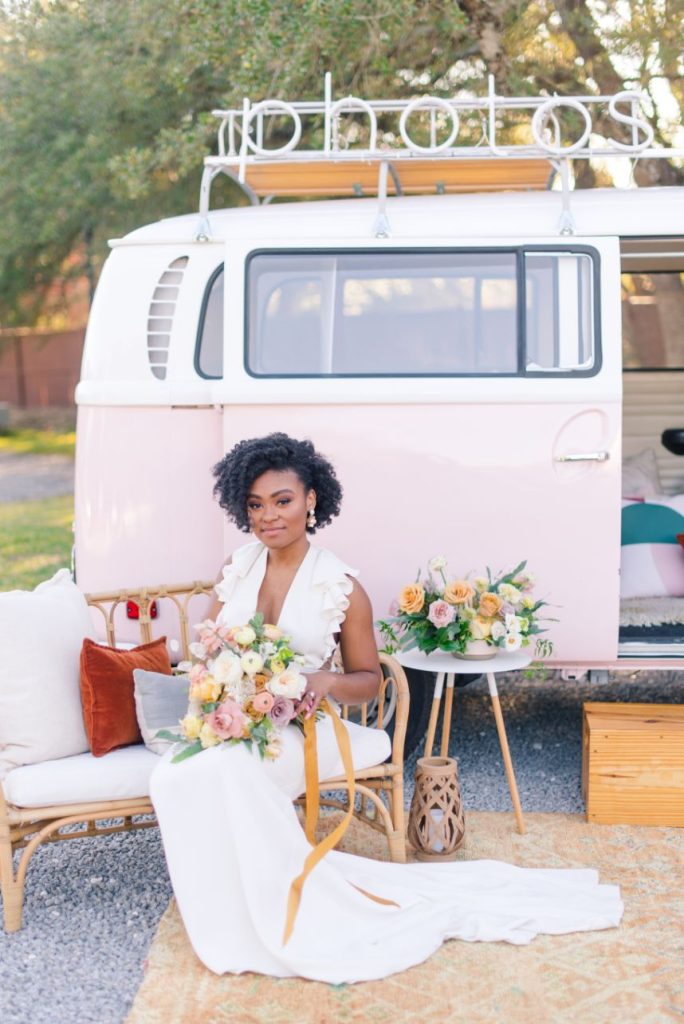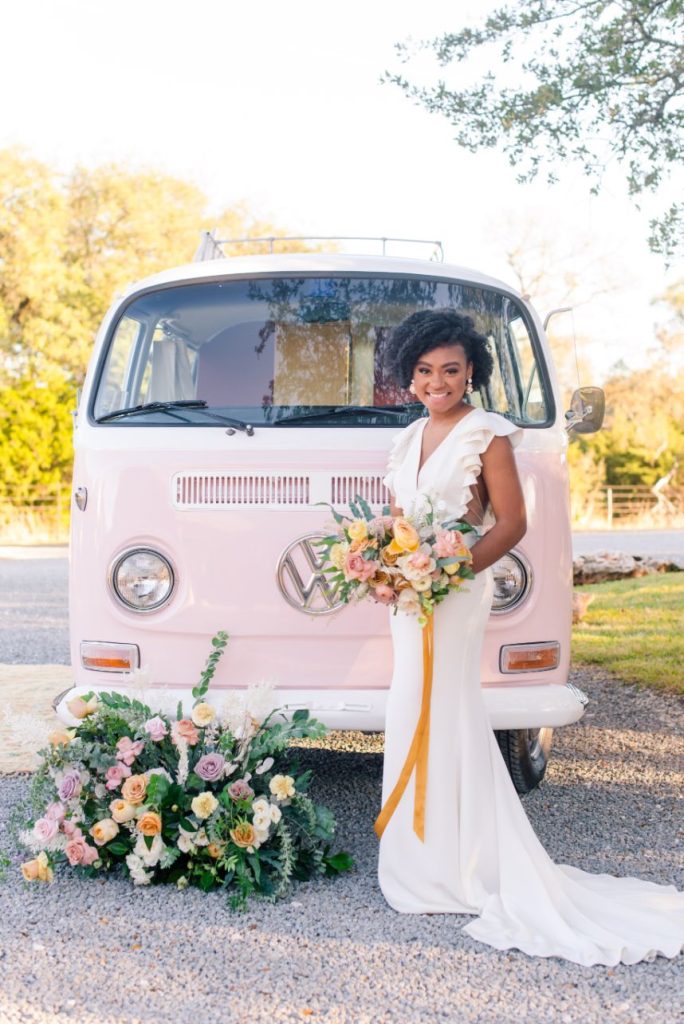 Offering a fun take on nostalgic nuptials, retro meets modern style in this editorial inspiration designed and styled by Heavenly Weddings. See how this planner works in a palette of punchy pastels and geometric shapes for a modern take on the playful 90s style in scenes captured by T Walker Photography. Often described as open and airy, The Milestone | Georgetown invokes a modern farmhouse feel. A beautiful bride models flawless wedding beauty styled by Sunny Hair and Makeup as well as a trumpet gown from Unbridaled featuring dramatic ruffle details on both the front and the back. For the most fun way to have a wedding photo booth, Vannagram & Co. brought their pink Volkswagen van, decorated with retro meets modern throw pillows galore. Colorful invitations and paper goods from Fine Day Press feature stylish typography with bold, die-cut paper in hues of rose, mustard, sage and terra cotta. These translate beautifully as place setting décor for the tablescape, and we love the springy, saturated centerpieces by Wildly Cultivated Floral Design that bring romance to this outdoor reception scene set with fine china, flatware and other pieces from Loot Rentals. For a touch of something sweet, Bonjour Brigadeiro Handcrafted Chocolate & Treats created these adorable brigadeiro desserts – passion fruit chocolate pyramids, salted caramel gems and key lime ruby chocolate cubes with fresh berries. Read on for a note from the planner as well as some of the other talented vendors that brought this retro meets modern wedding inspiration to life. Cheers!