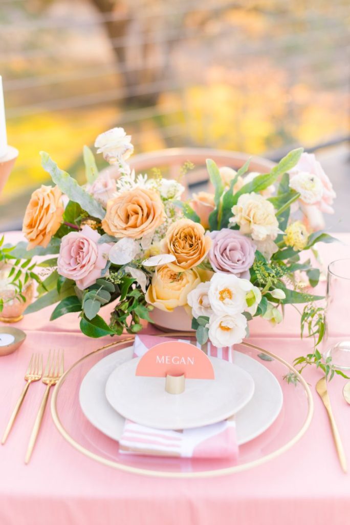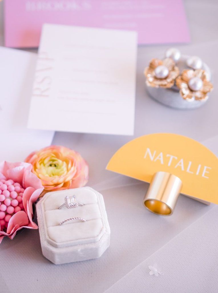 From the calligrapher, Ashley of Fine Day Press: “For this shoot, I was inspired by the unique color palette and a simple, modern sensibility. The design is focused on stylish typography with bold paper hues in rose, mustard, sage and terra cotta. One trend I’m into right now is incorporating die-cut shapes, especially circles and arches, for an unexpected touch!”