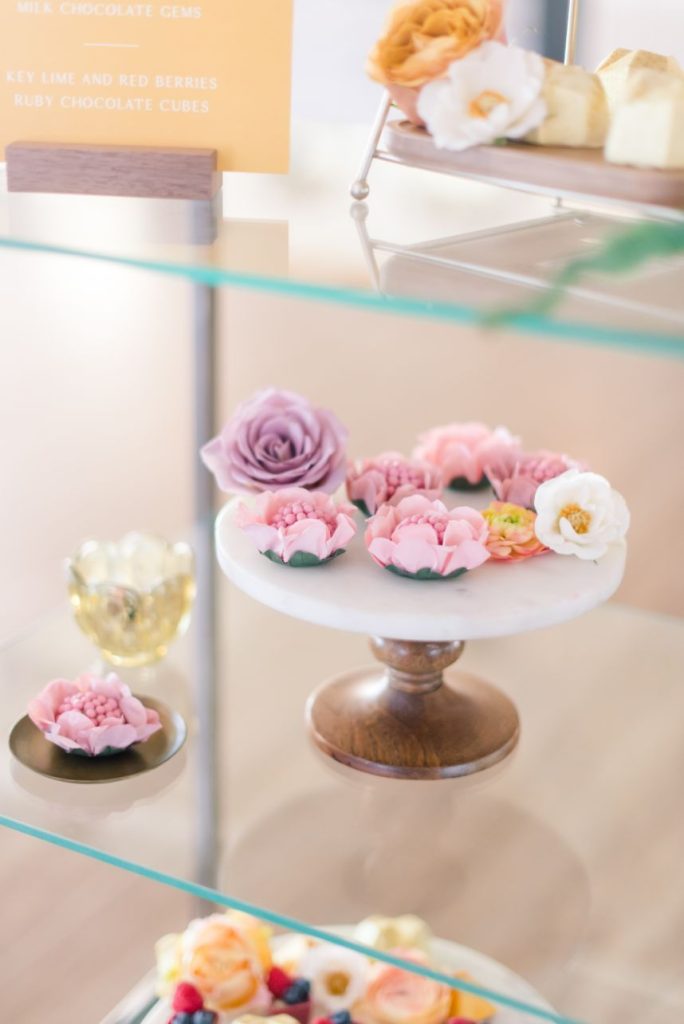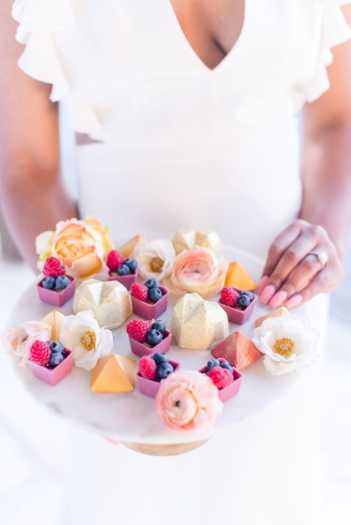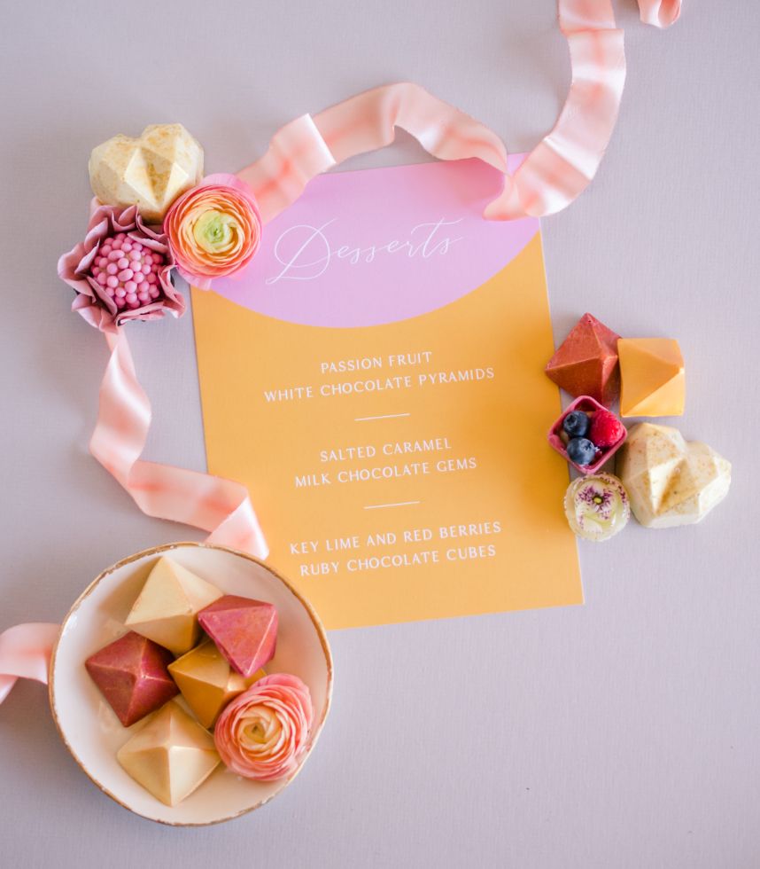 From dessert artist Livia of Bonjour Brigadiero: “I went a bit more retro with the geometric hearts and pyramids. The little cubes were made of ruby chocolate which is known as the 4th type of chocolate (dark, milk, white and now ruby). It is naturally pink as the cocoa bean is pink. It pairs perfectly with citrusy fillings like lemon, key lime and passion fruit due to the acidic taste that ruby chocolate provides. In this case, I used a key lime filling, berry jam and fresh berries on top. As for the actual brigs, I just like to incorporate the flower wrappers as it adds some texture and volume. This time I went with pink shades.”