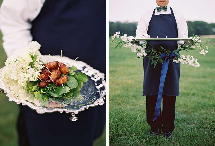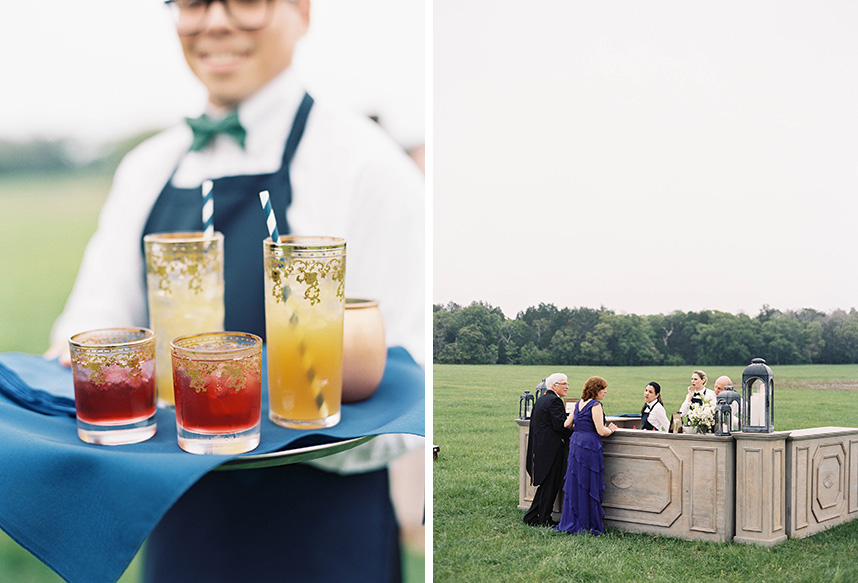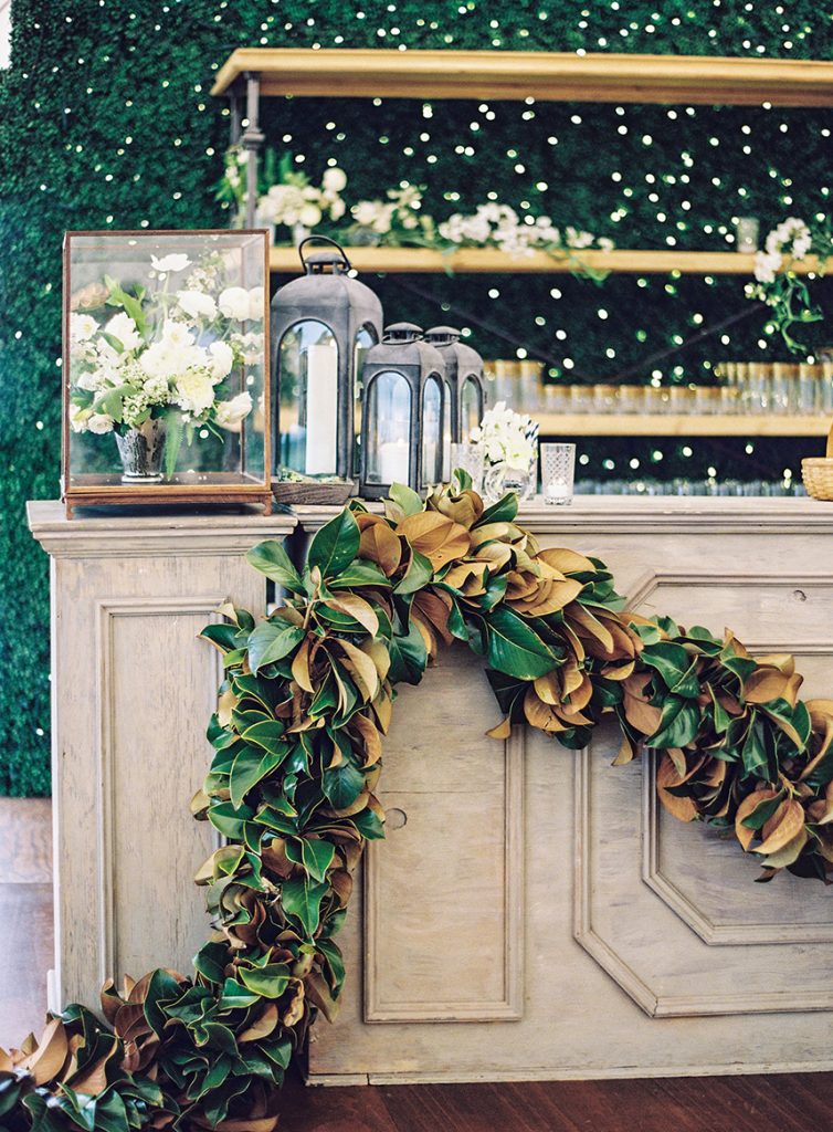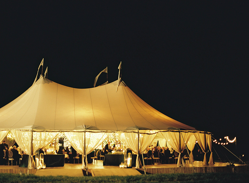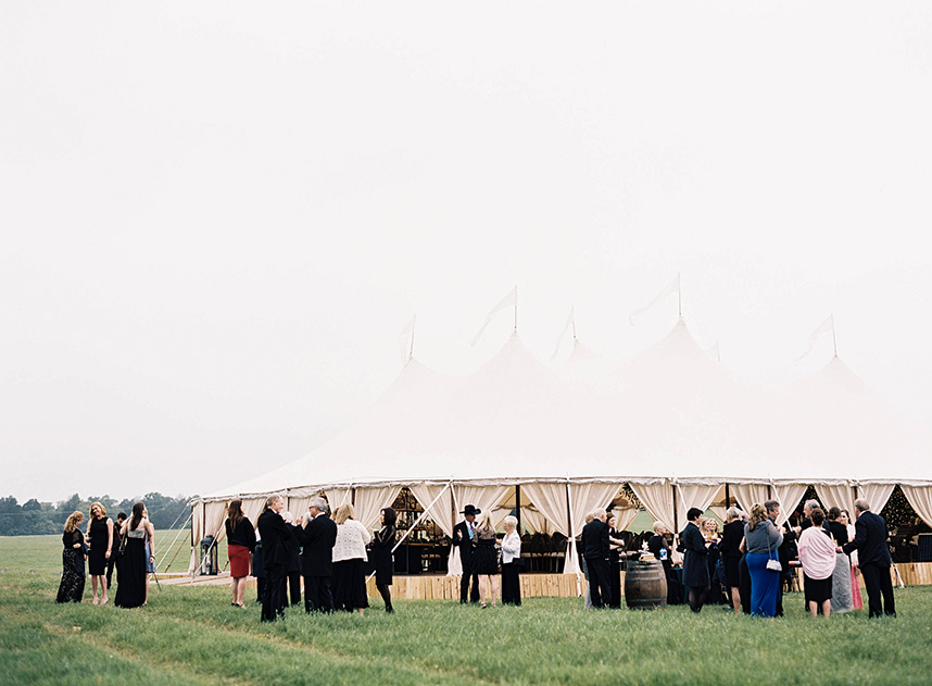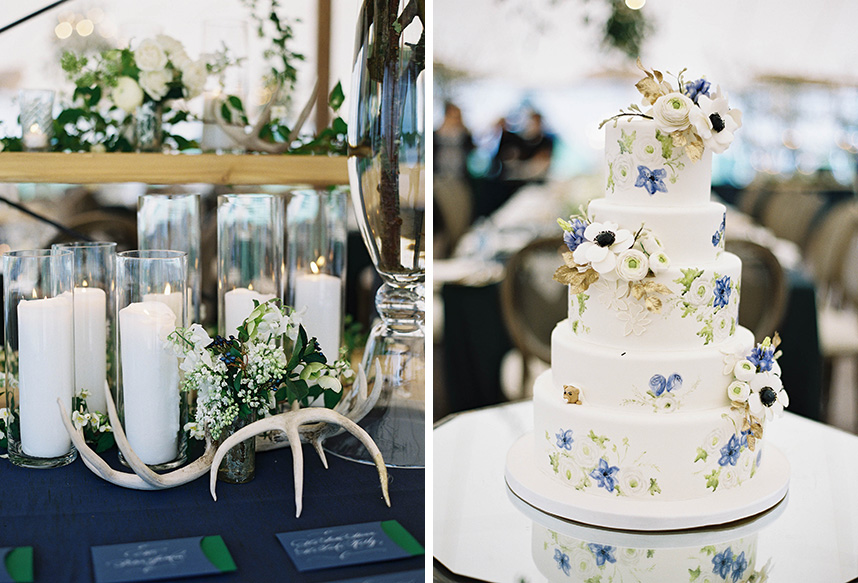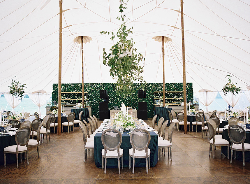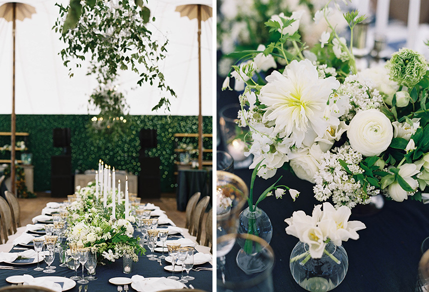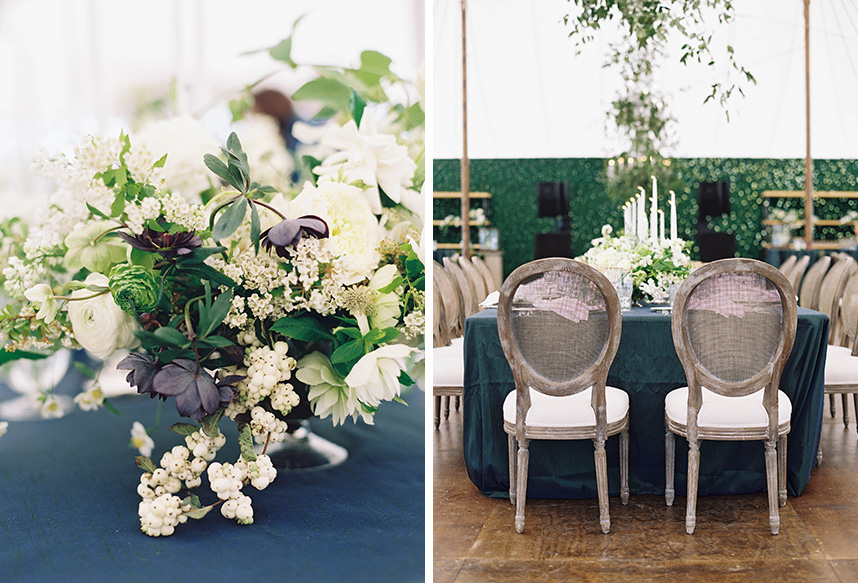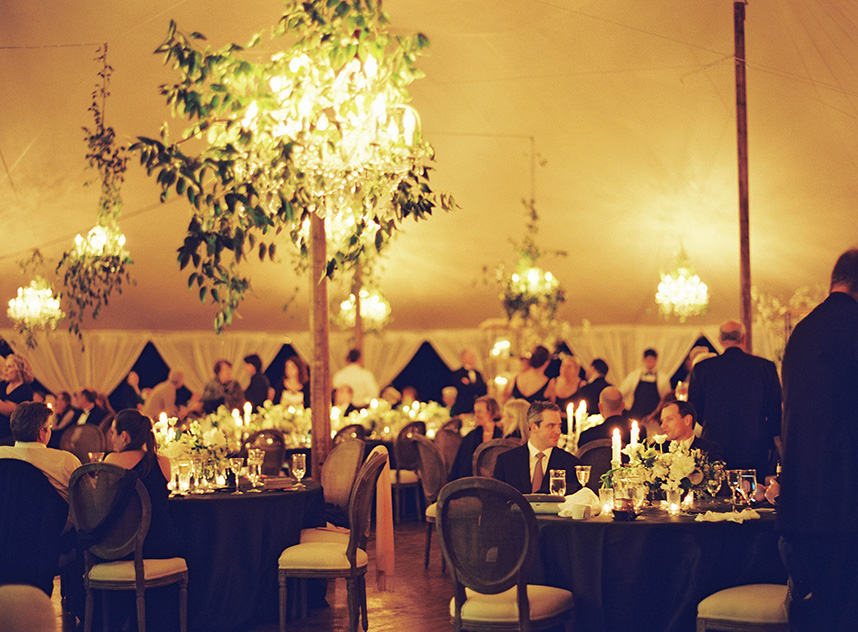 Following the nuptials, guests enjoyed a cocktail hour in the field near the reception tent. Stepping into the reception was unforgettable: the Nouveau Romantics created a stunning room – from the rich, dark wood floors to the dramatic lit flower arrangements dangling from the ceiling. One wall was draped with leaves and lit with hundreds of twinkle lights that set the romantic tone of the evening. Guests dined on tables that featured dripping candles, beautiful white bouquets and china embellished with gold. There was a relaxing nook with gorgeous cream, modern seating with pops of hunter greens and sprays of white flowers. Magnolia draped the bar and tea lights were precariously placed on the grass outside the tent making the reception feel even more exclusive.