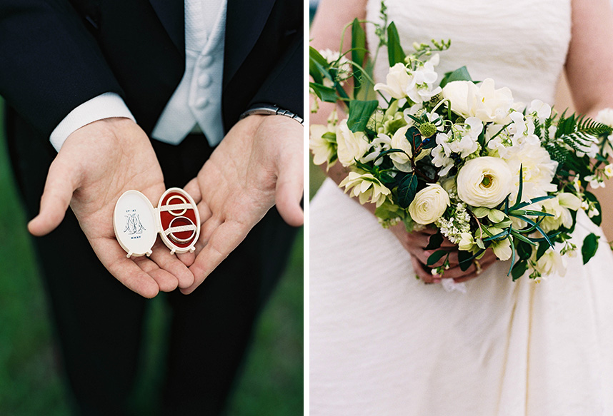 A lovely string quartet played as the bride walked down the aisle. Maggie and Luke’s small, intimate wedding party comprised of family members conveyed an important message – this was two families coming together as one. Their minister had been very good friends with Luke’s mom and his family growing up, which was a special incorporation for him. Maggie and Luke said, “I do,” under trees adorned with striking magnolia garland providing the perfect arch.