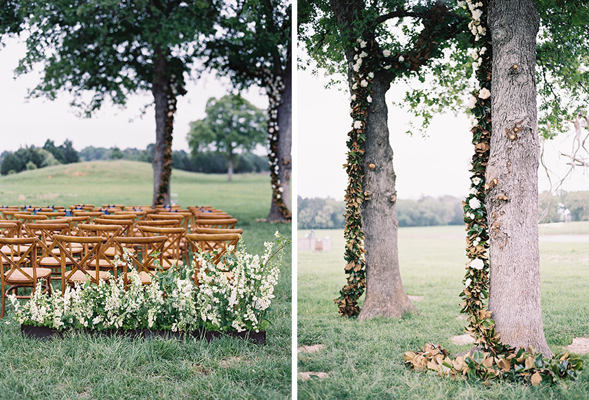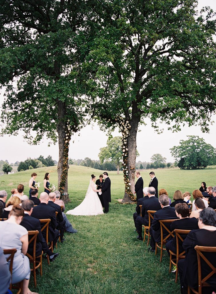 The next step was finding the perfect venue. A friend of one of the planners had inherited her family’s ranch outside Austin and urged the Nouveau Romantics to have a wedding on the land. Maggie and Luke fell in love with the photos, and planned a visit. When they toured the ranch, they found a perfect spot for their nuptials near a sparkling body of water and two large trees that looked as though they were joined as one.