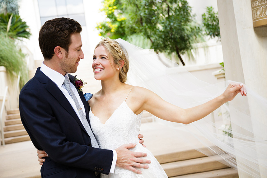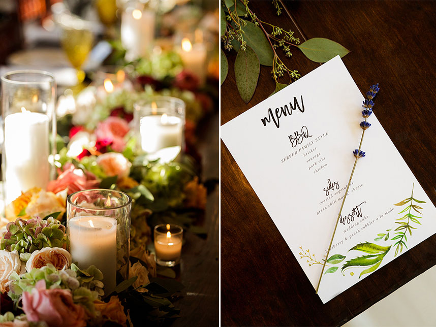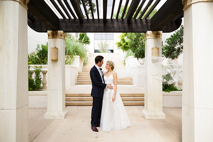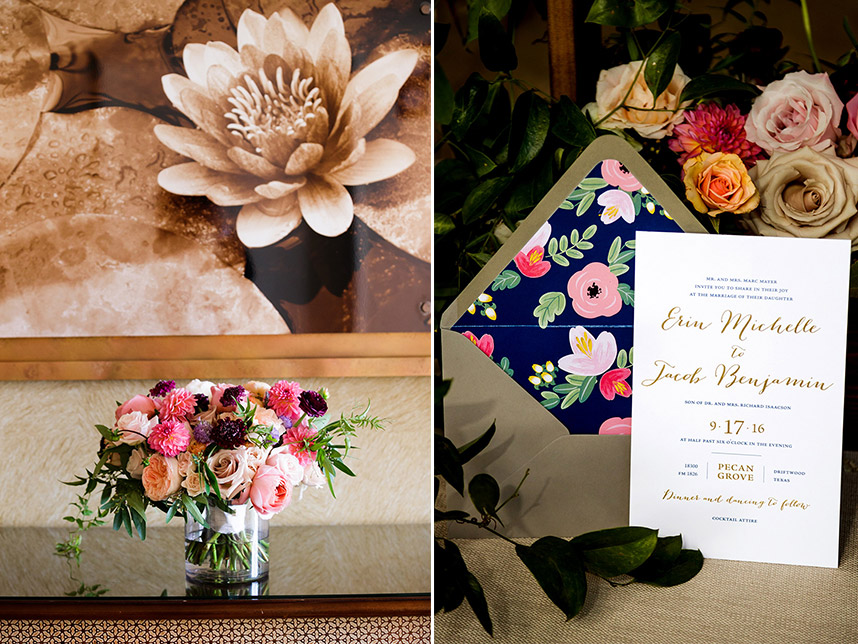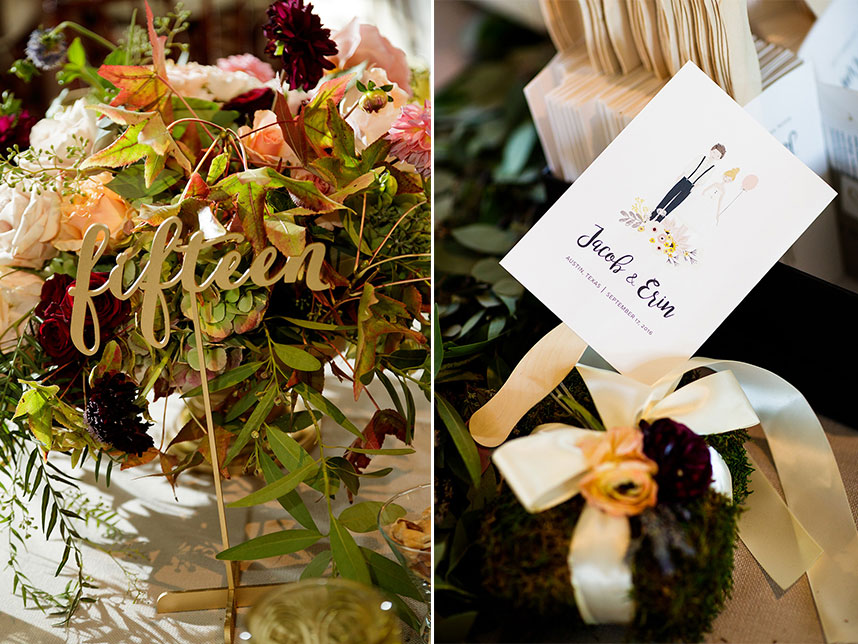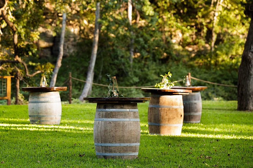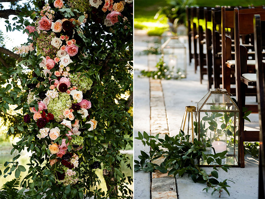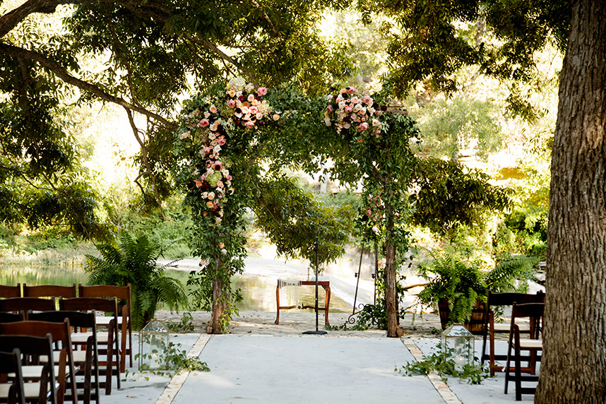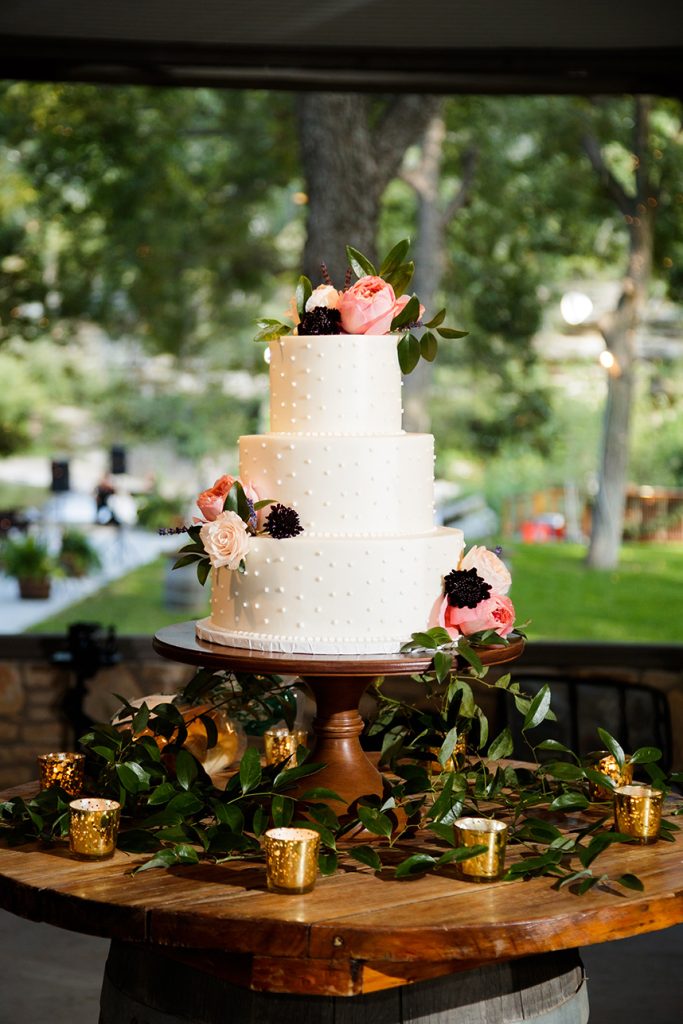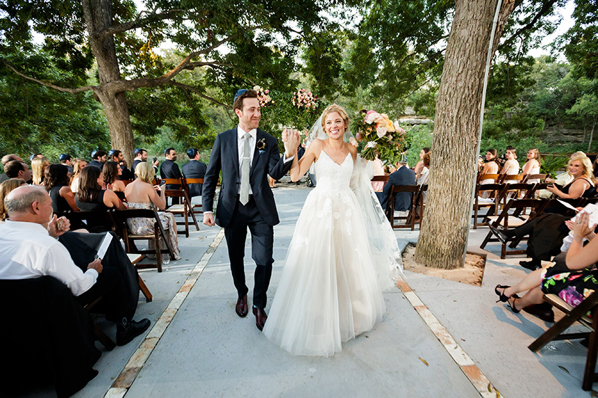 Erin and Jacob’s elegant outdoor wedding was nothing short of a fairytale! Pecan Grove set a magical scene for the couple’s big day with a hilltop building, a cobblestone aisle and a creek, all under a canopy of pecan trees. Floral arrangements and bouquets by Botanical No. 9 added a touch of romance with a variation of gorgeous soft pink hues. After the ceremony, guests were treated to a delicious meal of barbecue from The Salt Lick BBQ. Erin’s wedding cake was a three-tier white cake by Sweet Treets Bakery, embellished with polka dots and stunning blooms matching her bouquet. We’re head over heels for Erin and Jacob’s romantic outdoor celebration! Cheers to these newlyweds!