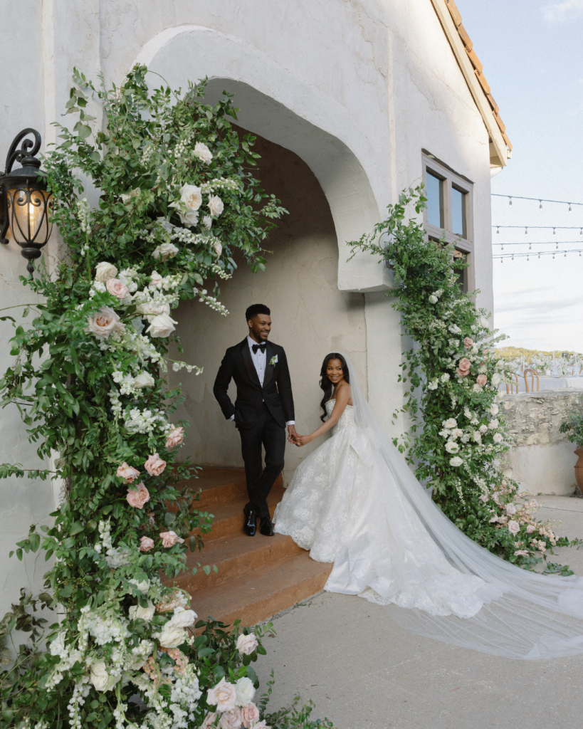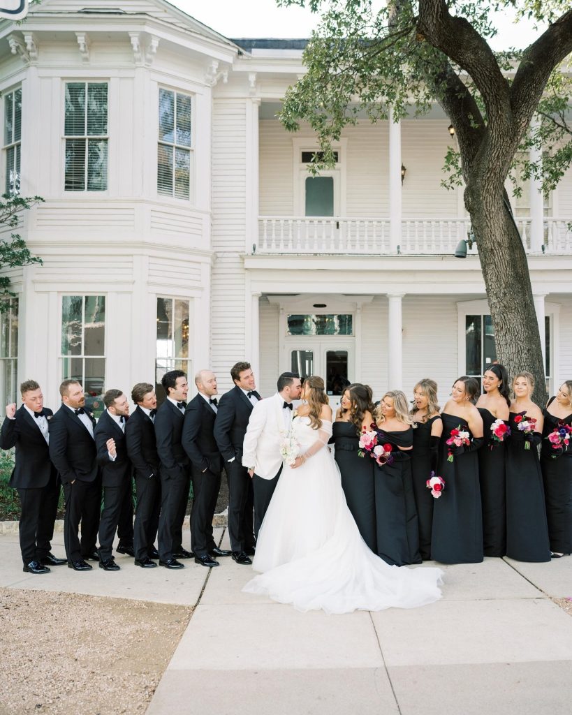 ? Matthew’s crisp white tux paired with Paityn’s stunning off-the-shoulder, long-sleeve gown—and the bridal party in all black. The contrast created a striking, elevated black-and-white look with a garden-inspired twist.