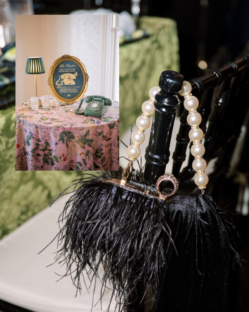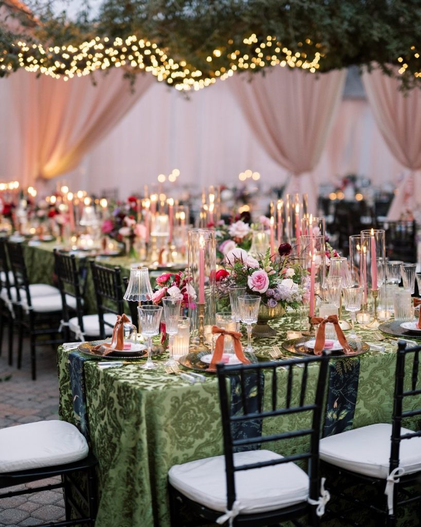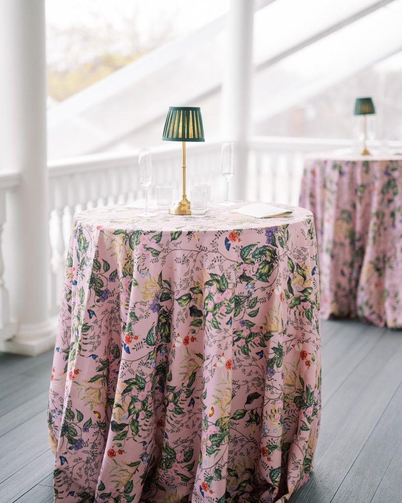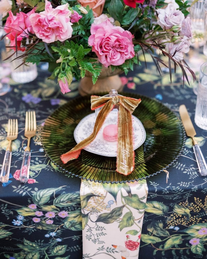 ? Tablescapes dressed with patterned linens, complete with glass cloche domes and custom ribbon seating arrangements—such a chic detail!