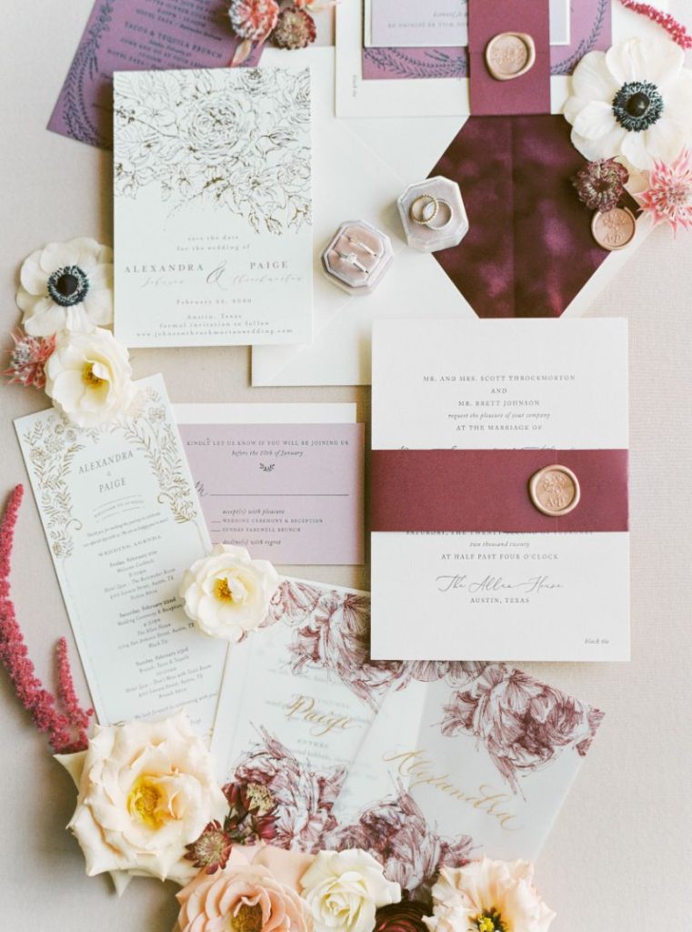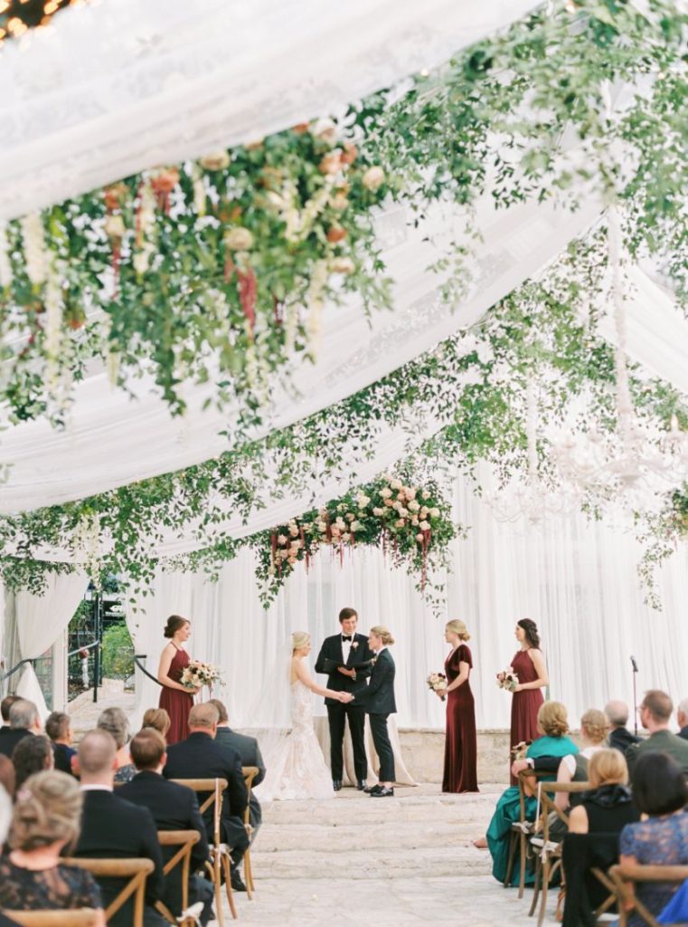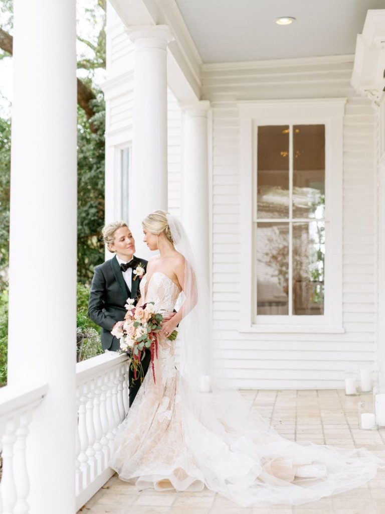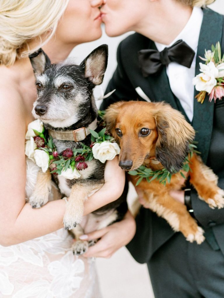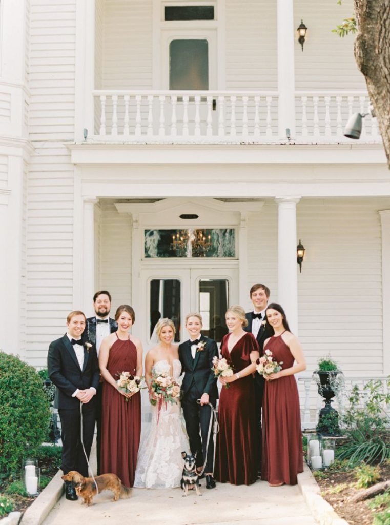 This romantic, European-inspired garden party is truly the wedding of our dreams! Featured on the cover of our Fall/Winter 2020 issue of the Brides of Austin, Alexandra and Paige are simply the most gorgeous, elegant brides we have ever seen. Alex looks stunning in her beautiful strapless, mermaid-style bridal gown from Unbridaled, with intricate floral lace details and a plunging neckline that went with their “European Black Tie” theme so well. Dreamy hanging florals and greenery from Stems Floral Design + Event Styling set a gardenesque atmosphere in their tented ceremony-turned-reception space at the mesmerizing Allan House – it almost looks too good to be true. We’re captivated by this whole scene, as burgundy, blush, eucalyptus and gold decor from both Loot Rentals and Premiere Events made for picture-perfect tablescapes and the most stylish lounge area for guests to relax in. Plush Party Band ensured guests were in for a great night, as they played the couple’s favorite music and kept the dance floor packed all evening long. Scroll to see the sweetest (and furriest) guests that were able to attend this garden party, thanks to The Pet Gal! The flawless cover shot, along with all the adorable photos featured below from Feather & Twine make it impossible to stop staring at this oh-so dreamy day. You do not want to miss all the details of this celebration that truly made our wedding dreams come to life! Cheers to the Throckmortons!