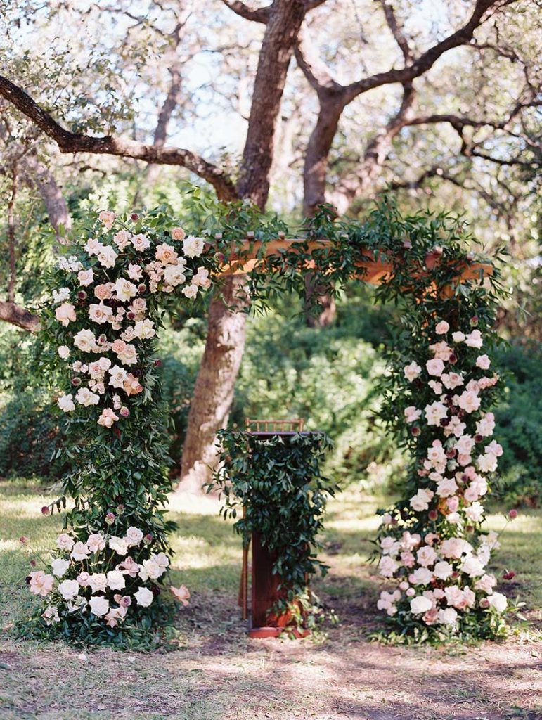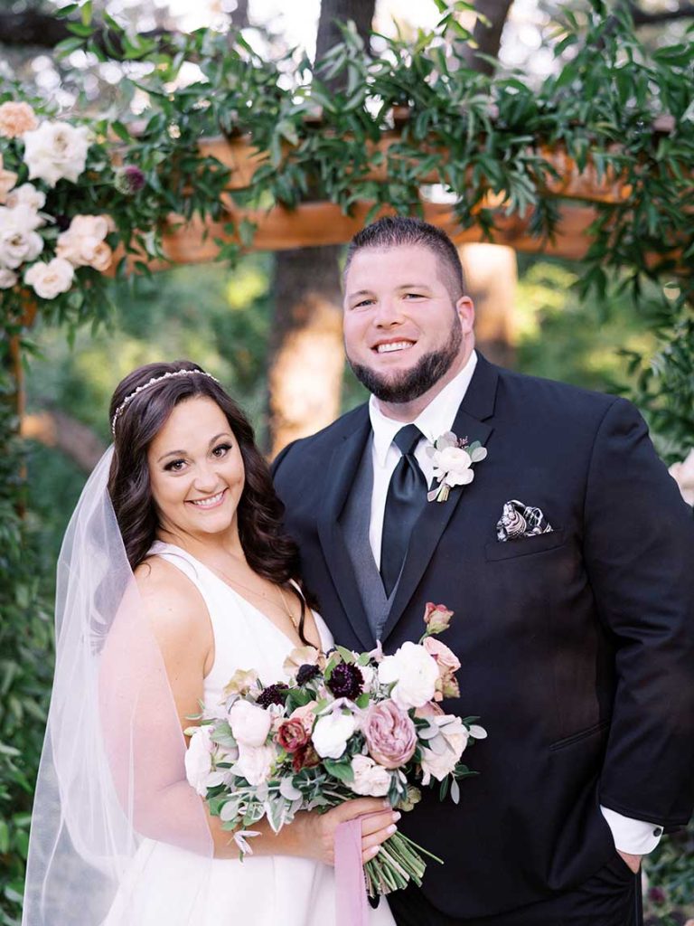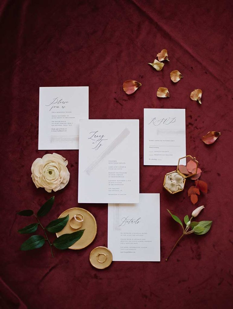 This romantic outdoor soirée was long awaited by both the bride’s and groom’s family alike – even before the now happy couple had met! The groom’s father works with the bride’s grandmother, and the two had been trying to set up Laney Schorp and Ty Cloud for years. After finally meeting at Laney’s family Christmas party, they knew almost immediately that they should have listened, and they were definitely meant to be together! With the dreamy invitation suite from Fine Day Press, it was expected that the Cloud’s big day would be oh-so-elegant, and that it was! Andria Leigh Events planned their day to perfection, without missing a detail. Remi + Gold brought the most stunning florals (as always!), in mauve, maroon and ivory, which adorned the altar and cascaded the table centerpieces. And nonetheless, Premiere Events topped off the celebration with elegant decor and rental items. Check out the stunning images captured by Caitlin Rose Photography below!