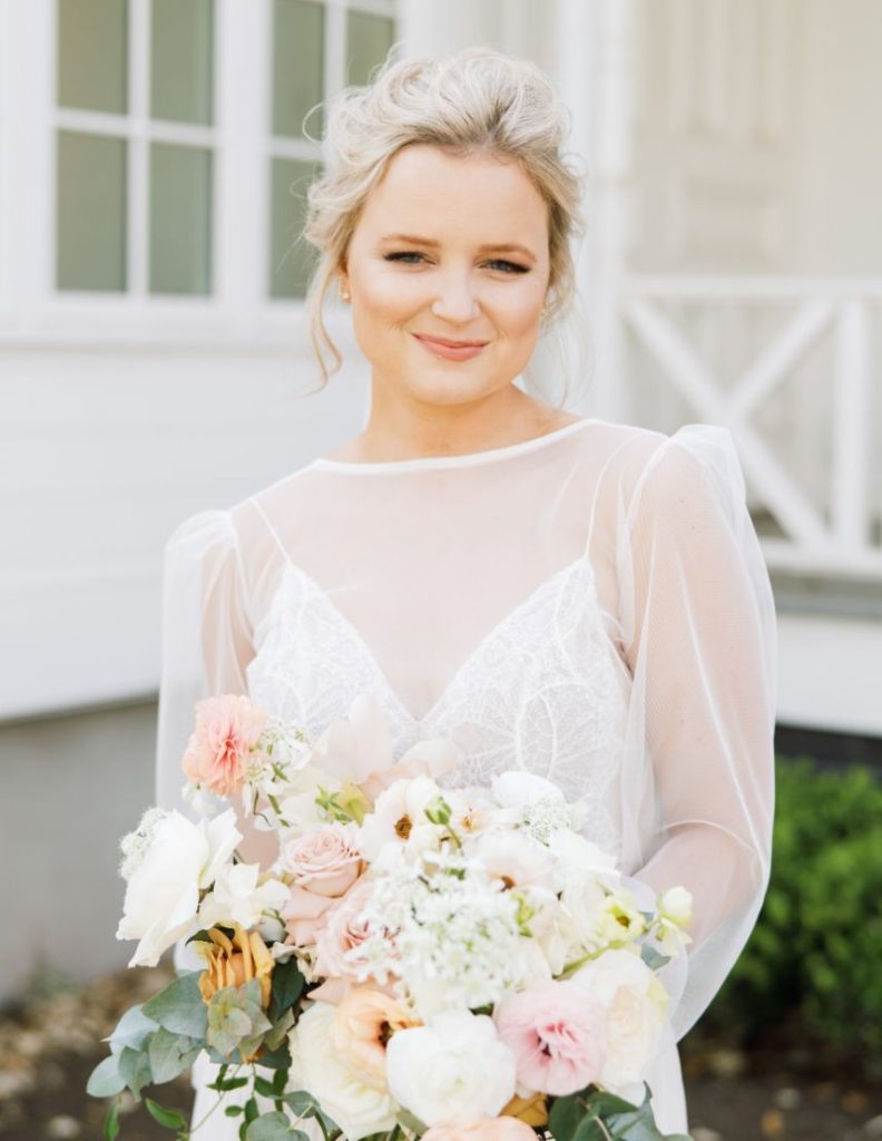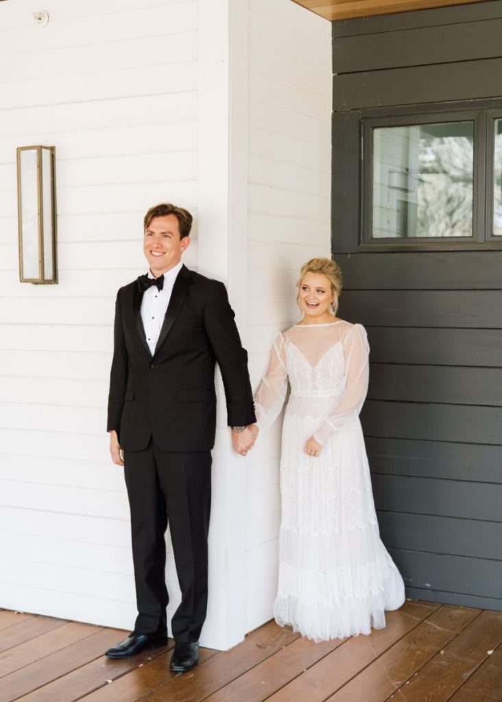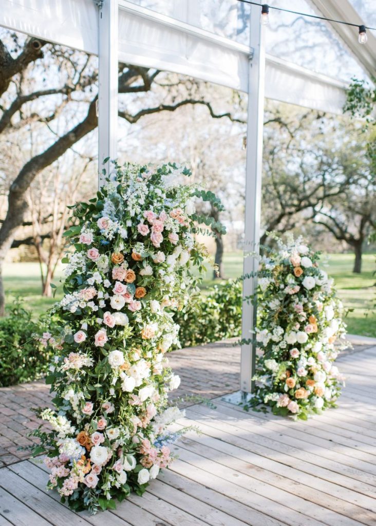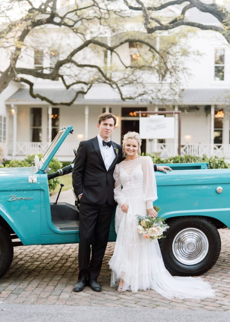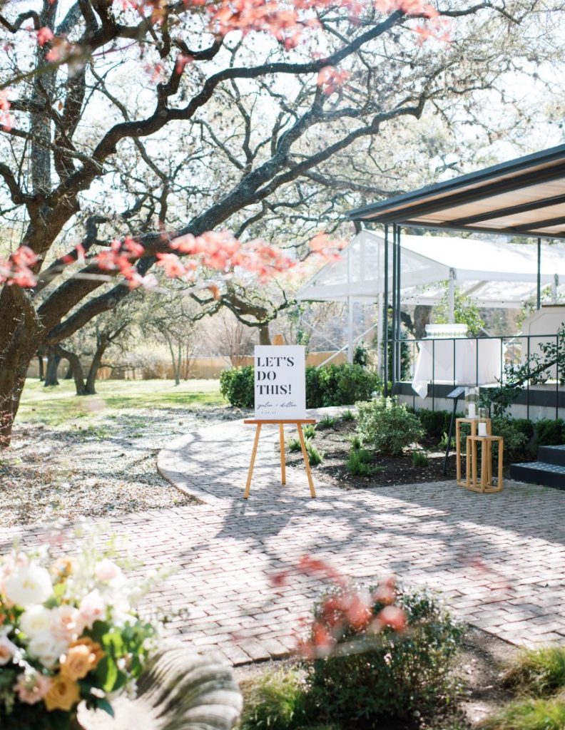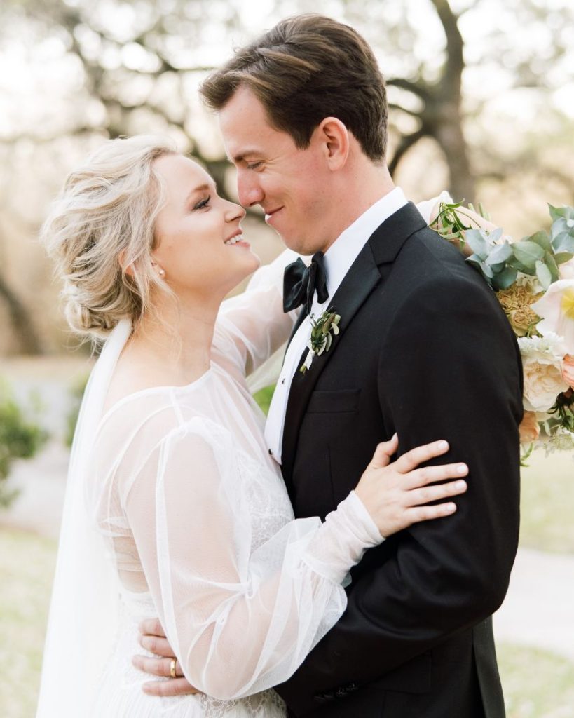 We love the easy-going mentality of Galen and Dillon’s romantic Texas Garden Party wedding. The Texas couple met during their time at TCU. However, the couple didn’t become more than just acquaintances until their graduation ceremony when they sat next to each other. Galen and Dillon describe themselves as “low key easy-going people” and wanted that to translate into their special day. Ultimately, they accomplished this with their easy, simple, and elegant garden party. Every detail of their wedding felt so delicate and romantic. The intimate ceremony accurately represented the couple being gospel-focused and the guests hearing directly from them their marriage intentions. We love that Galen and Dillon opted to do a first touch to save the surprise of the first look for the altar. Dillon prayed over his soon-to-be bride at the first touch, and this moment became one of the couple’s favorite memories of the day. The whole room gazed at Galen as she walked down the aisle to her groom in a gown fit for a Texas garden party with sheer sleeves. At the altar, Galen’s father handed her over to Dillon, where the couple exchanged heartfelt handwritten vows that had the whole room in tears. After the ceremony, the couple flipped their tented space into their Texas garden party reception of their dreams with the help of Widely Cultivated Floral Design. Lush greens, muted florals, and candle-lit light made the space feel so romantic but still a true representation of the newlywed’s style. Guests enjoyed cake from Sweet Treets Bakery as they partied and danced in feather boas with the live band. Finally, the couple enjoyed a private dance together before making their grand exit into a baby blue bronco as husband and wife. Keep scrolling to see more of this Texas garden party wedding with a special note from the bride. Cheers to Mr. and Mrs. Smith!
