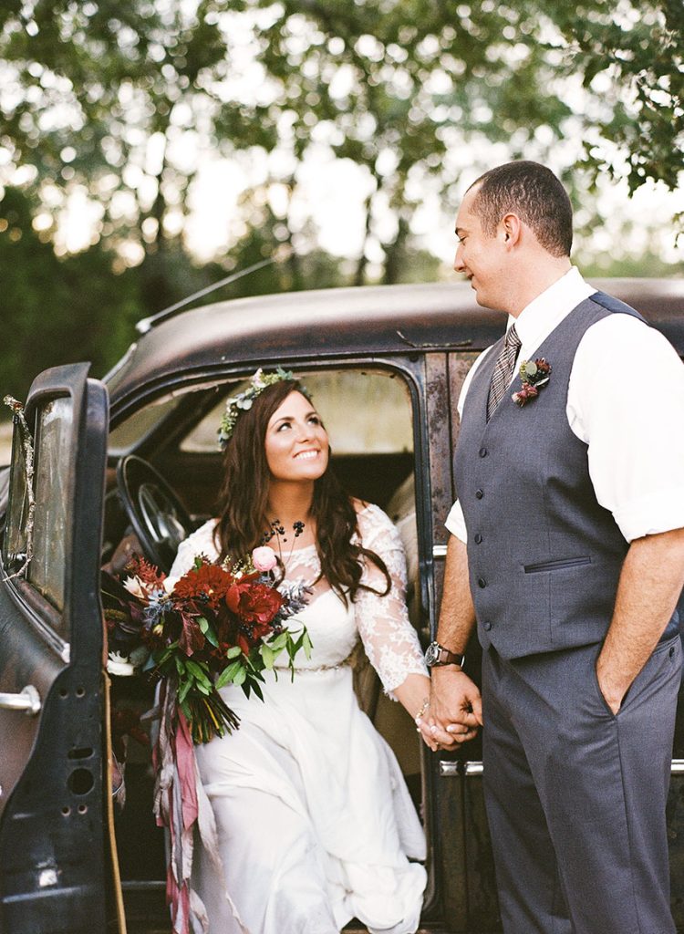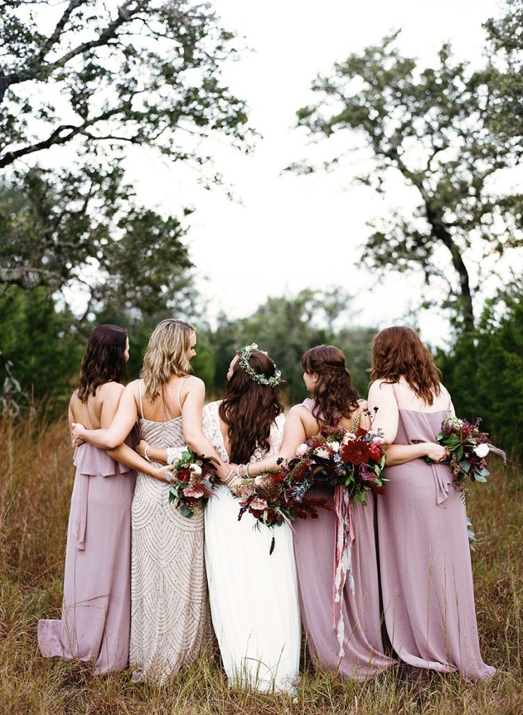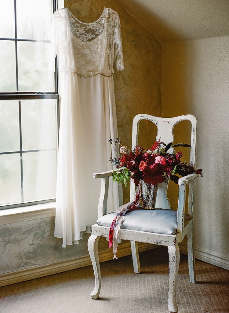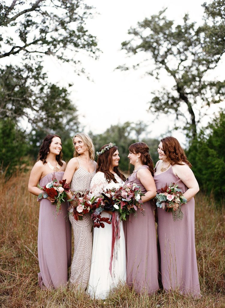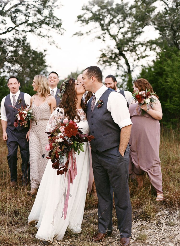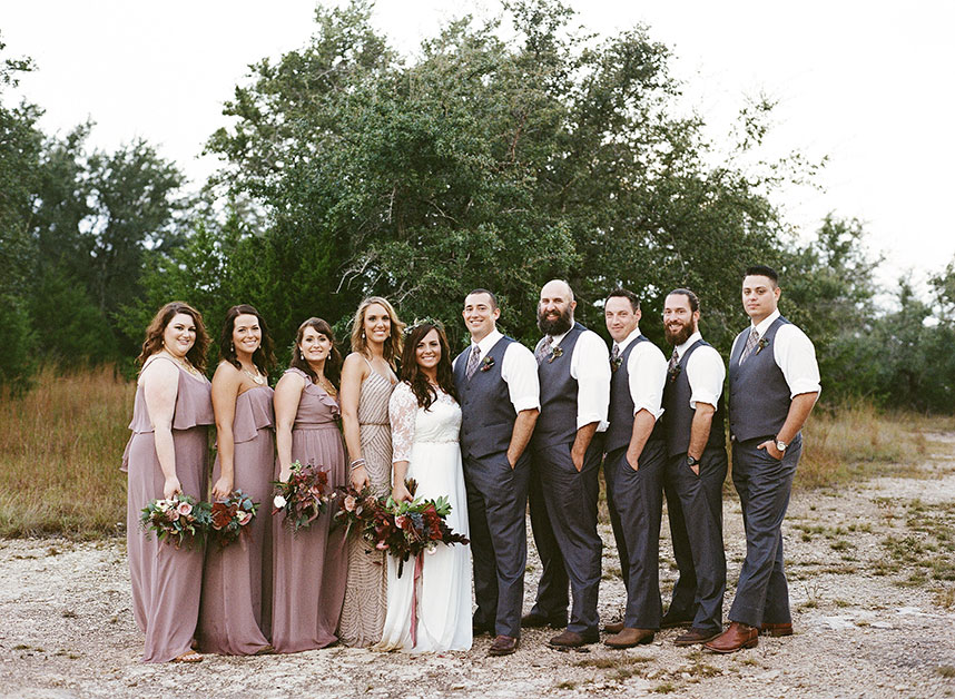 HUES SHE USED: The bride envisioned a color scheme that would look natural in the Hill Country setting, while giving off an intimate, romantic and bohemian vibe. With it being fall, the couple wanted hints of deep red and lots of greenery to warm up the space. The wedding party attire helped pull the theme together – the girls wore mismatched gowns with pops of gold, and the guys wore dark grey pants and vests, with chocolate and beige ties and brown boots.