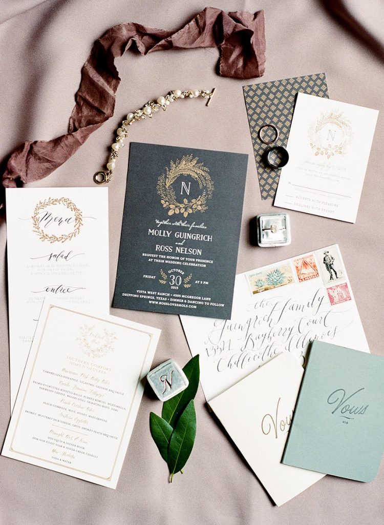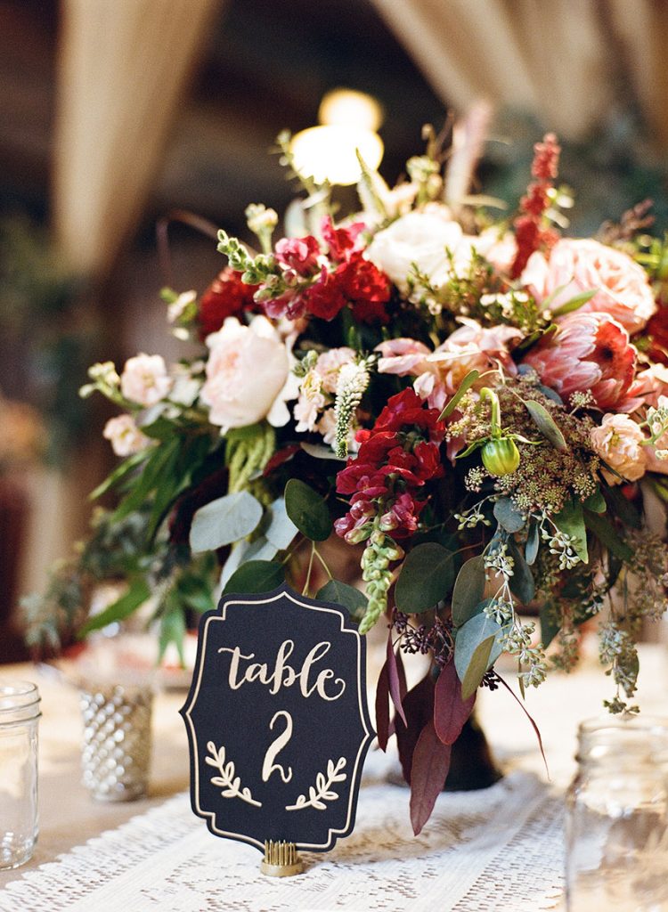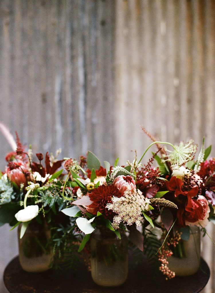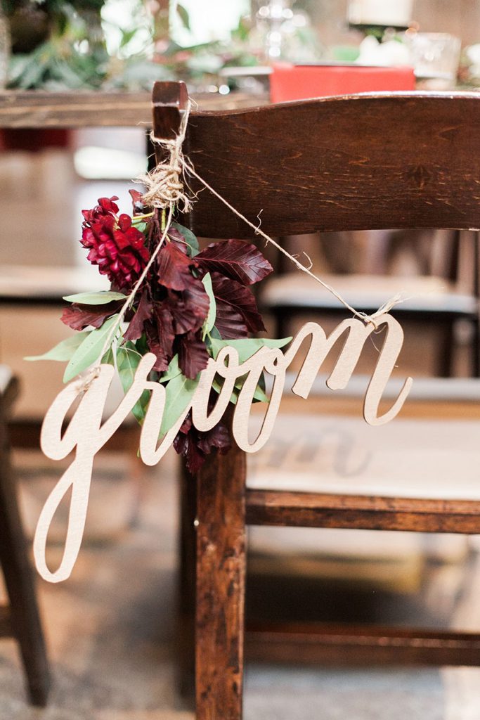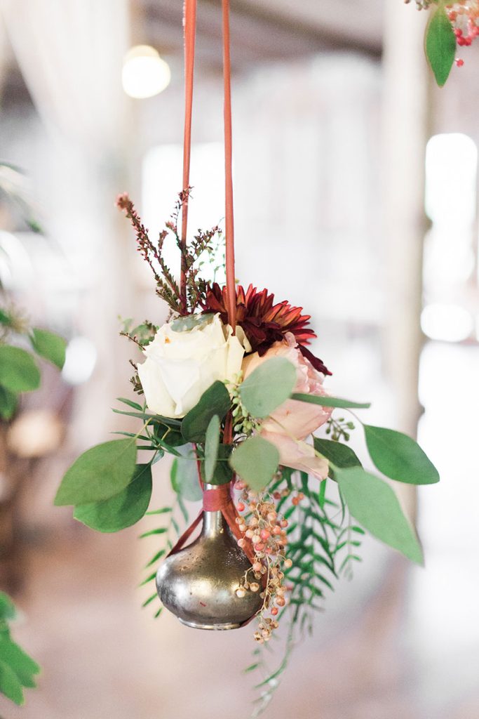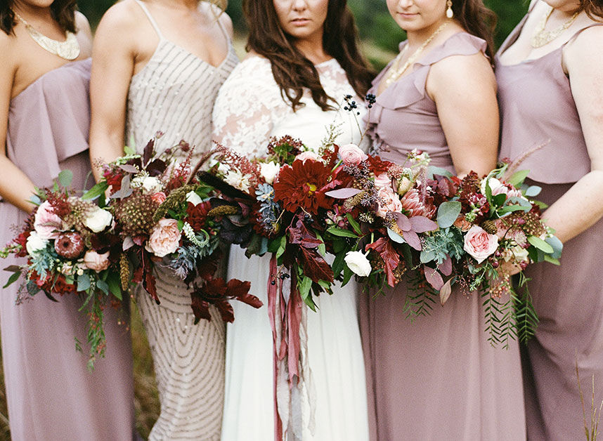 HUES SHE USED: The bride envisioned a color scheme that would look natural in the Hill Country setting, while giving off an intimate, romantic and bohemian vibe. With it being fall, the couple wanted hints of deep red and lots of greenery to warm up the space. The wedding party attire helped pull the theme together – the girls wore mismatched gowns with pops of gold, and the guys wore dark grey pants and vests, with chocolate and beige ties and brown boots.