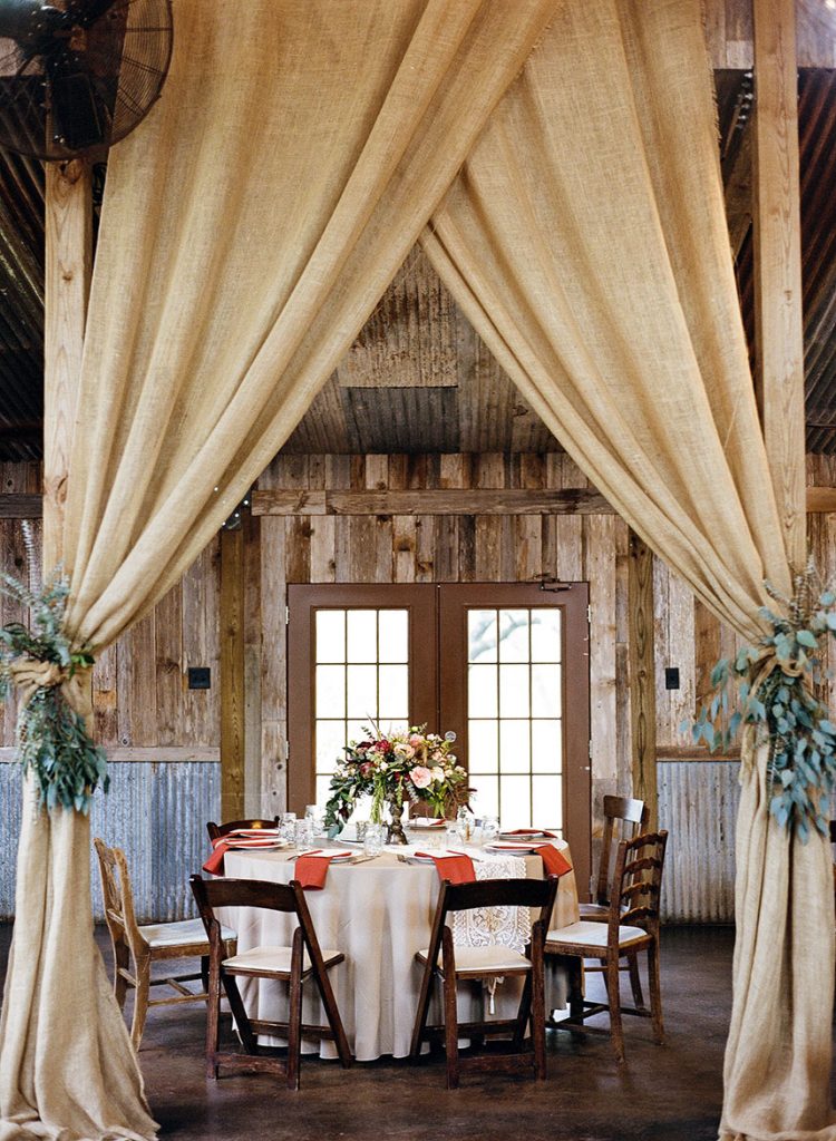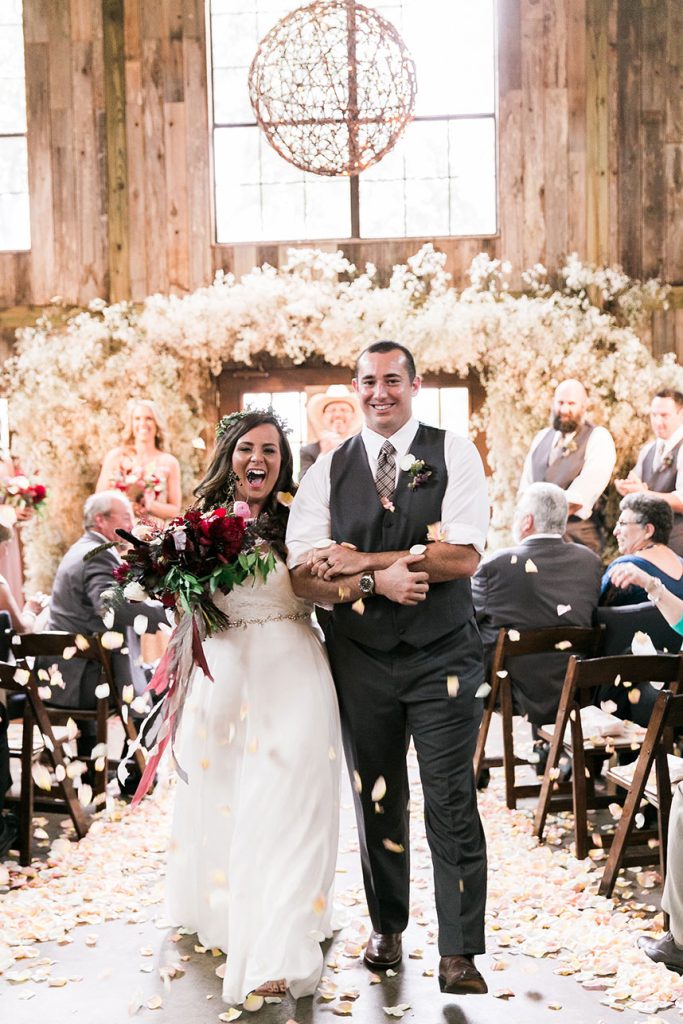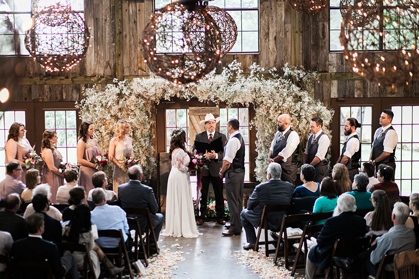 AMAZING ALTAR: Due to storms, the ceremony was moved indoors, but the altar turned out to be gorgeous. The couple purchased vintage barn doors that were used as the backdrop for the altar with large arrangements of florals and greenery on a rustic table in front of the doors. There was also a mix of pillar candles and flowers on top of the table that gave it an extra pop. A custom wine box sat on the altar that they filled with love letters during the ceremony. The altar was also adorned with dried baby’s breath around the large French doors, which let in natural light and views of the ranch.