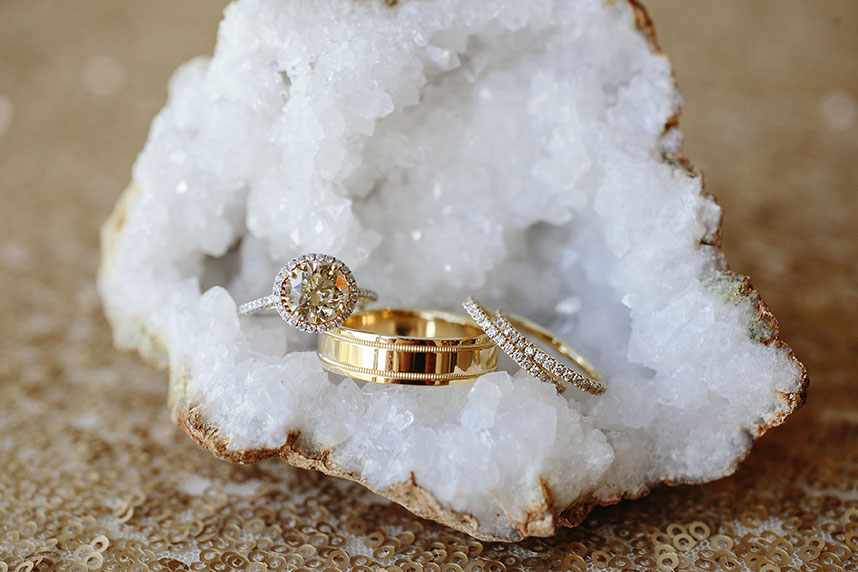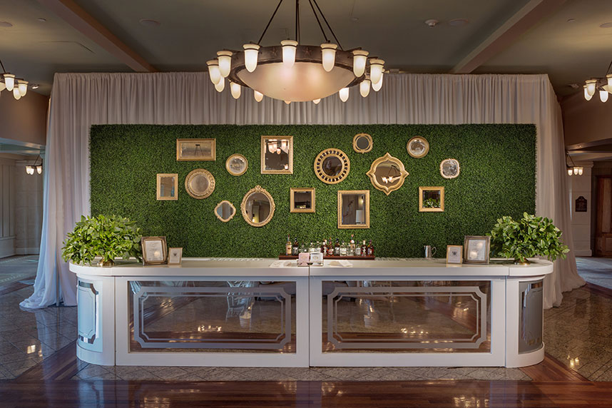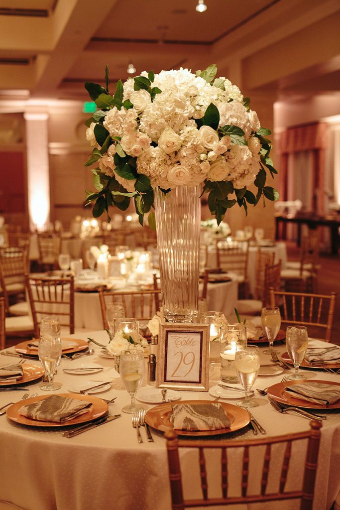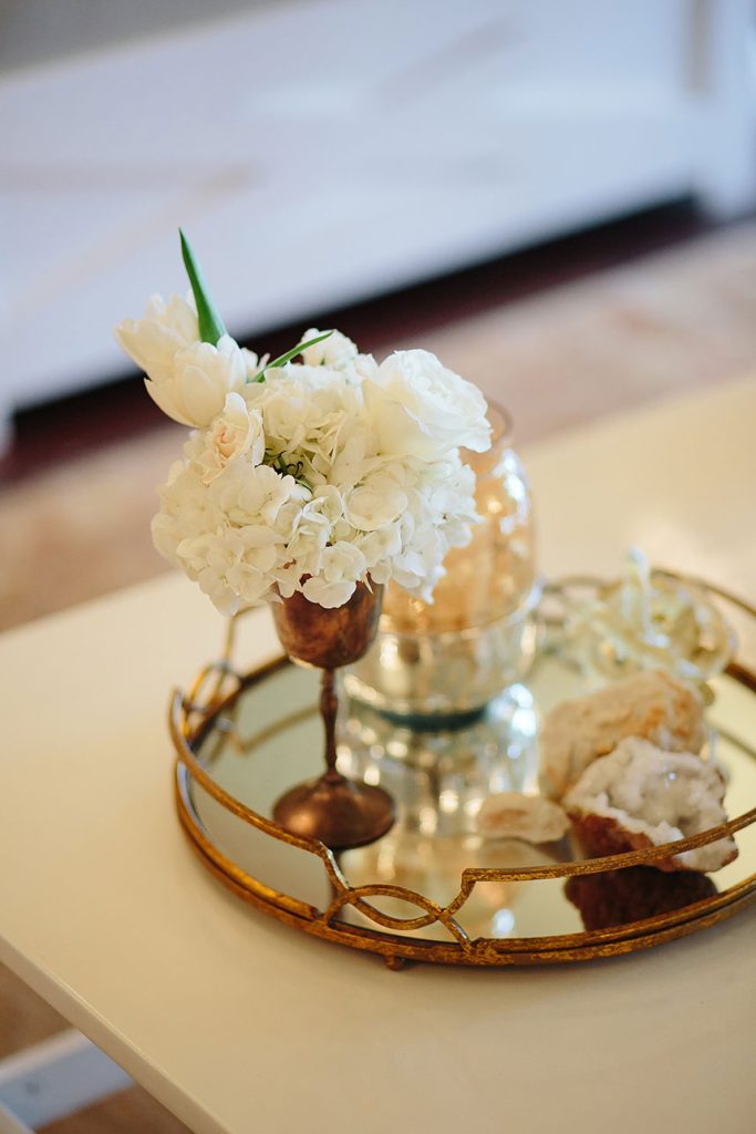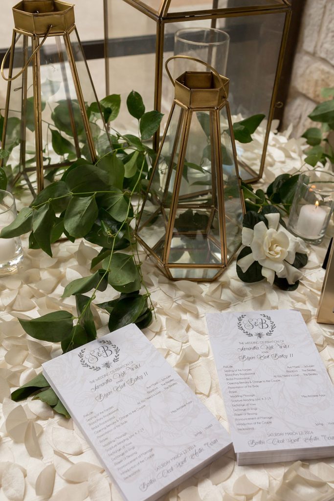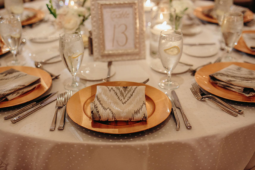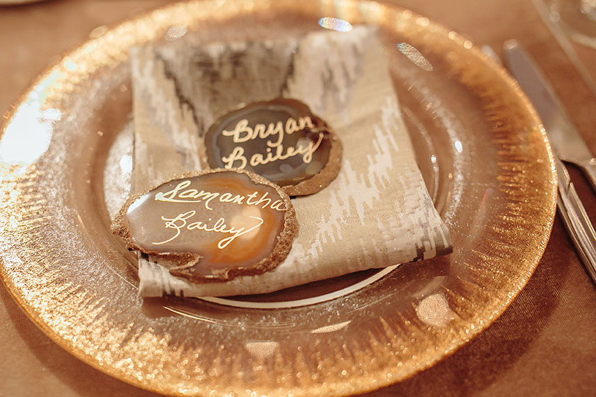 CONTEMPORARY ENGLISH GARDEN: Samantha is an interior designer and wanted all aspects, including linens, décor, lighting and florals, to feel as though they were selected using contemporary patterned linens and place settings. They also incorporated Bryan’s geology background using agate slices as place settings and quartz décor. They wanted guests to see their touch in each aspect of the design. Samantha used hues of white, gold and green to achieve an English garden vibe.