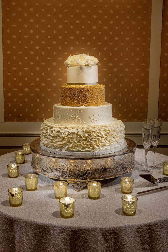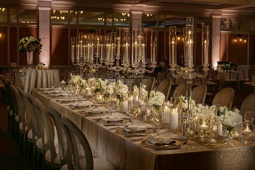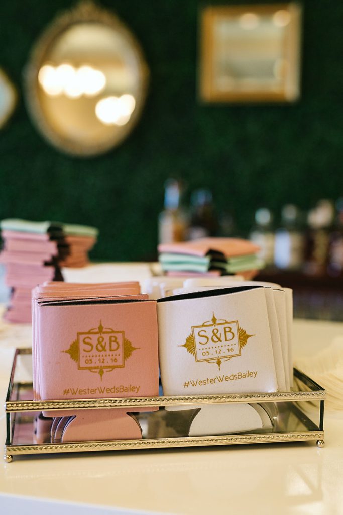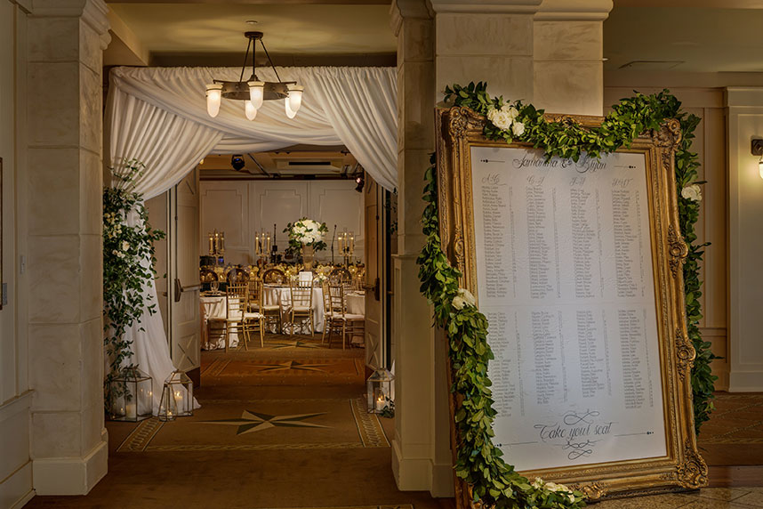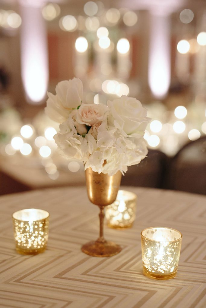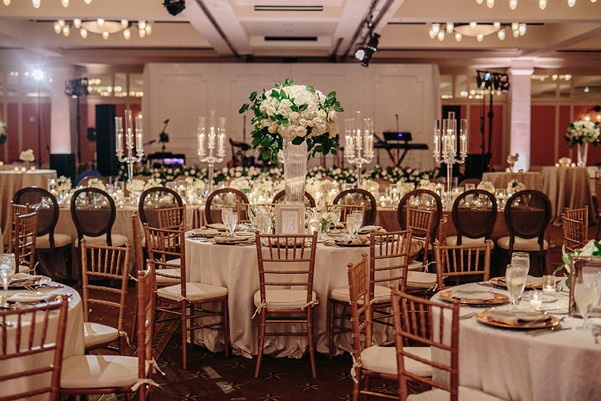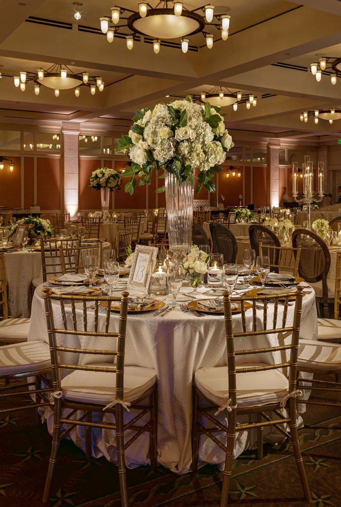 CONTEMPORARY ENGLISH GARDEN: Samantha is an interior designer and wanted all aspects, including linens, décor, lighting and florals, to feel as though they were selected using contemporary patterned linens and place settings. They also incorporated Bryan’s geology background using agate slices as place settings and quartz décor. They wanted guests to see their touch in each aspect of the design. Samantha used hues of white, gold and green to achieve an English garden vibe.